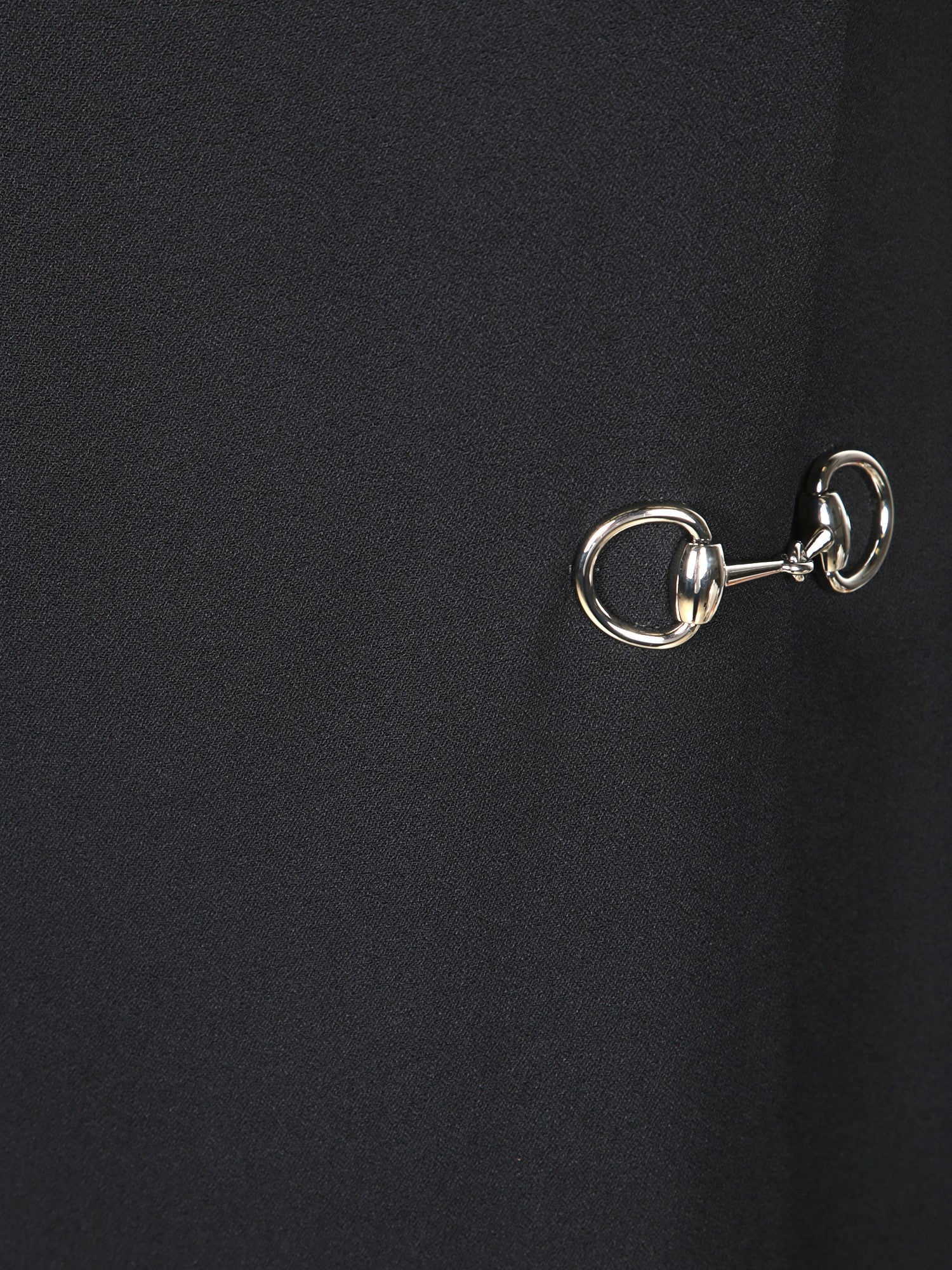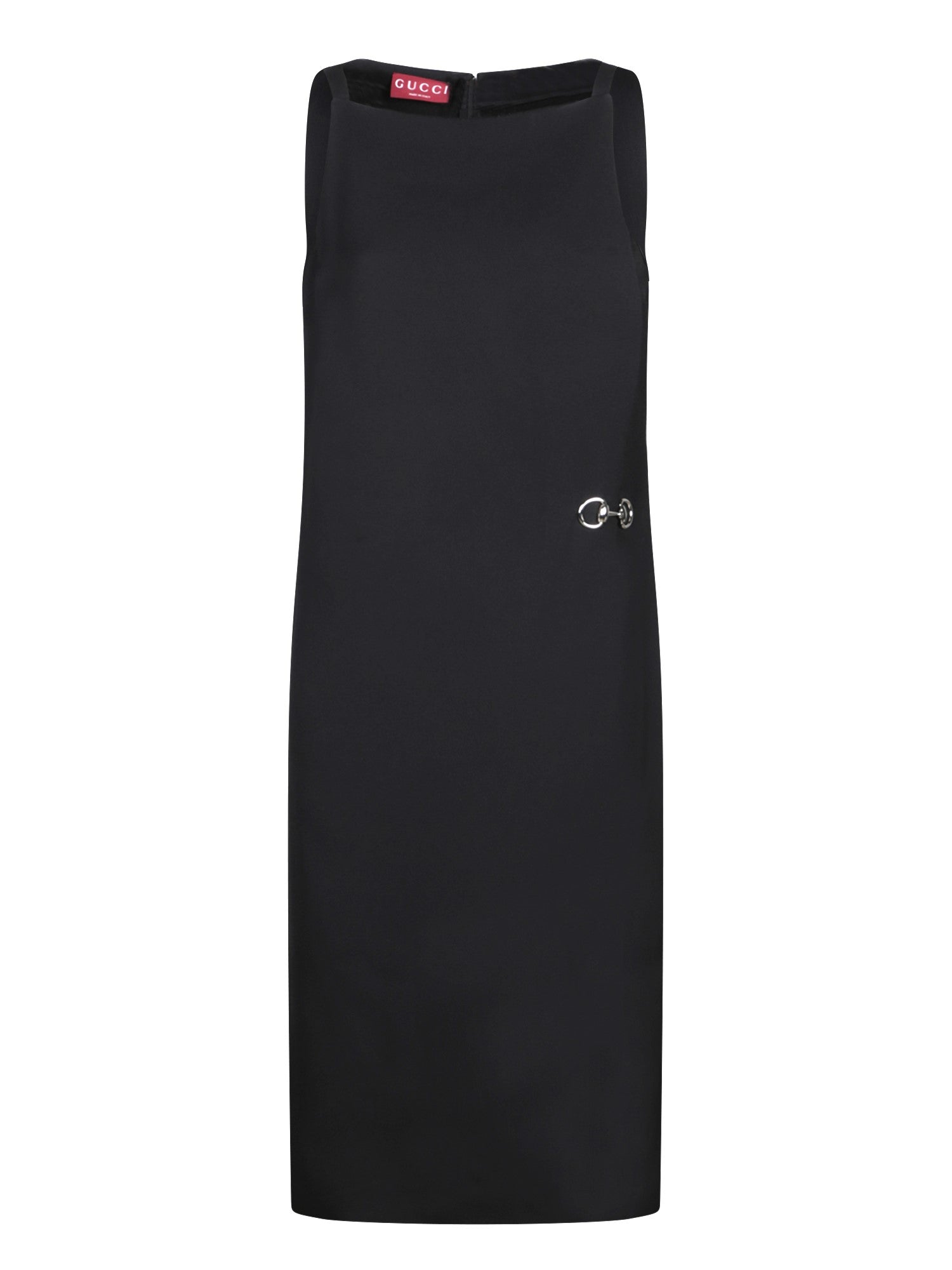 Elegant Gucci dress in classic black, featuring a square neckline and a distinctive silver buckle detail that adds a touch of modern sophistication.