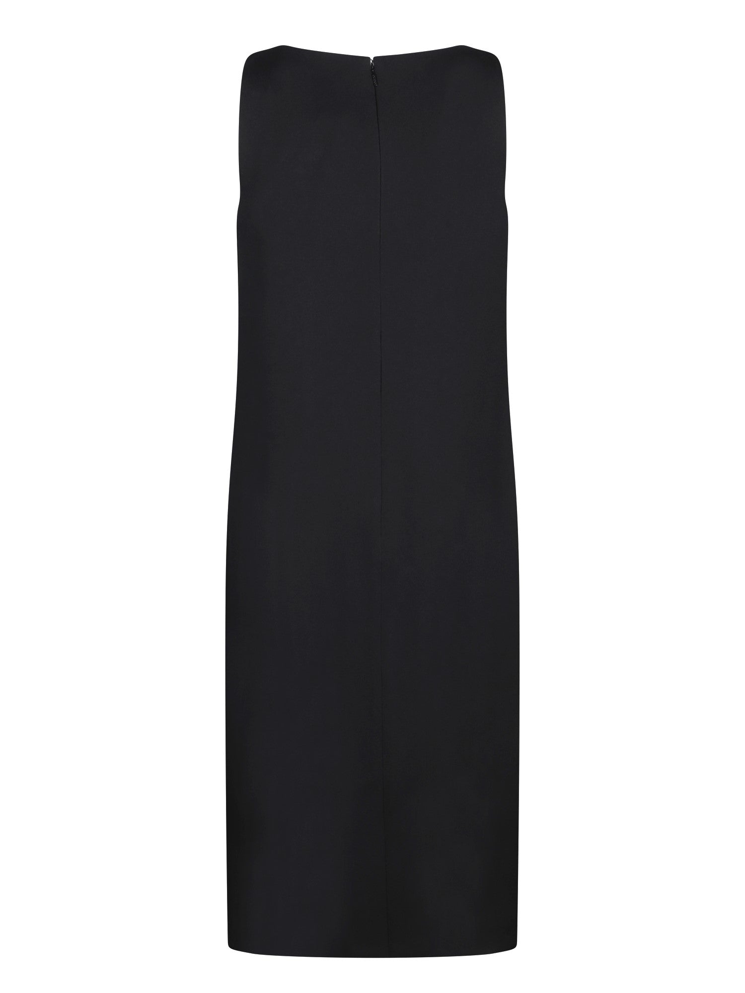 Sleeveless midi dress. Silver buckle detail. Square neckline.