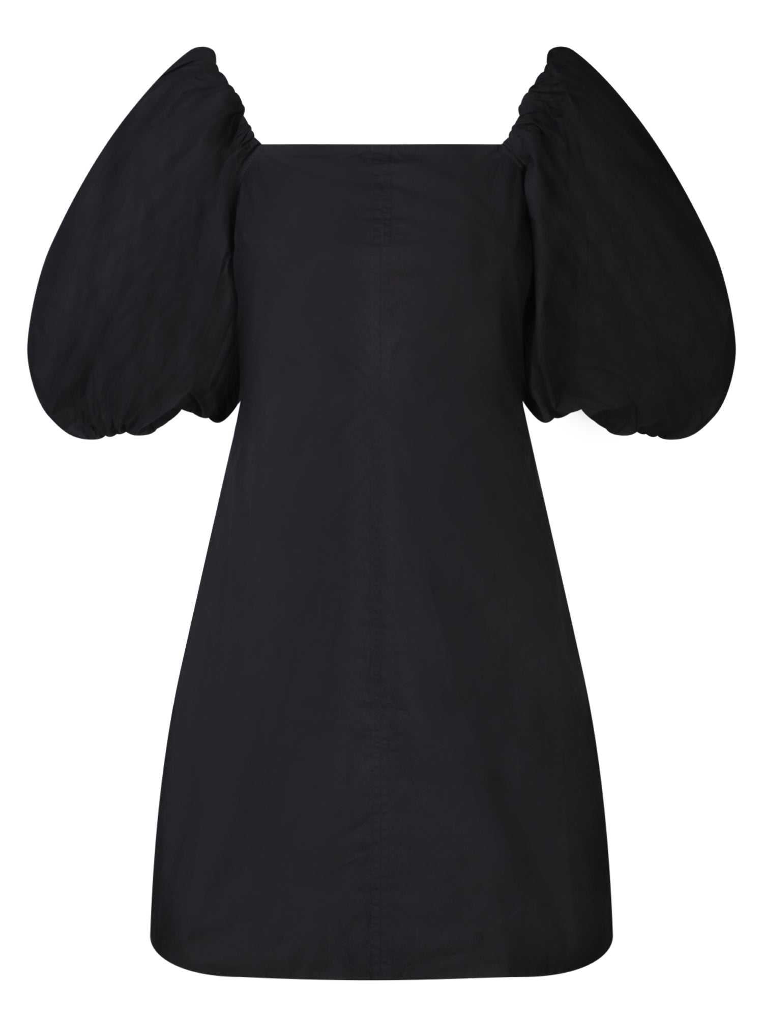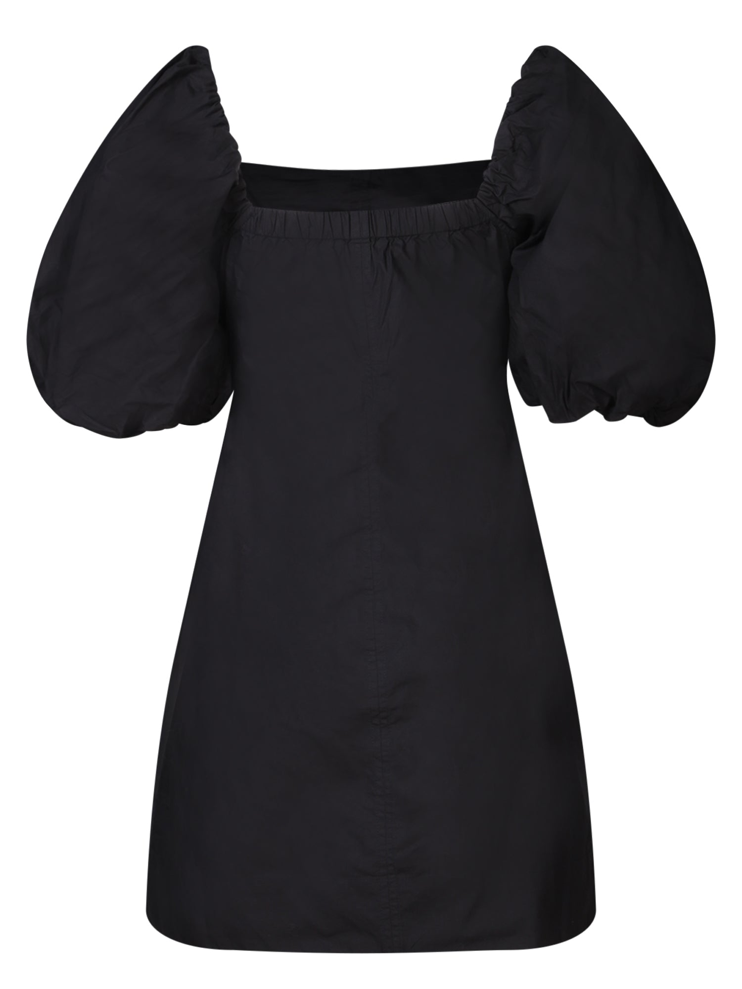 This Ganni black mini dress features a square neckline and puff sleeves that add a touch of modern elegance. The flared silhouette is flattering for various body types.