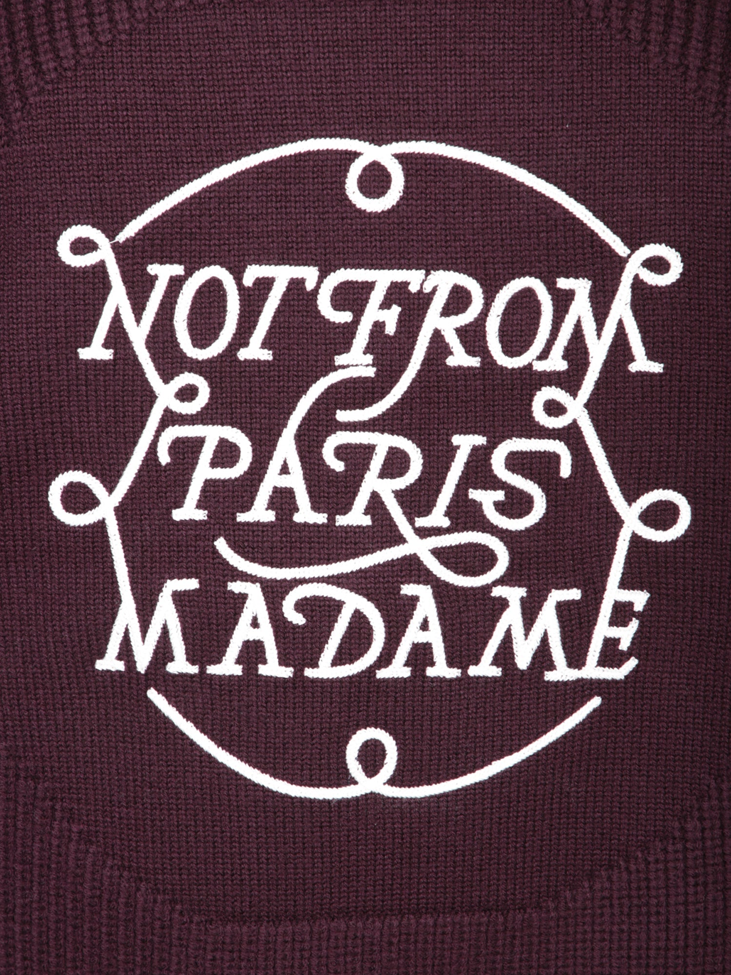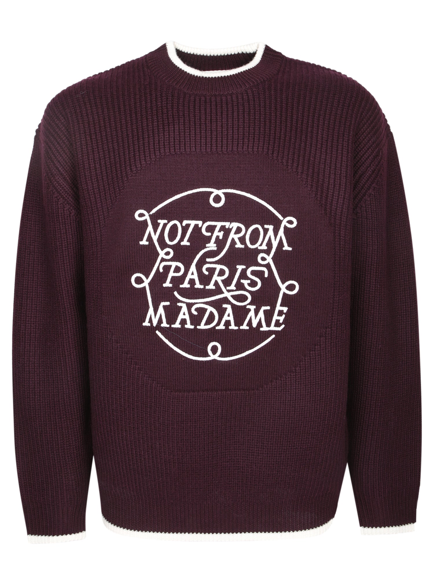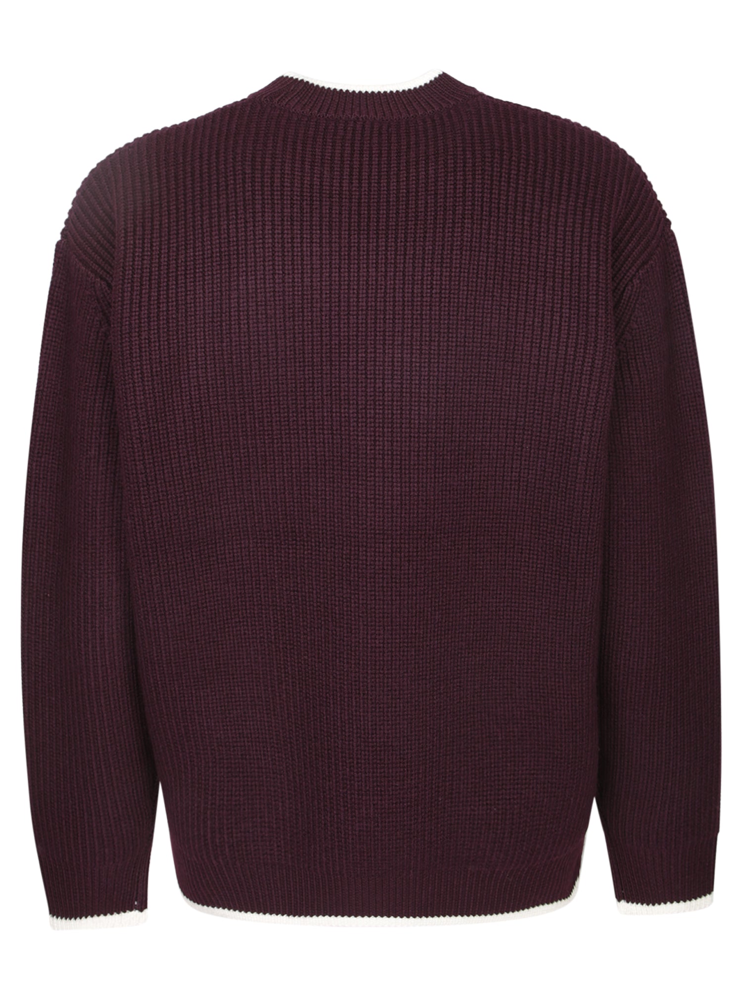 Knitted long-sleeve sweater. Ribbed contrasting white neckline, cuffs, and hem. Central graphic print.