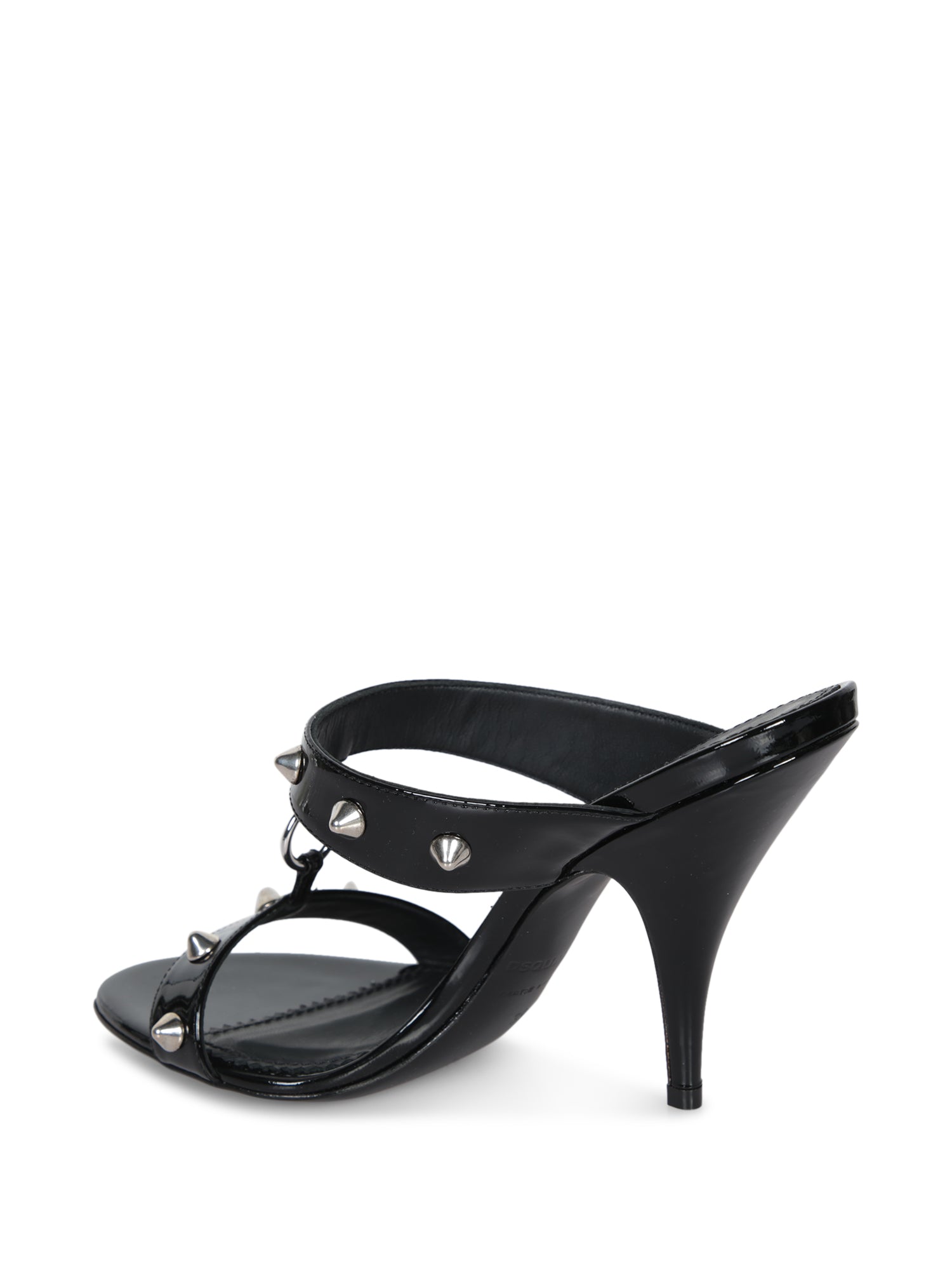 Glossy patent leather material. Studded embellishments. High stiletto heel.