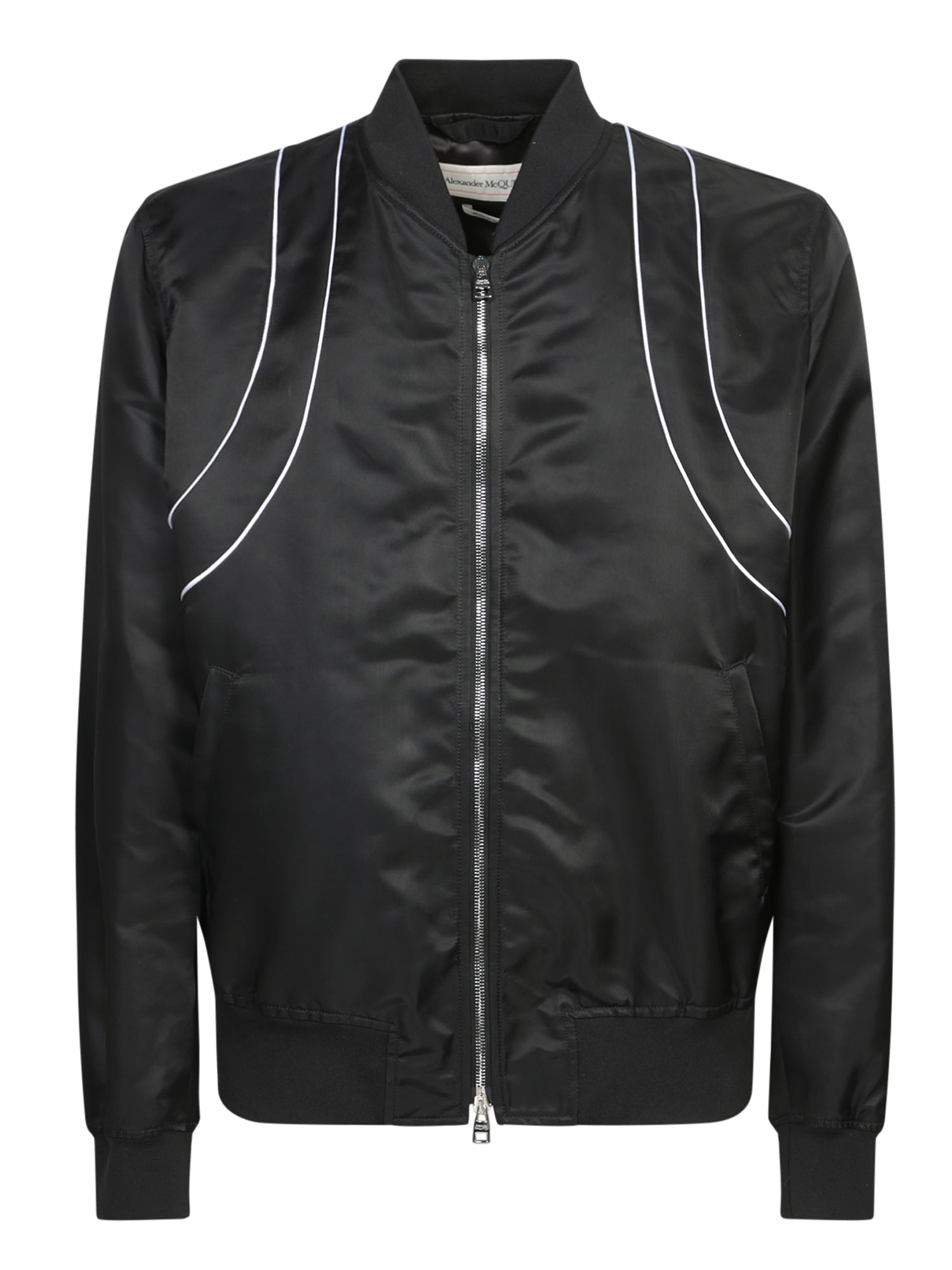 Crafted by the prestigious fashion house Alexander McQueen, this black bomber jacket stands out with its elegant white trims and practical zip closure, offering a perfect blend of style and functionality.