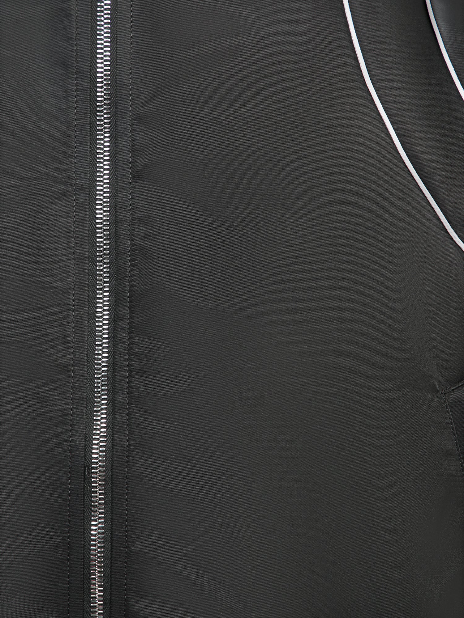 Black technical fabric bomber jacket. White contrasting trims along the sleeves. Front zip closure.