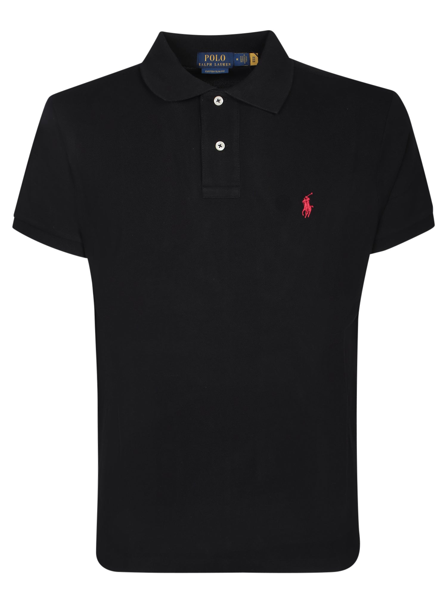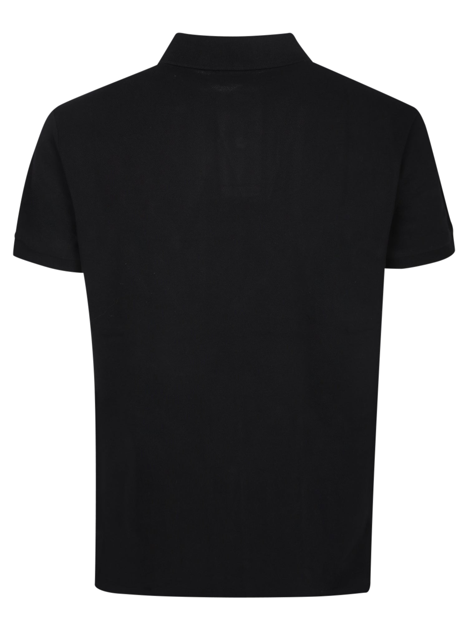 Short sleeve polo shirt. Black color with an embroidered logo on the left chest side. Two-button placket.