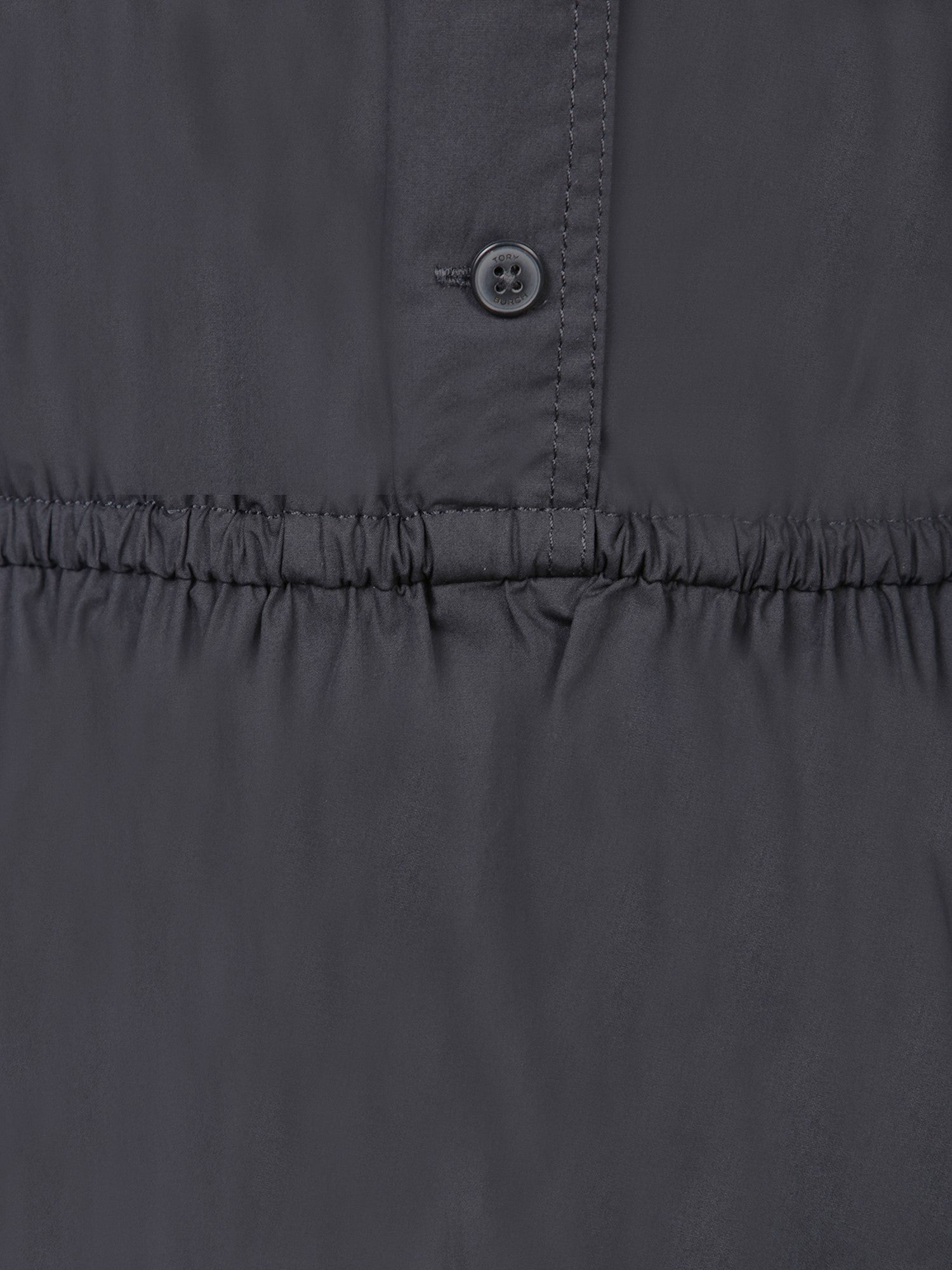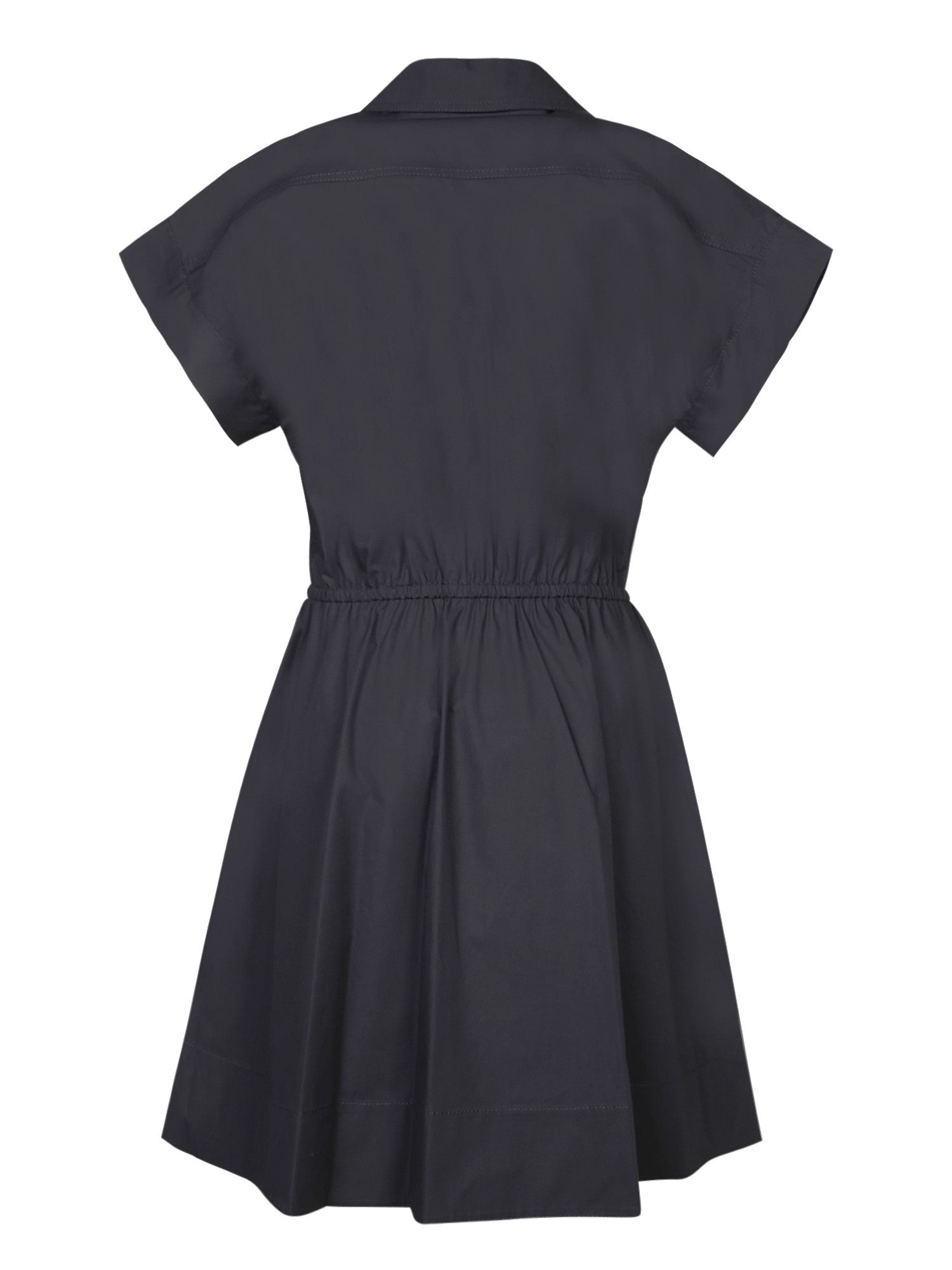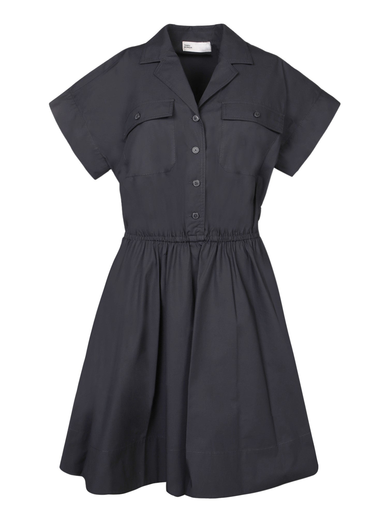 Short-sleeved dress with a classic collar and button front closure. Features flap pockets and an elastic waistband.