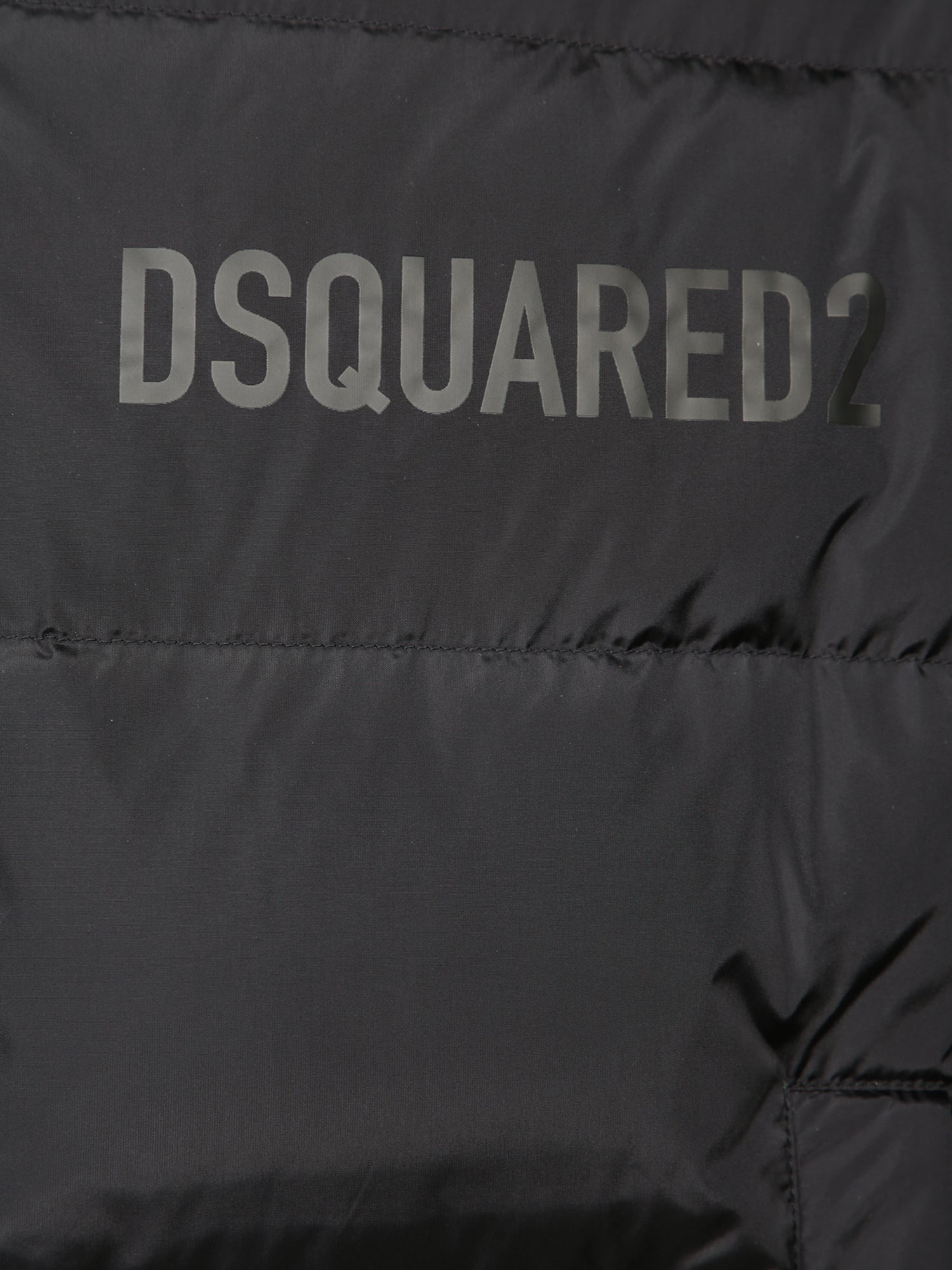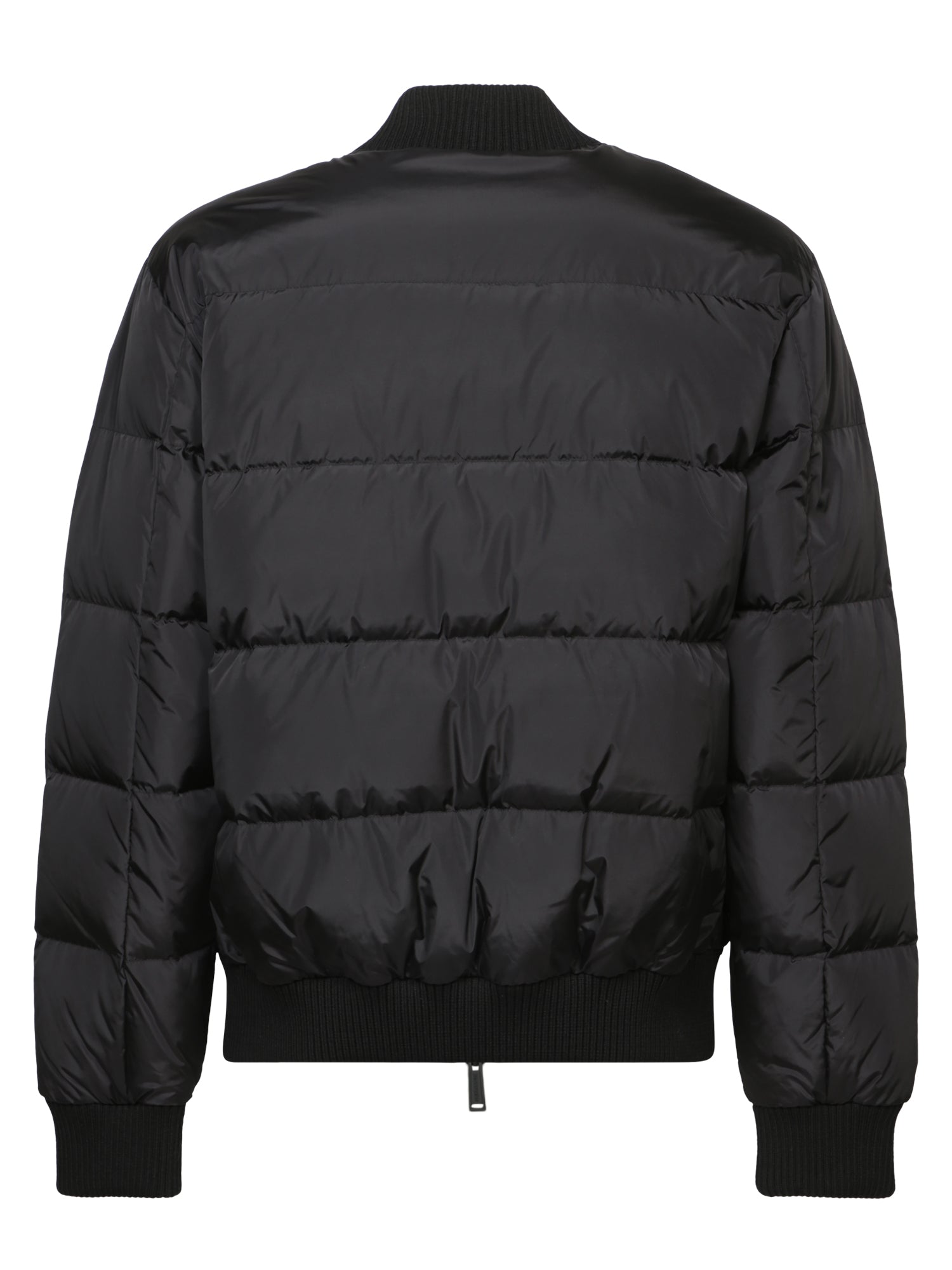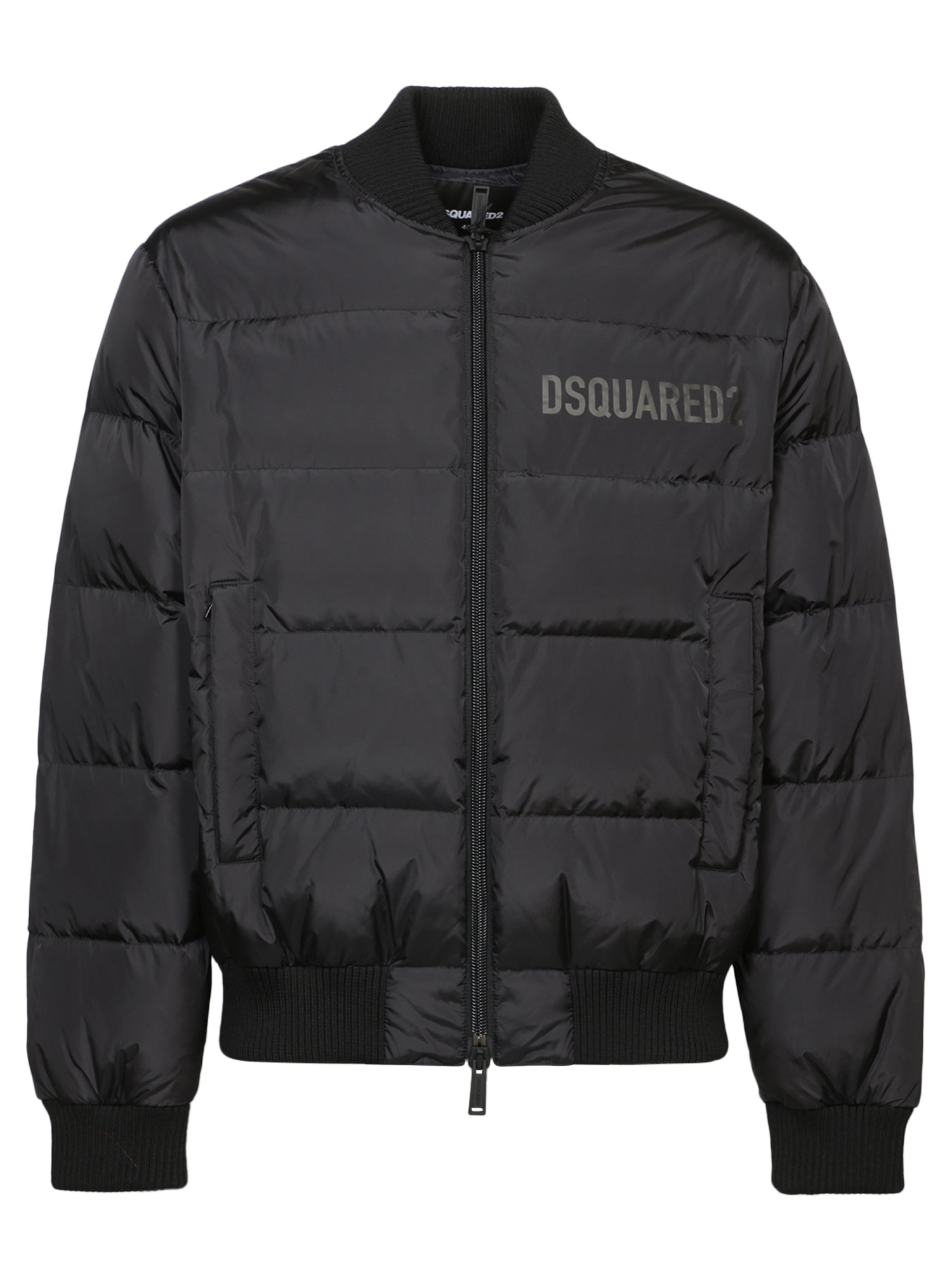 Black quilted bomber jacket with Dsquared2 logo on the front. Rib-knit cuffs, collar, and hem. Front zip closure.