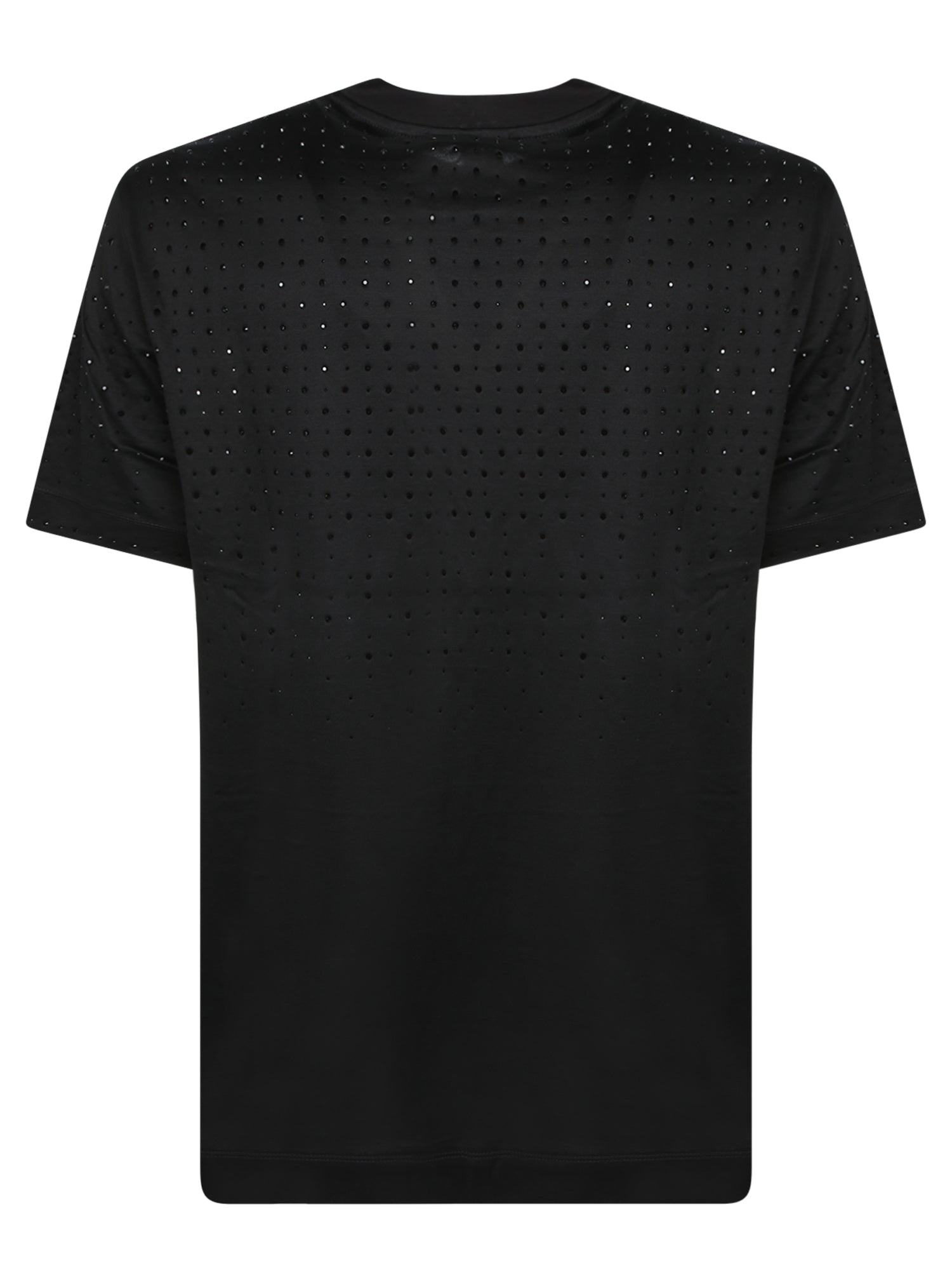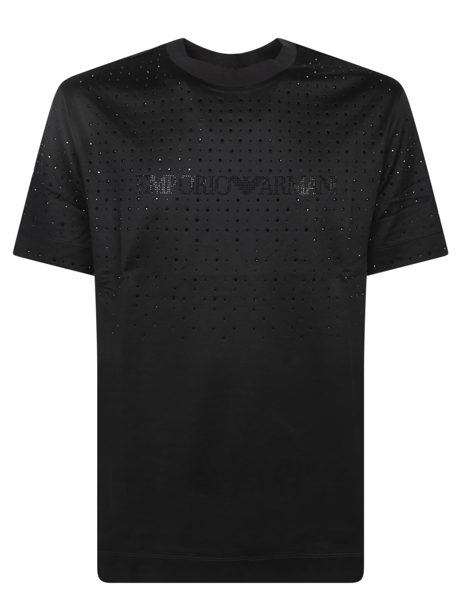 Black short-sleeved t-shirt. Emporio Armani rhinestone logo. Perforated fabric.