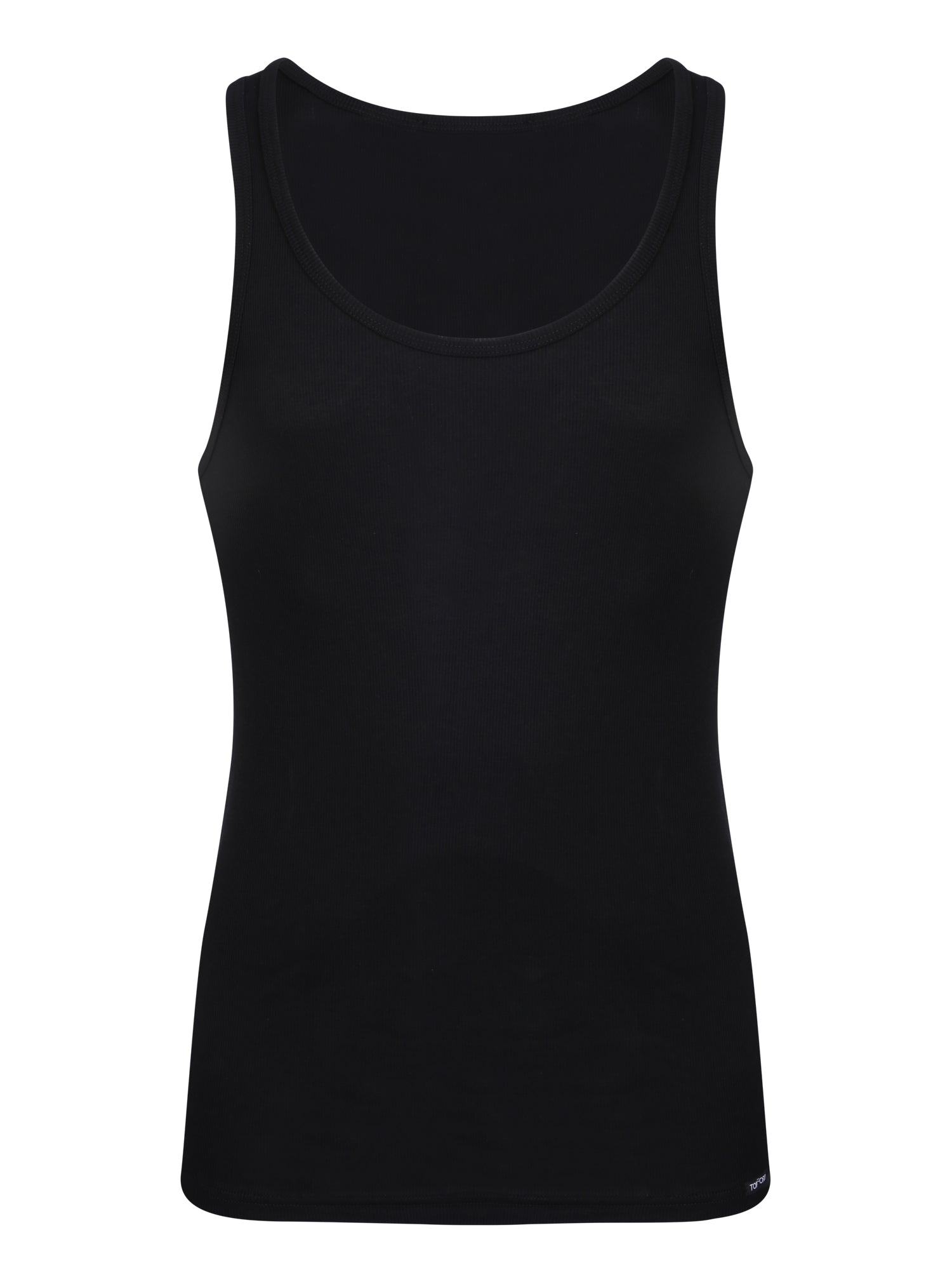 Deep neckline. Sleeveless. Thin shoulders. Ribbed knit. Straight hem. Color: black