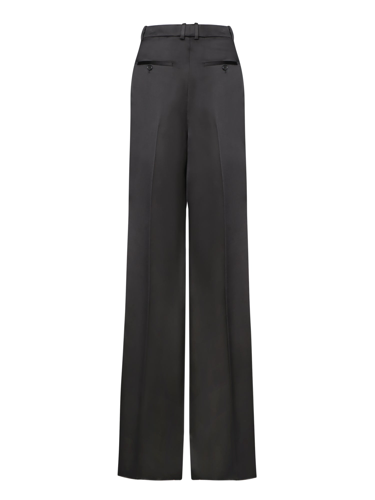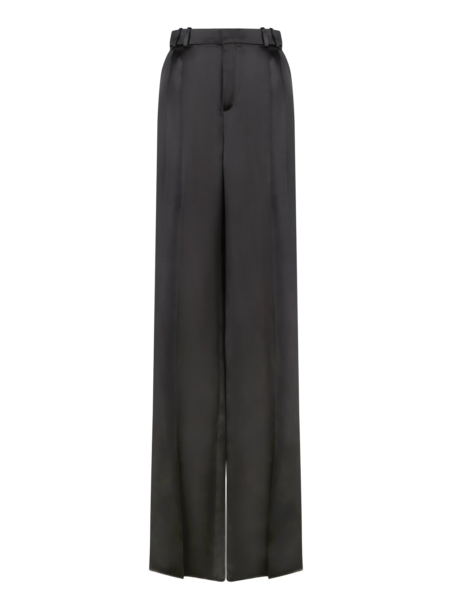 Wide black satin trousers featuring an integrated belt and front pleats.