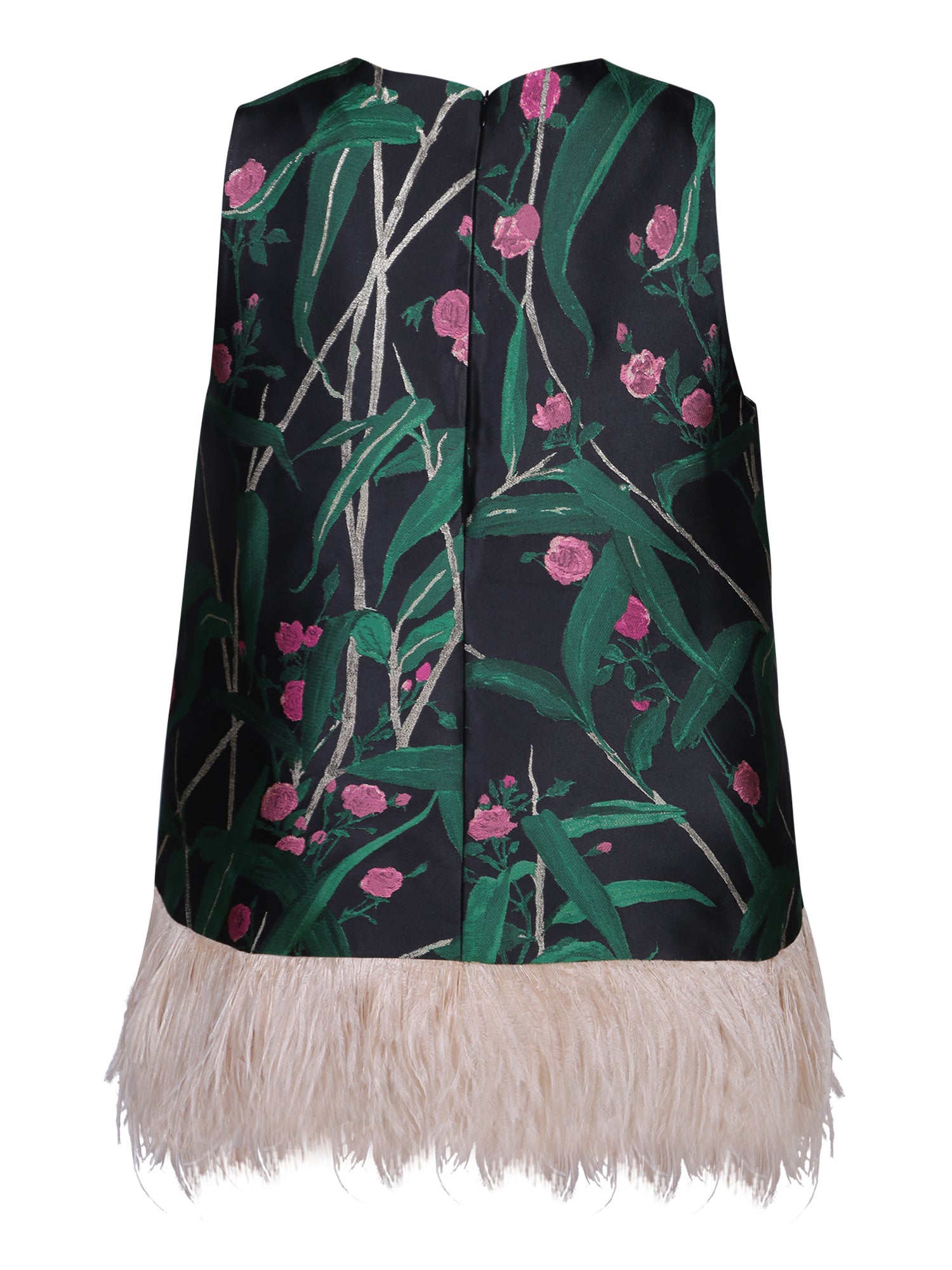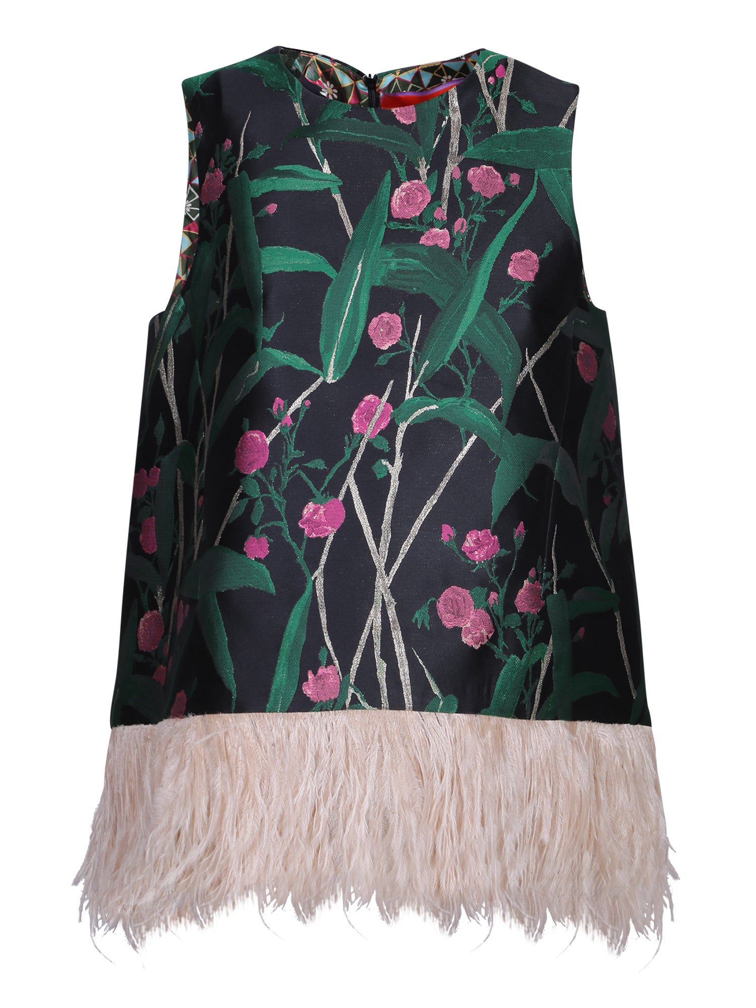Sleeveless top. Jacquard fabric. Fringed hem.