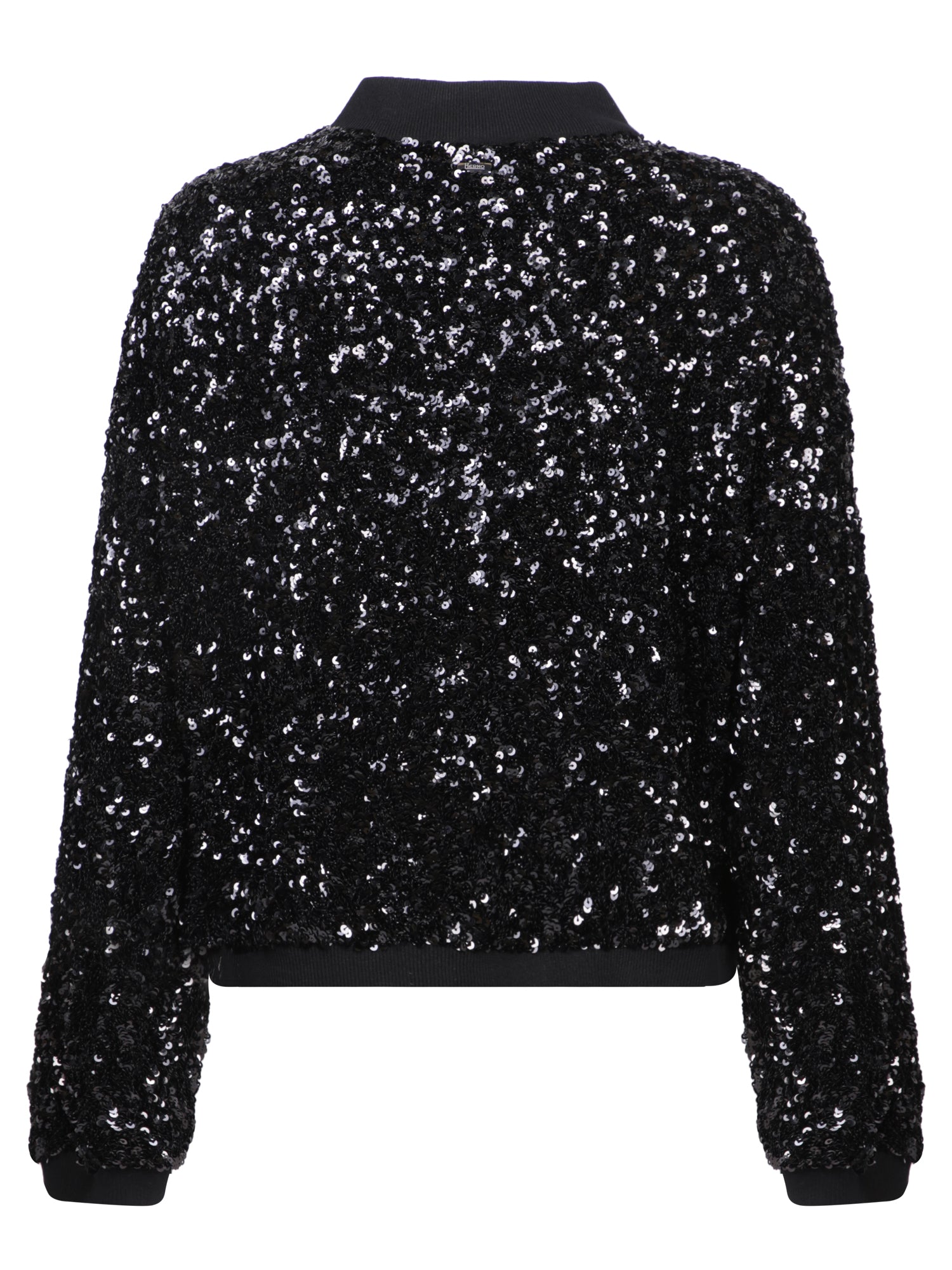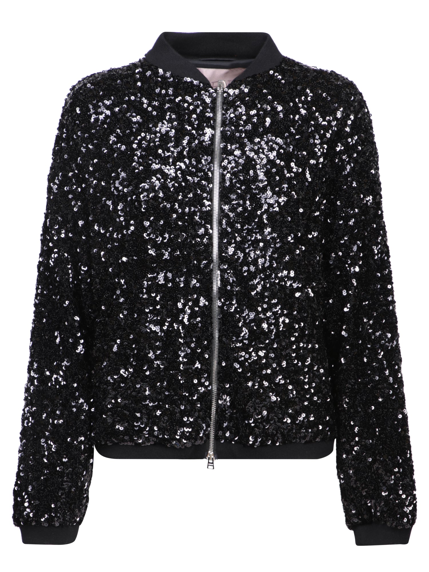 Sequin-covered bomber. Front zip closure. Ribbed collar, cuffs, and hem.