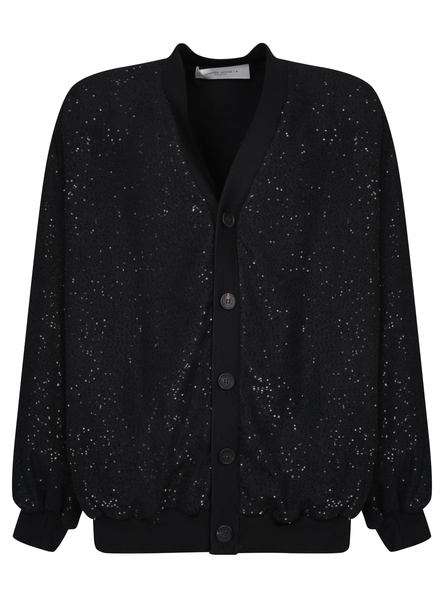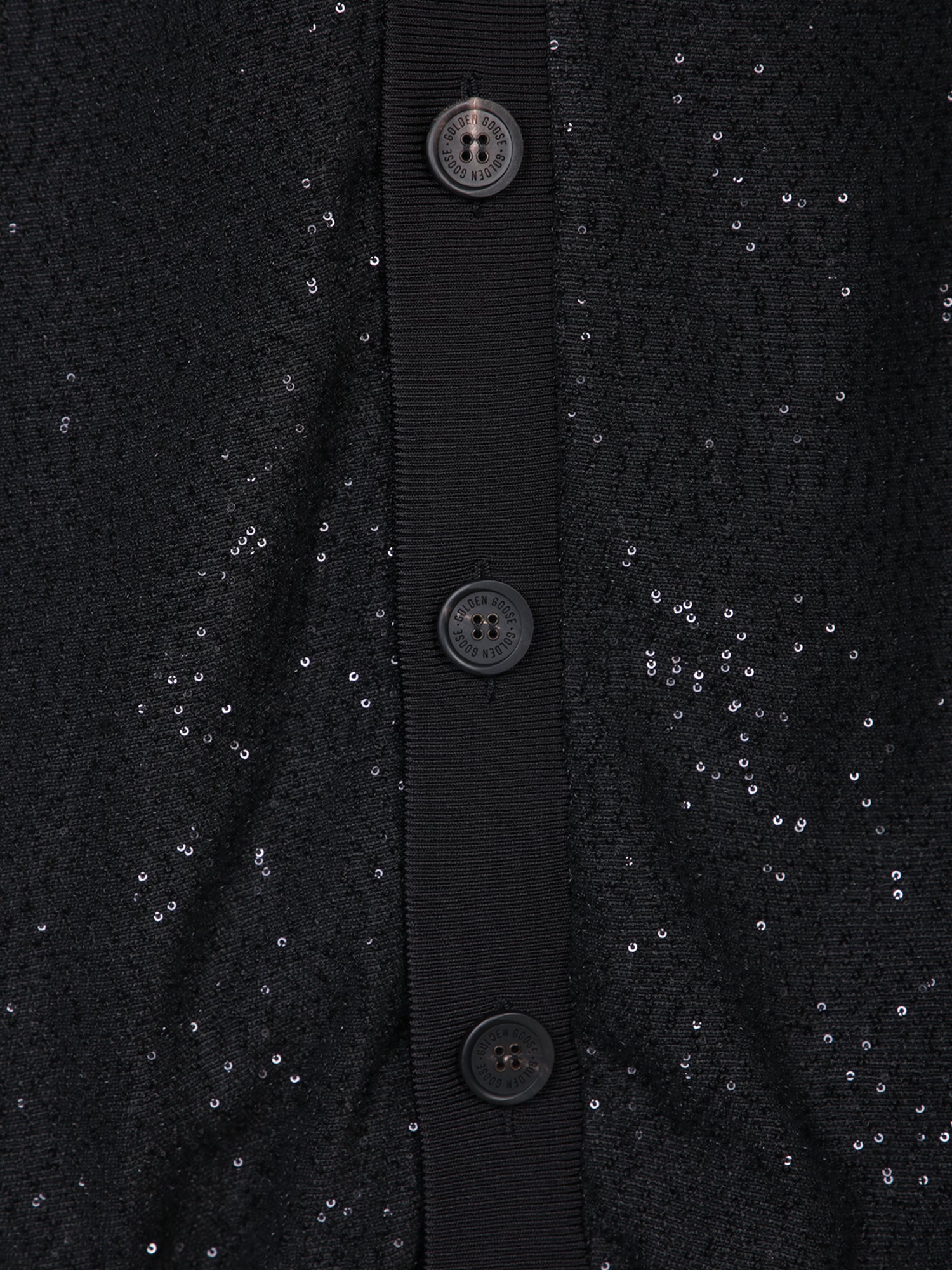 Long-sleeve cardigan. All-over sequins. Front button closure.