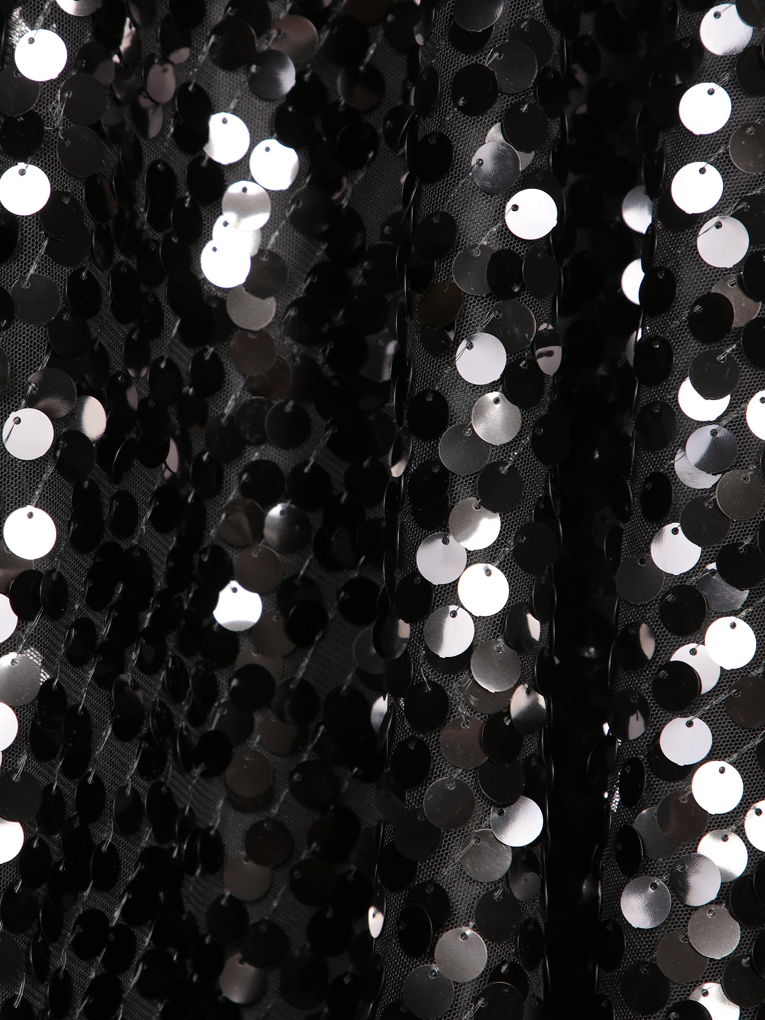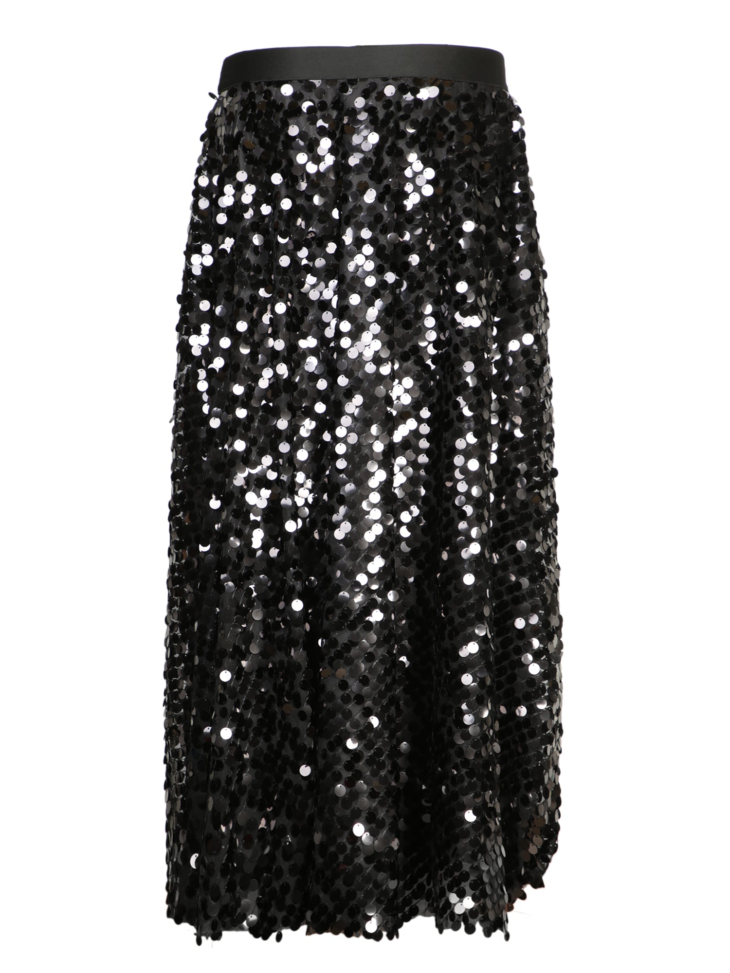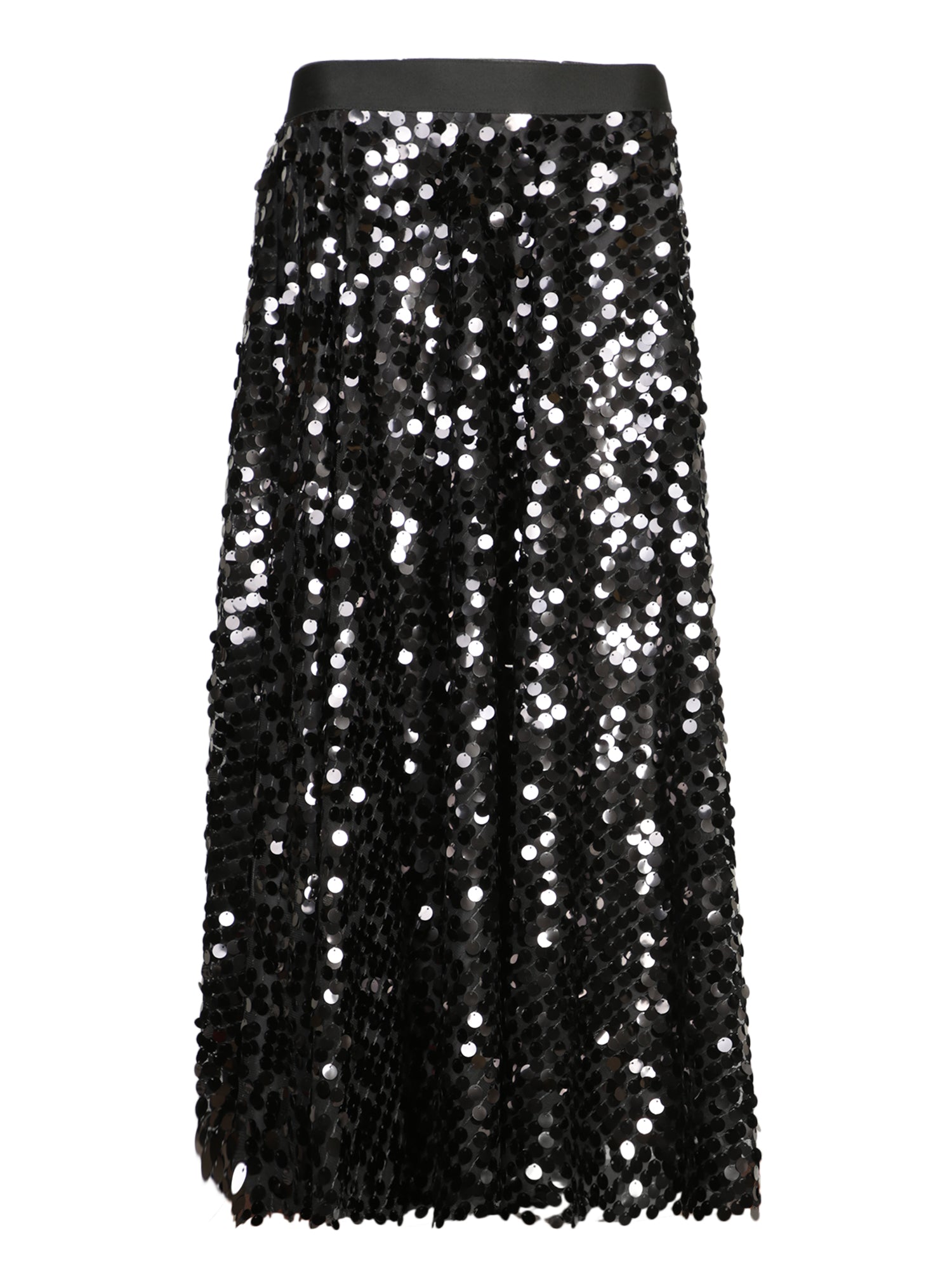 This Blanca Vita black skirt captivates with its sparkling sequins, perfect for elegant evenings. Its straight cut and medium length provide comfort and versatility.