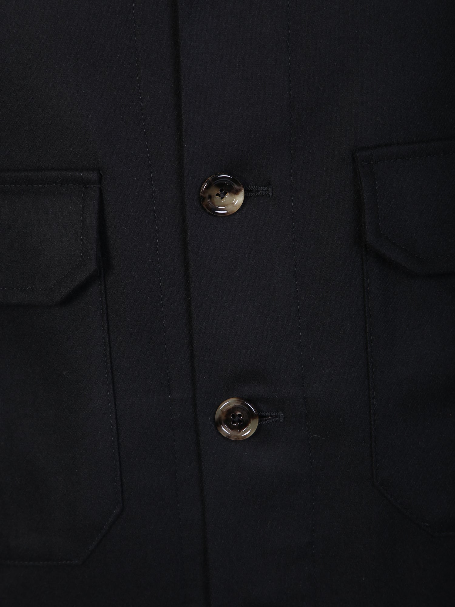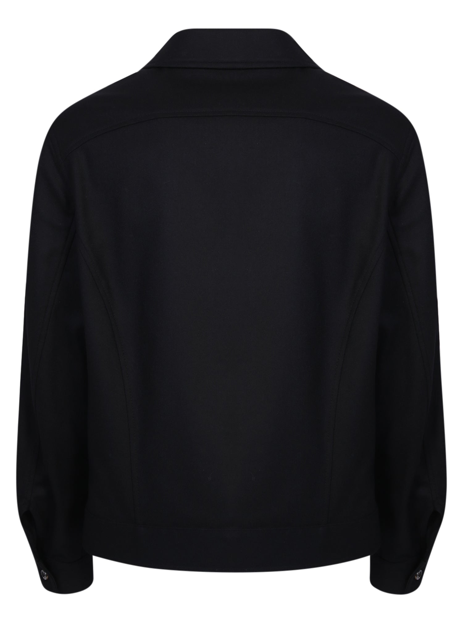 Classic collar. Front button fastening. Long sleeves. Buttoned cuffs. Two front patch pockets. Straight hem. Color: black