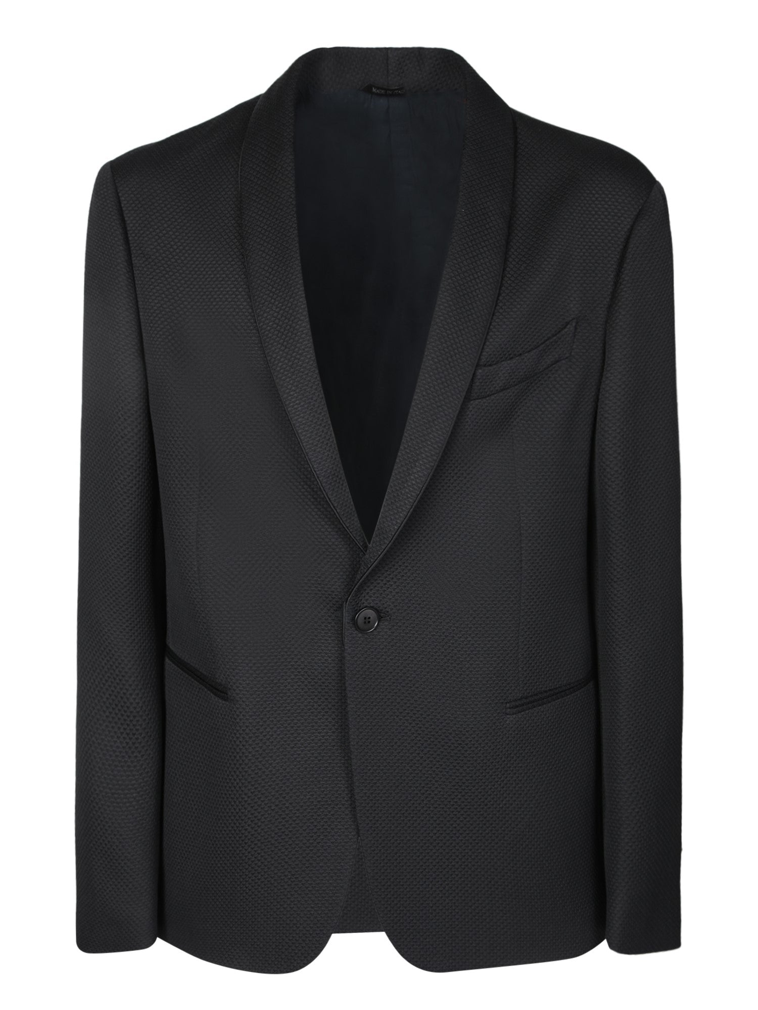 Tackle every special occasion with this elegant Giorgio Armani tuxedo jacket. Crafted in refined black silk with a microstructure detail, it features an impeccable design with a shawl collar and minimalist closure.