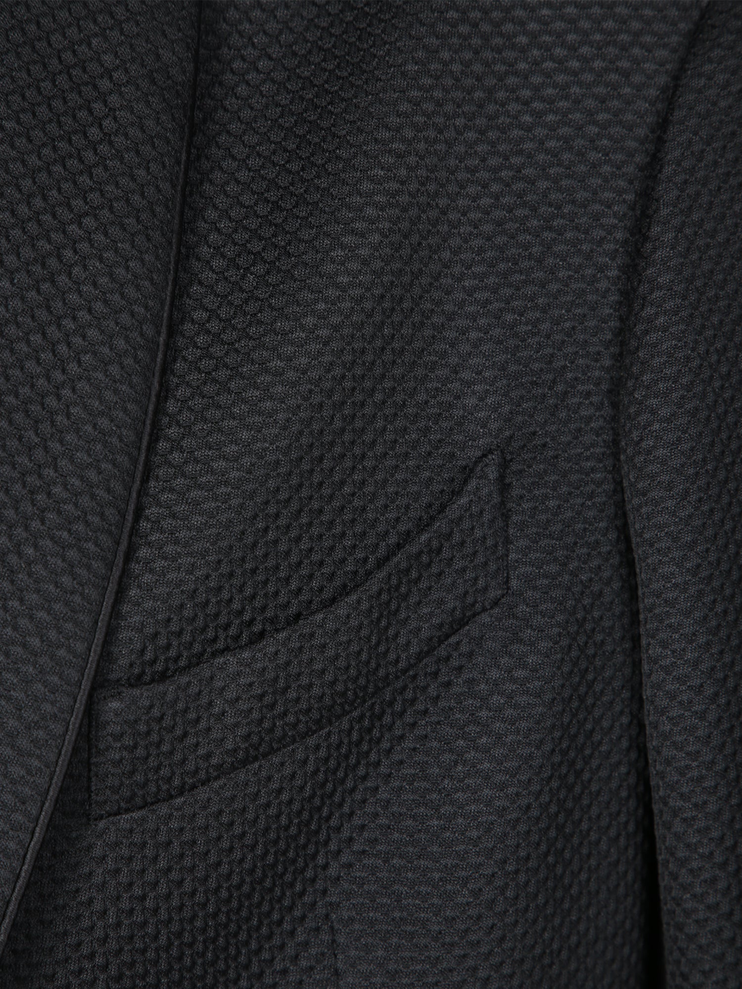 Single-breasted silk jacket with a microstructure. Shawl collar, chest patch pocket, single button closure.
