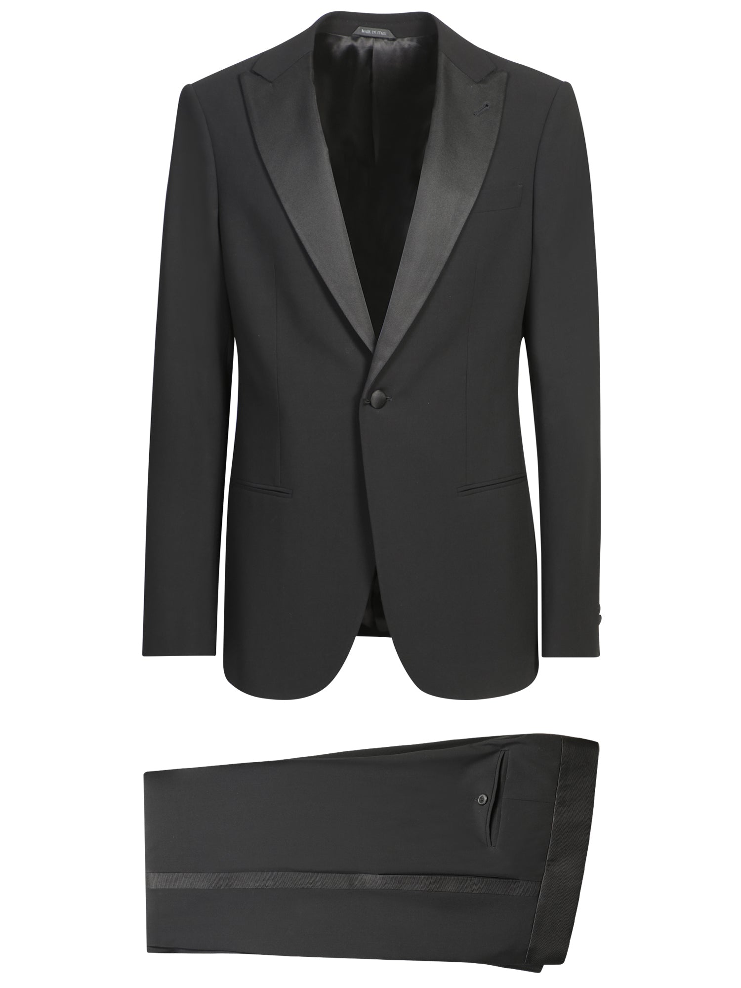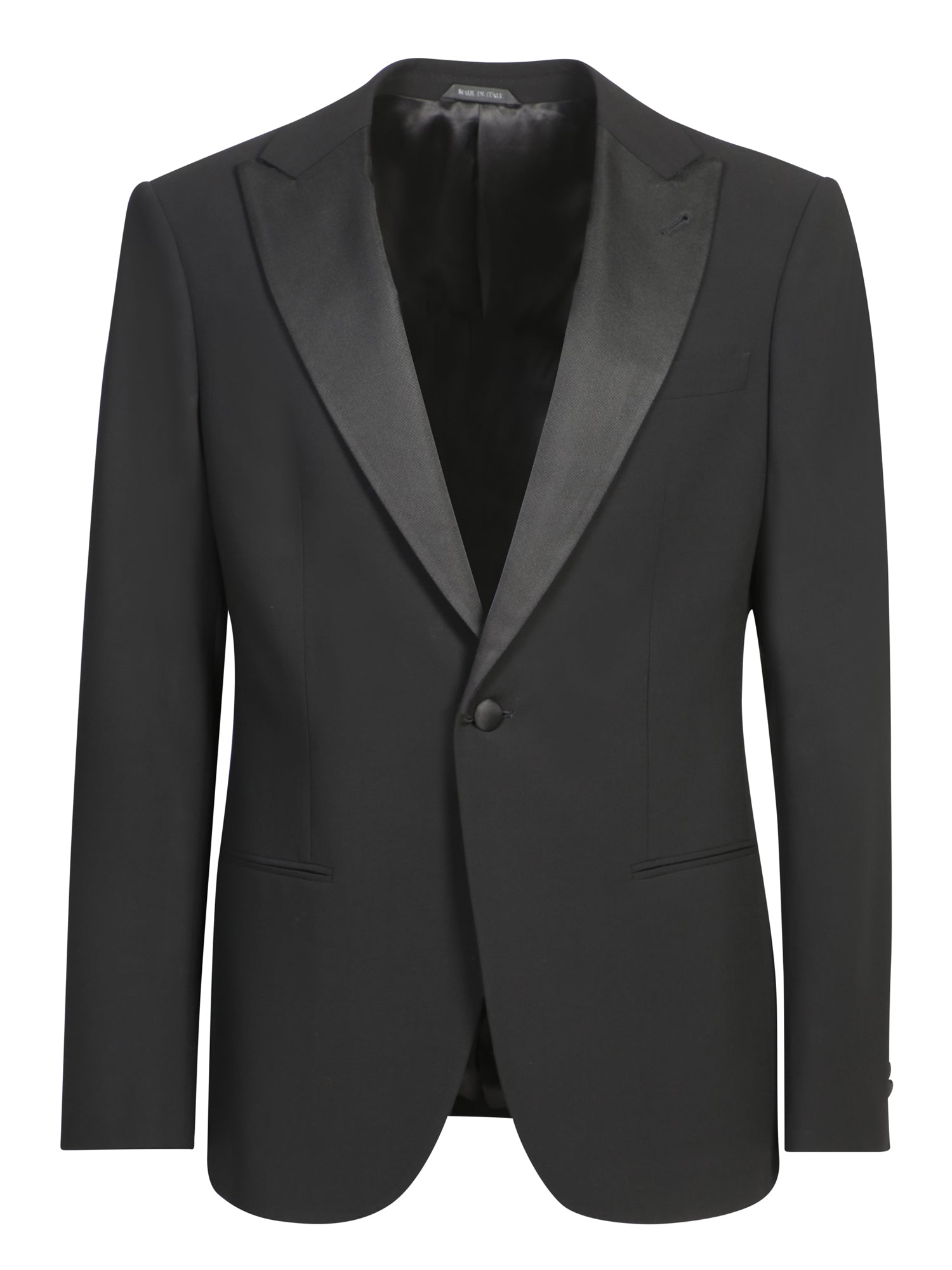 Timeless elegance for formal occasions, this Giorgio Armani black tuxedo features a sleek design with refined finishes and high-quality fabric.