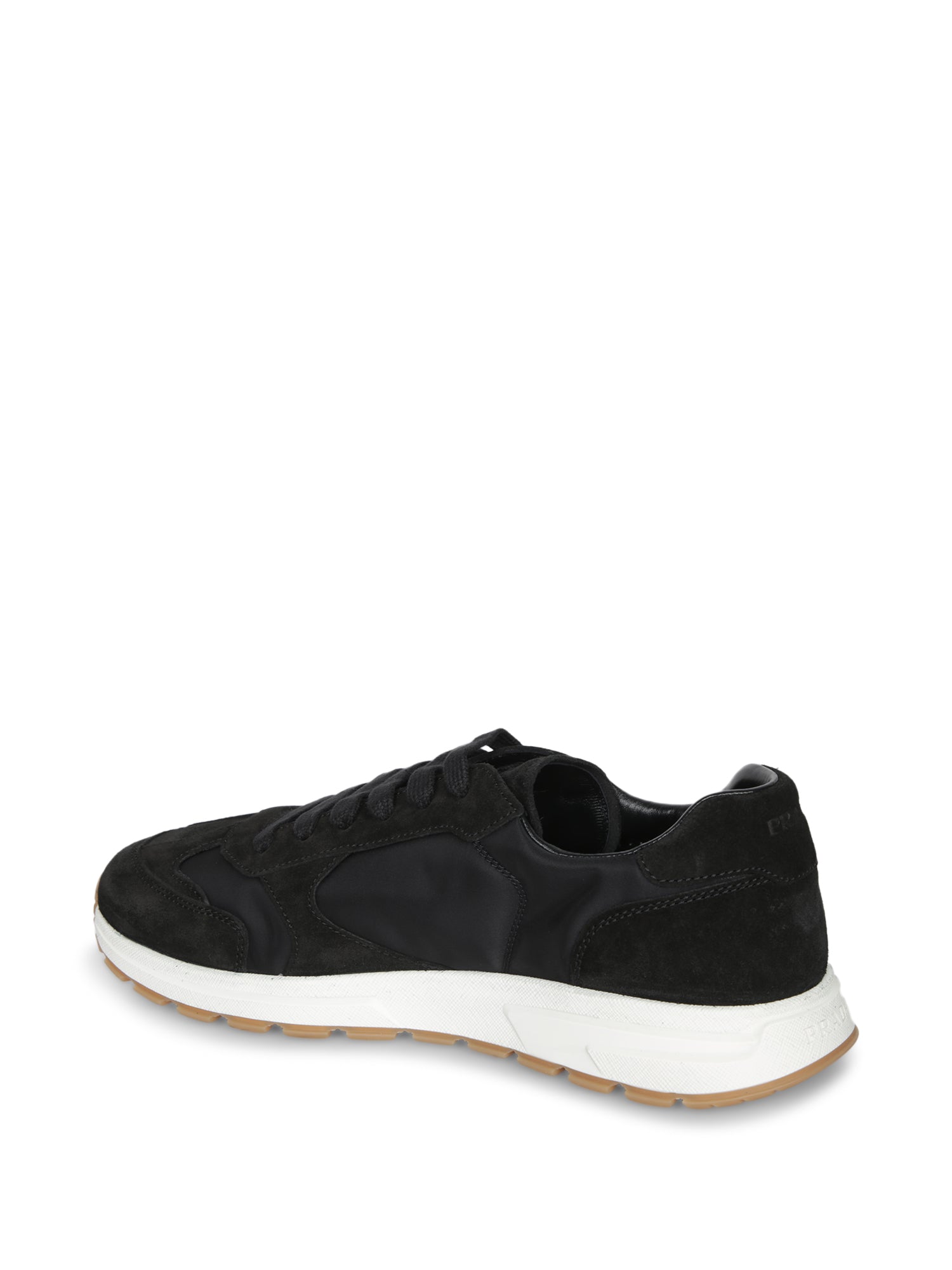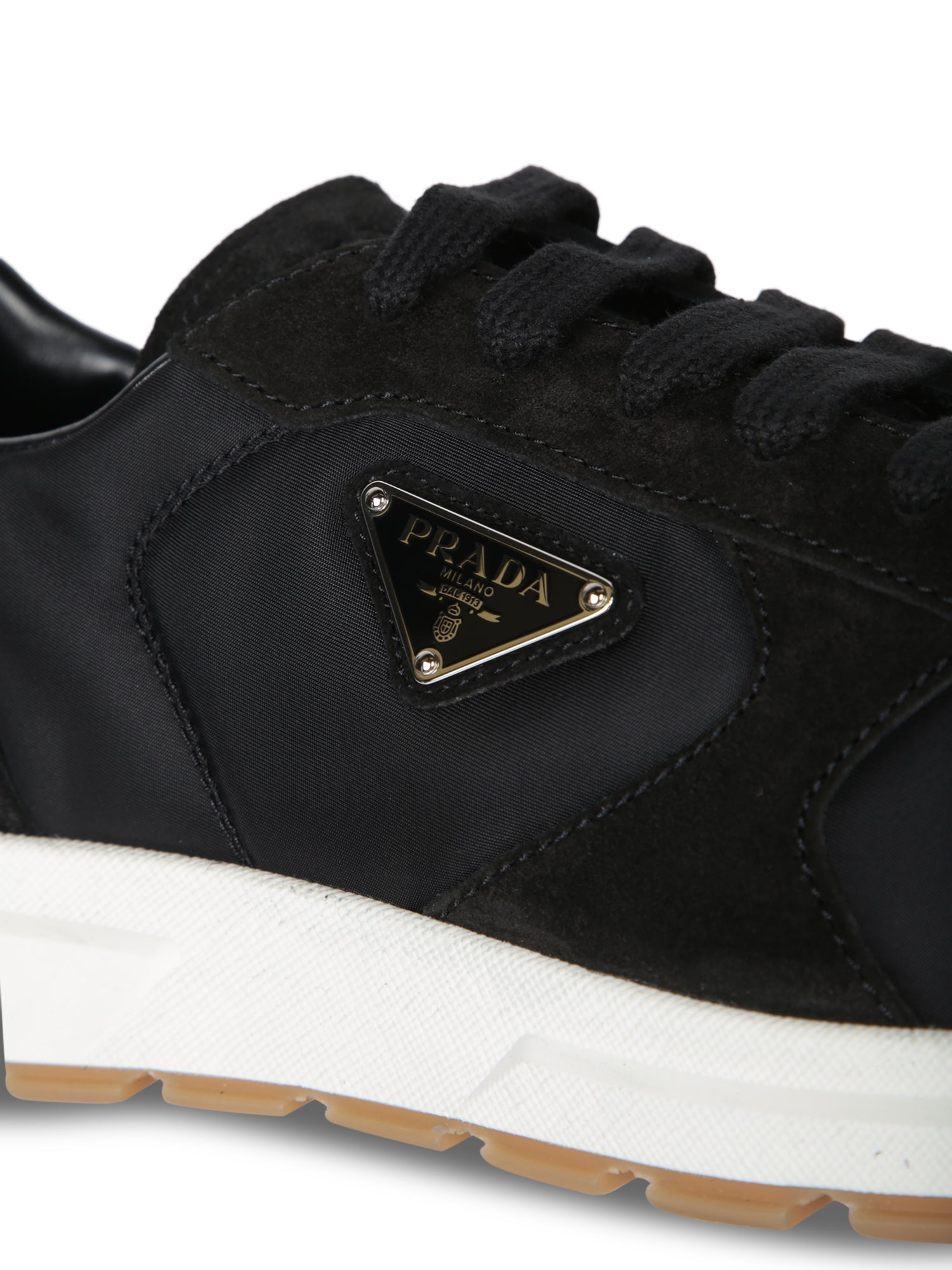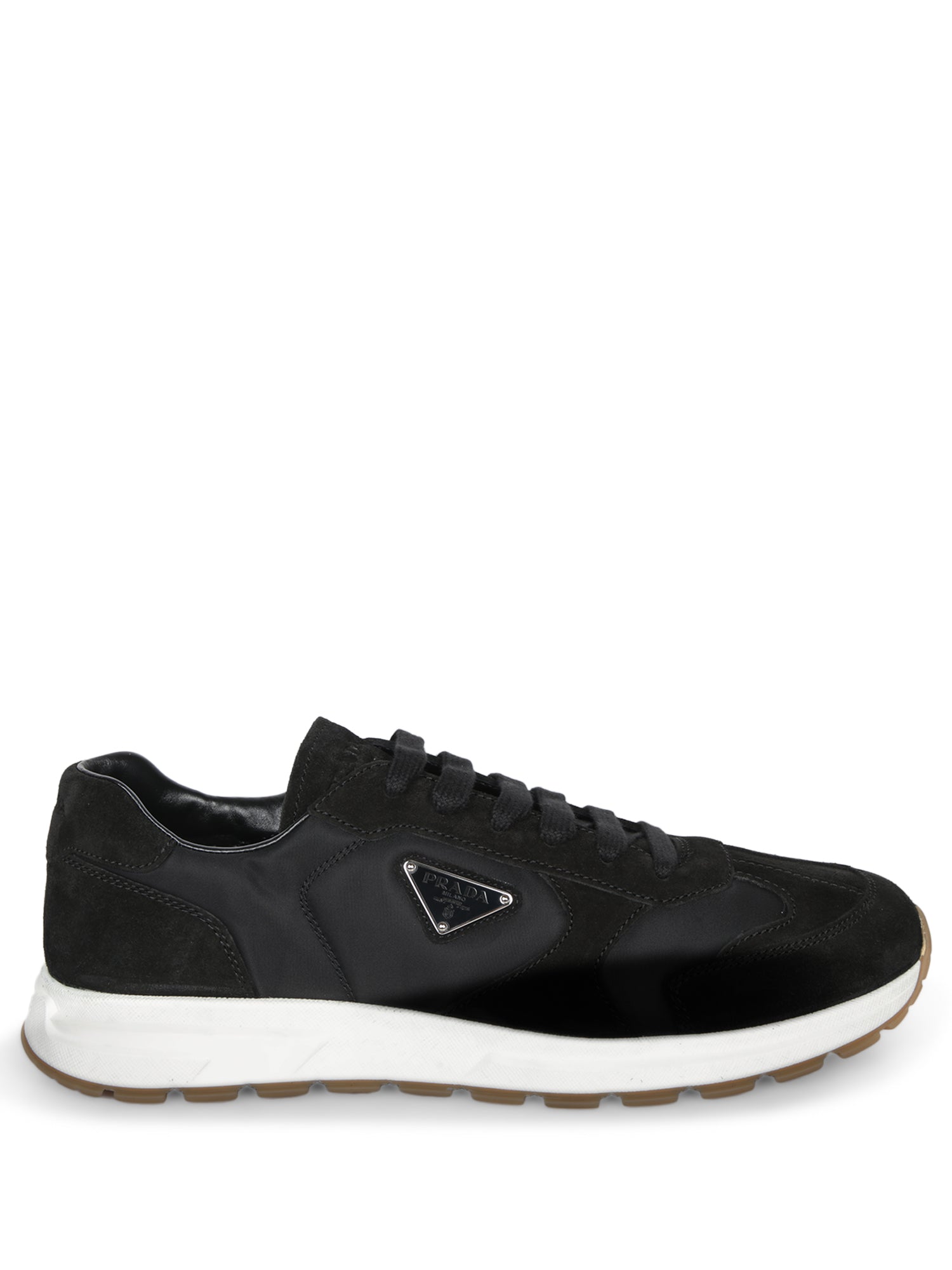 Black suede sneakers with nylon details. Metal triangle Prada logo on the side. Two-tone rubber sole.