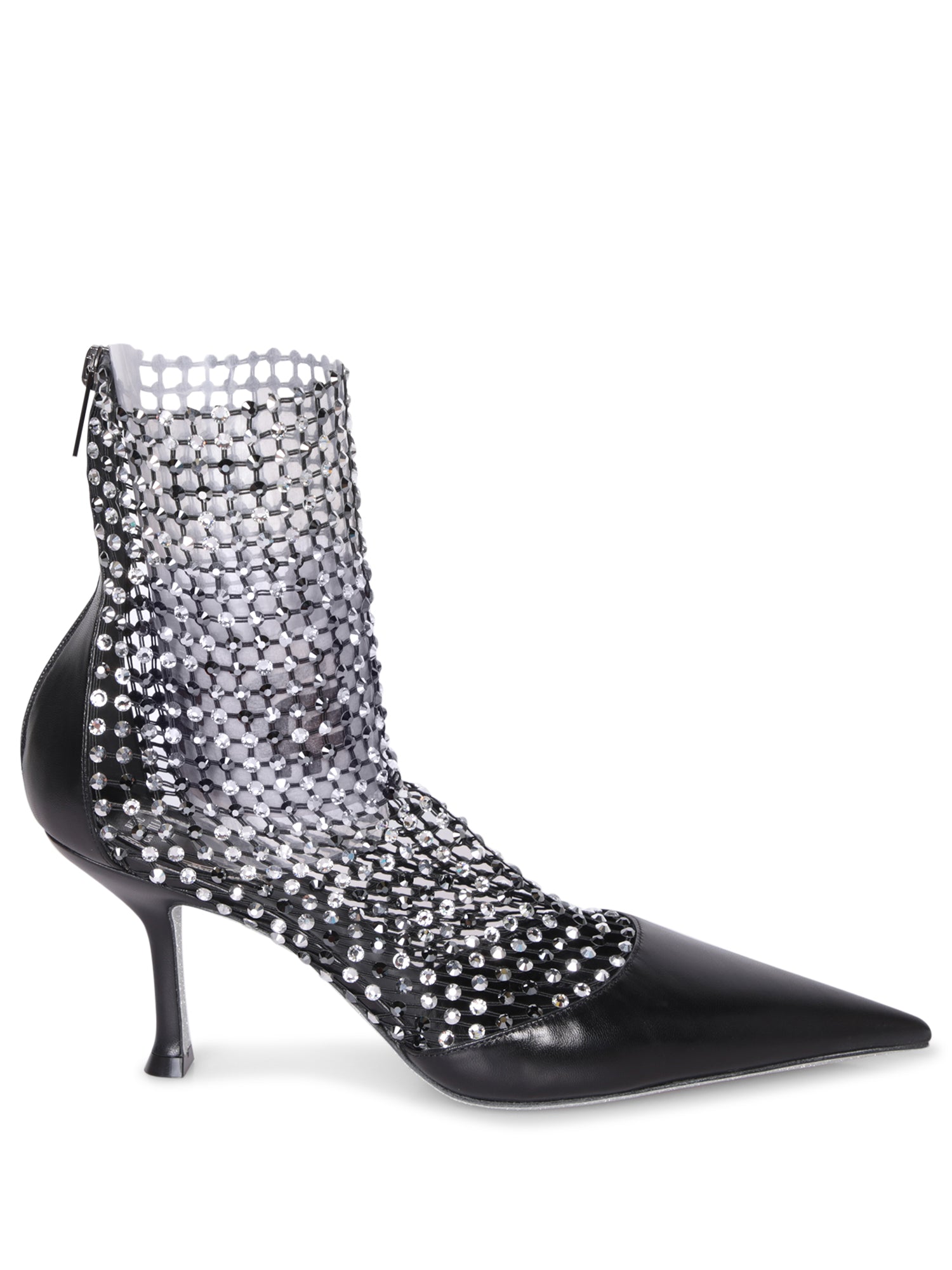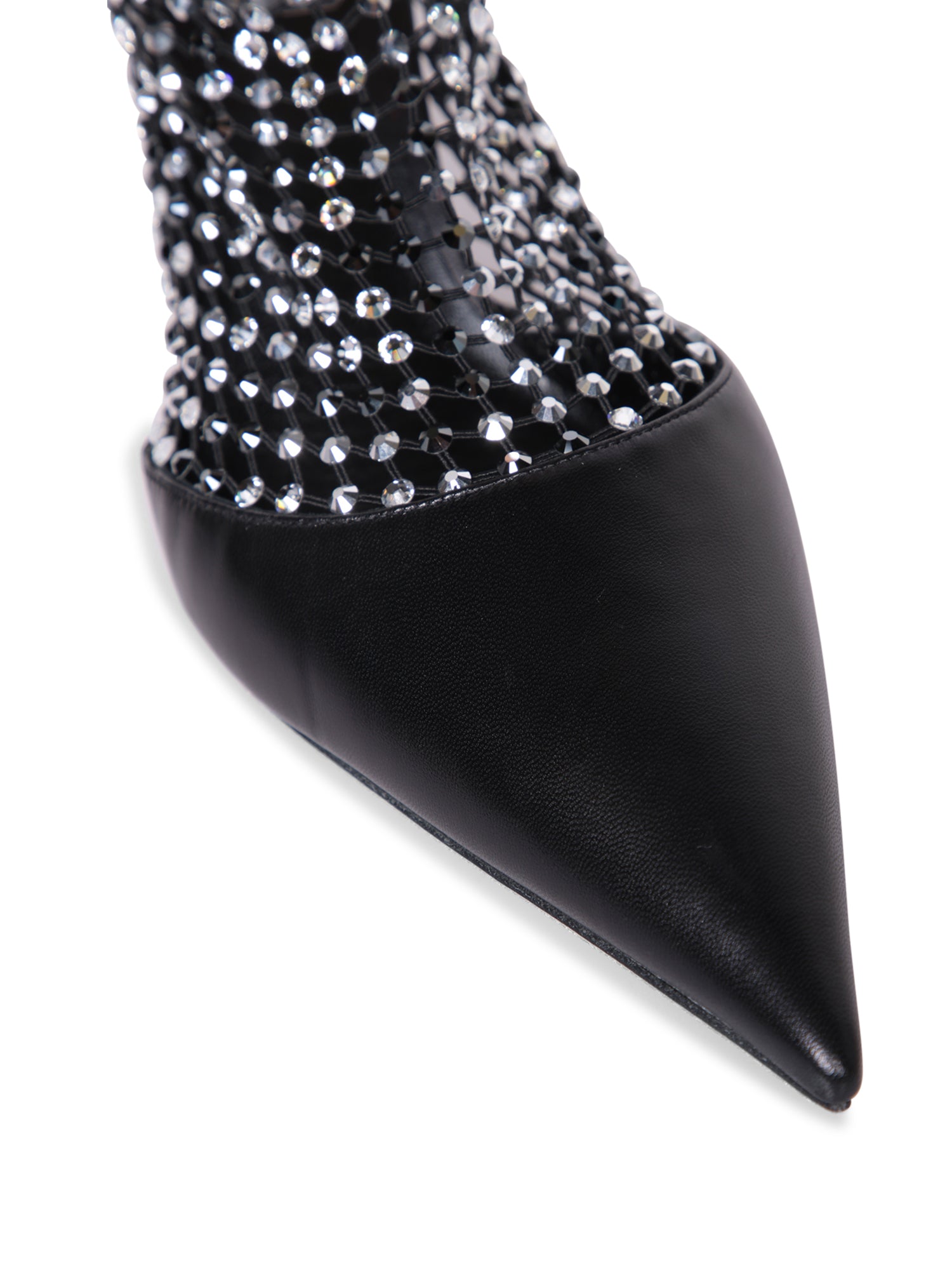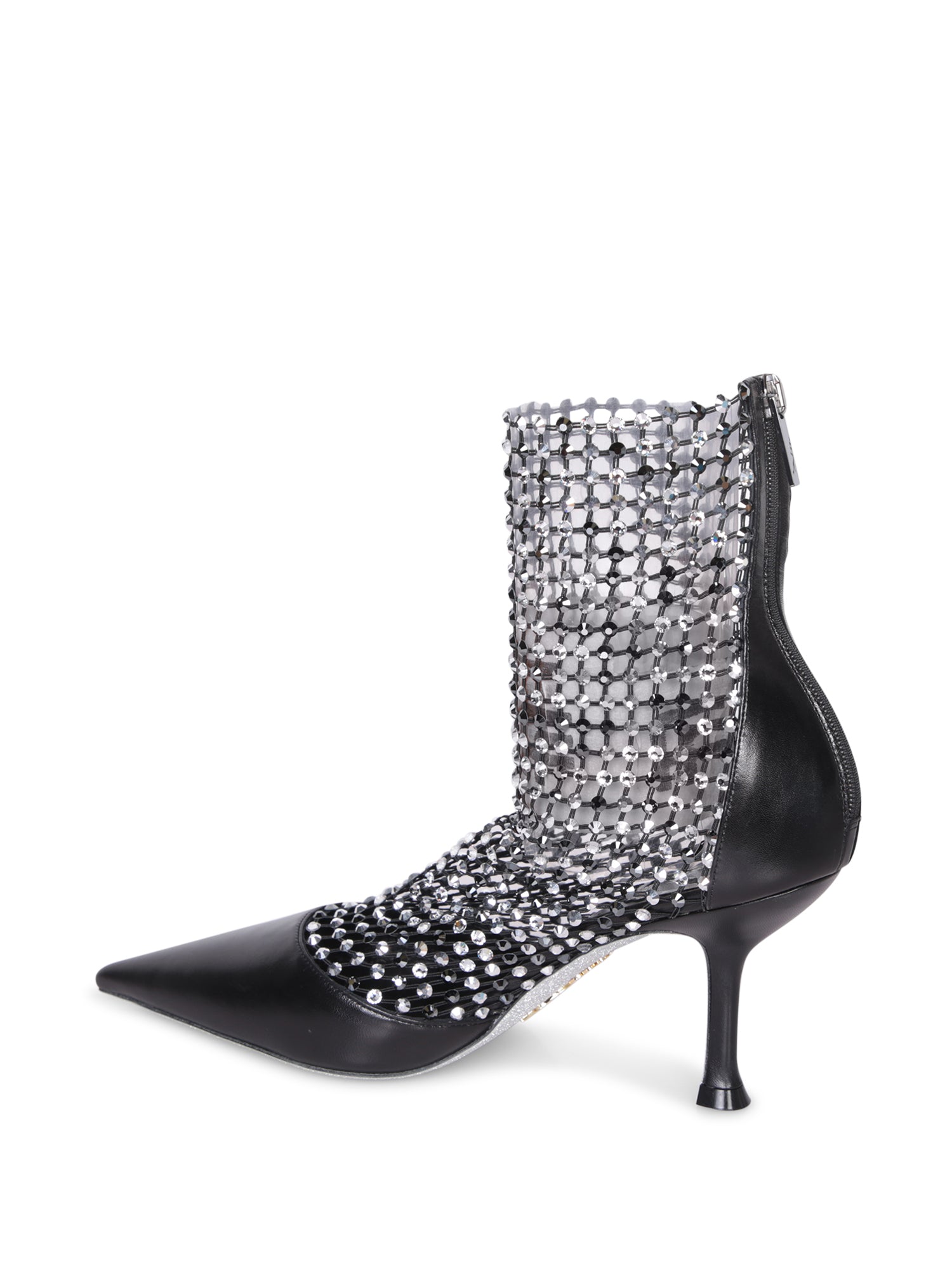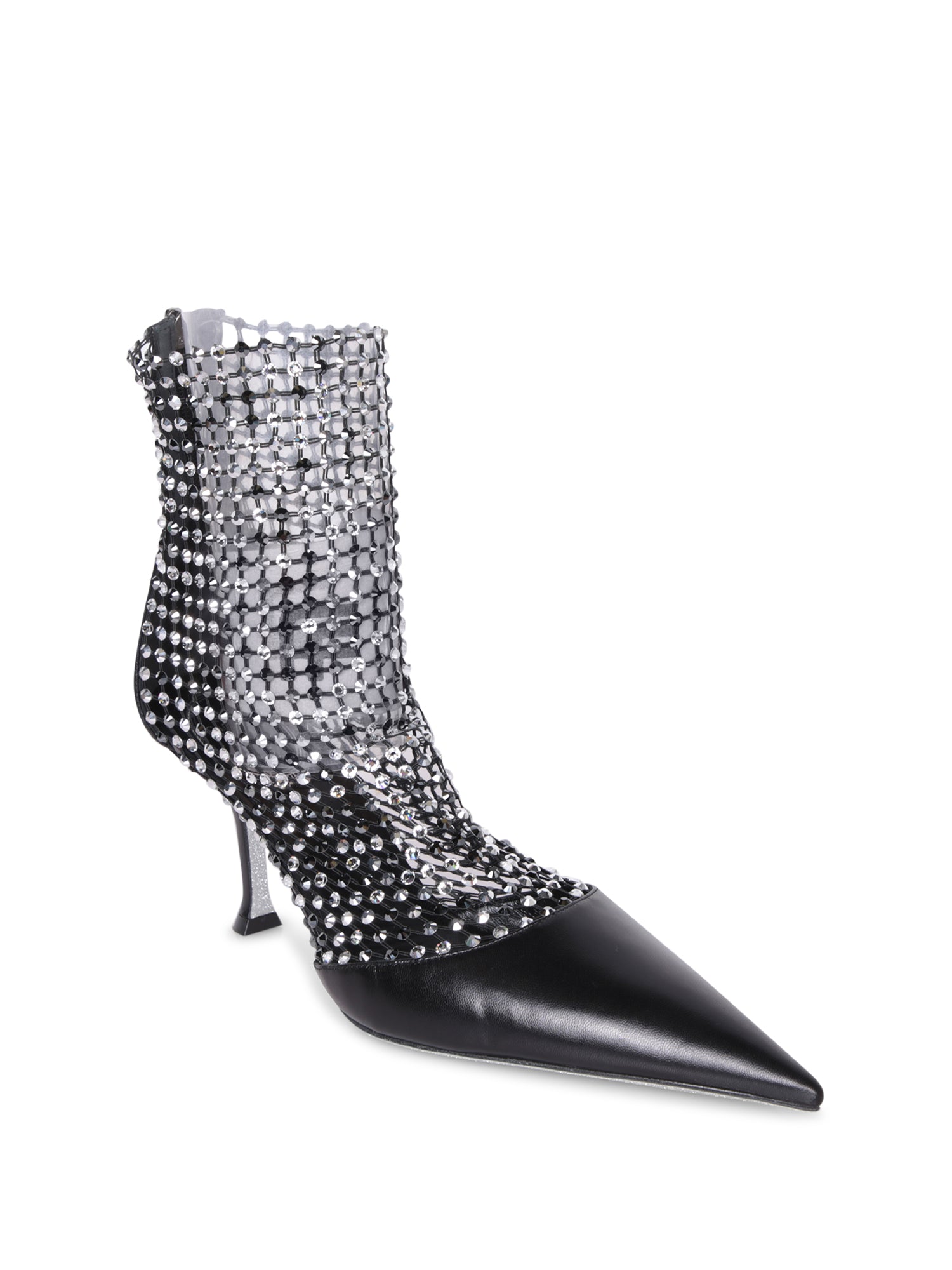 Leather ankle boot with rhinestone detail. Pointed toe. High heel.