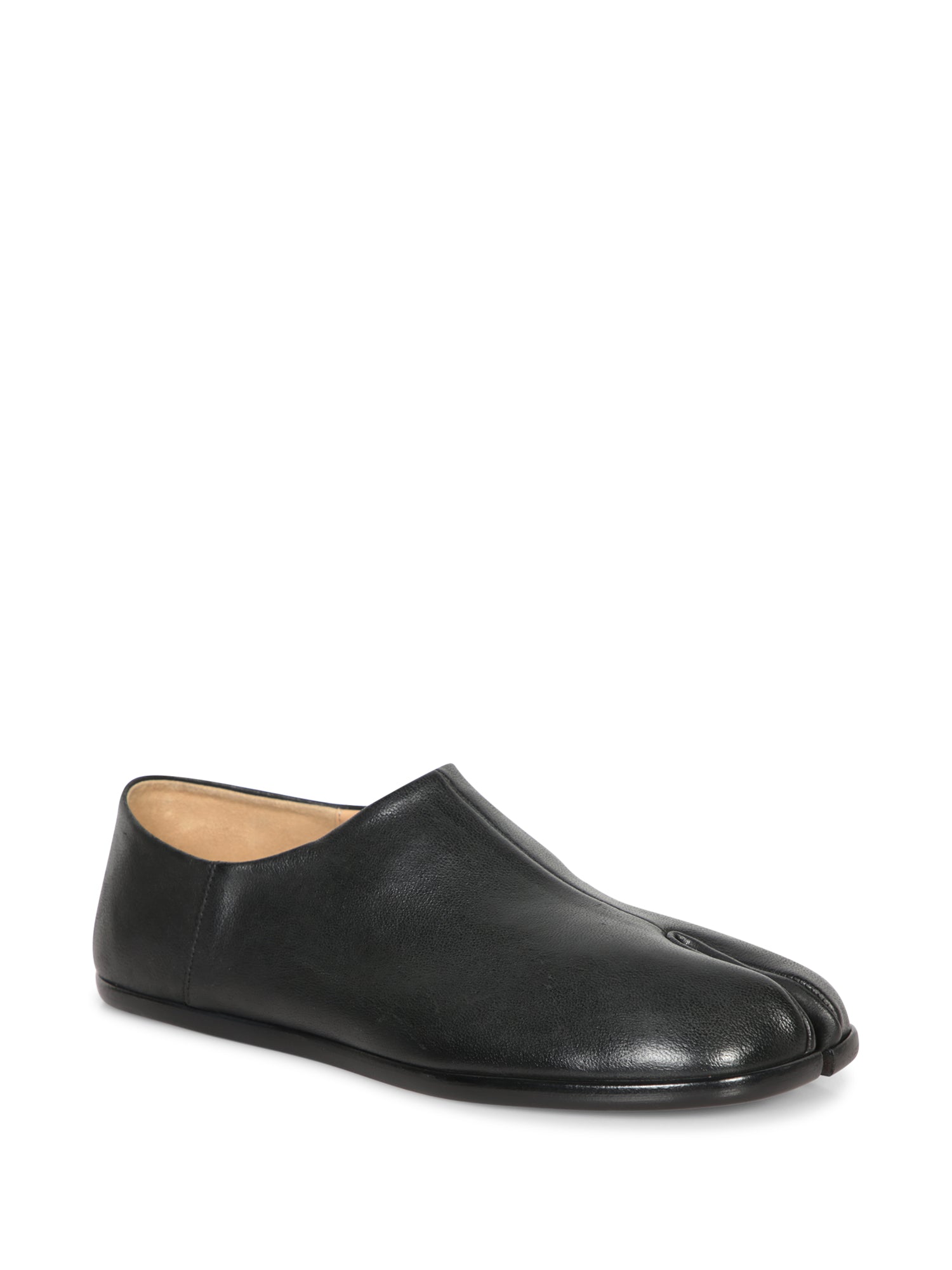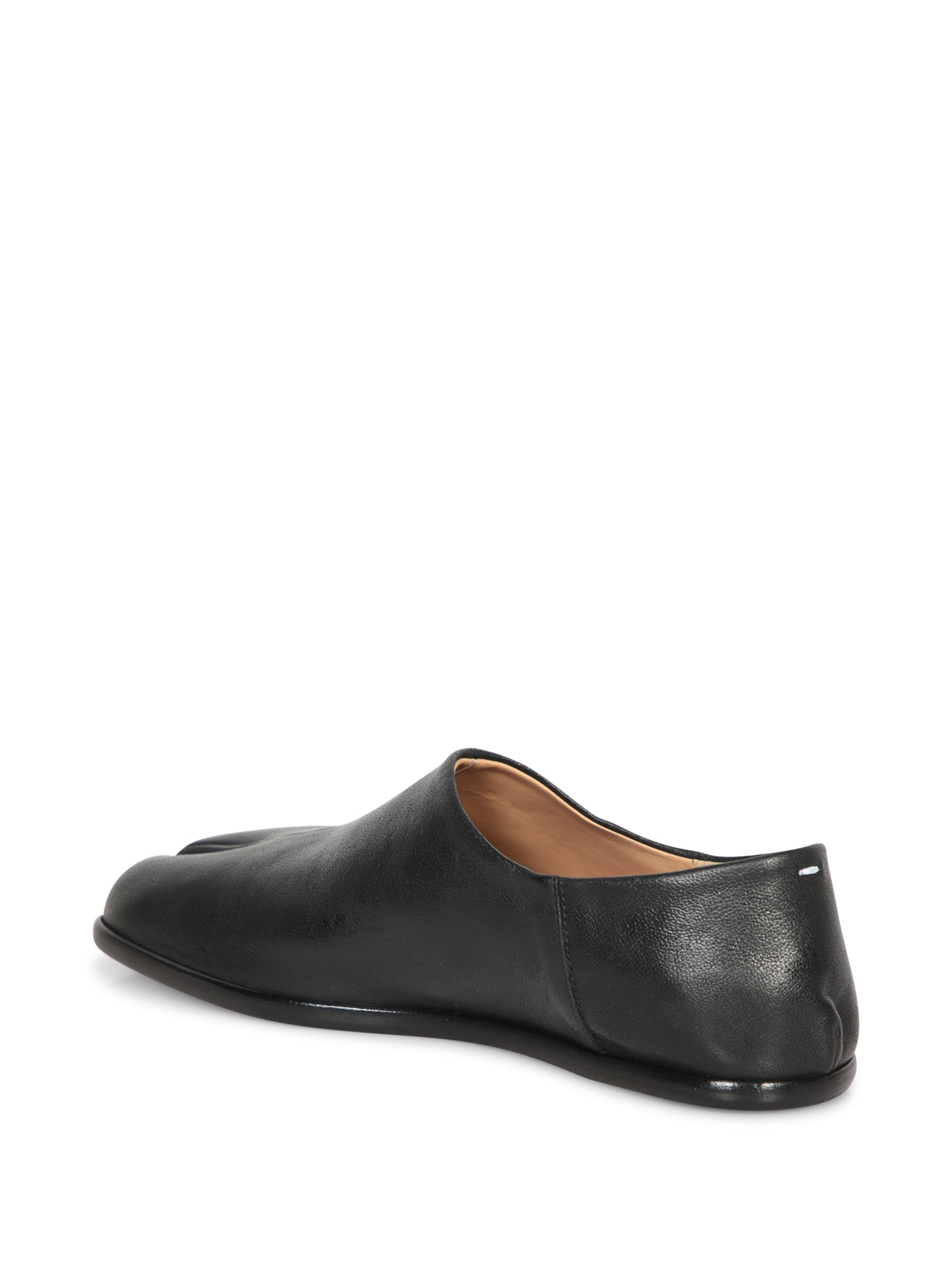 Black leather slip-on shoe. Iconic split toe. Flat rubber sole.