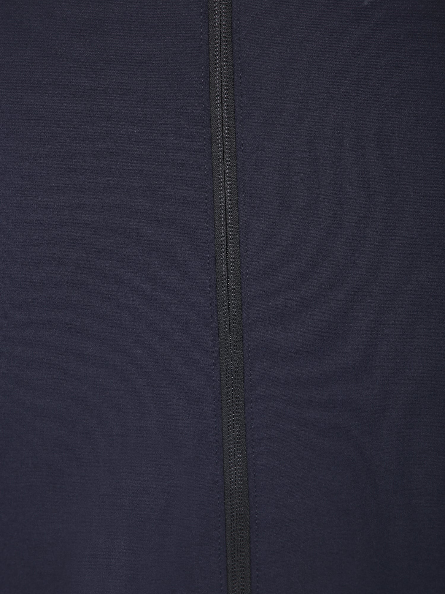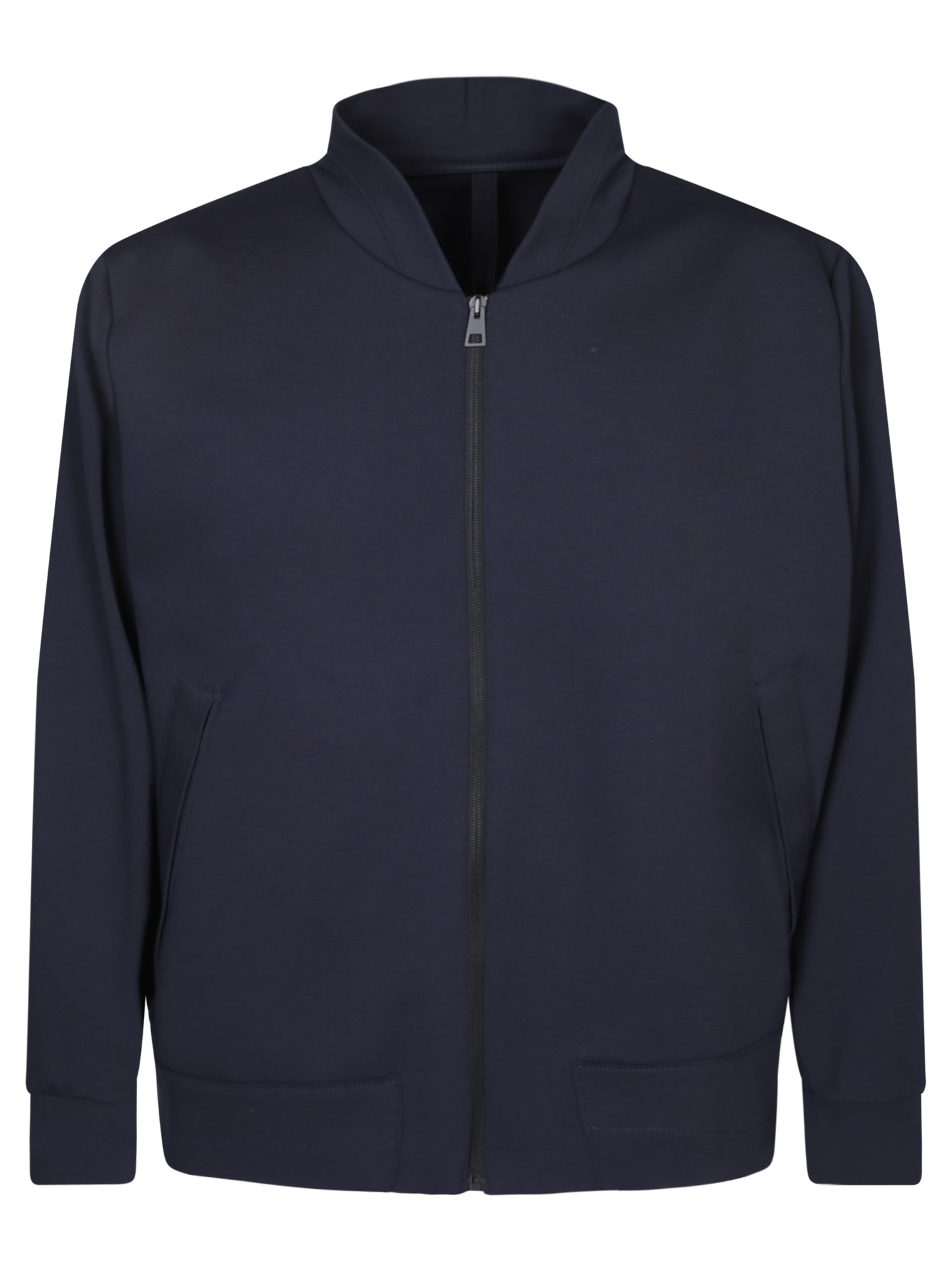 Techno fabric bomber. Ribbed collar, cuffs, and hem. Front zip fastening. Side pockets with trim.