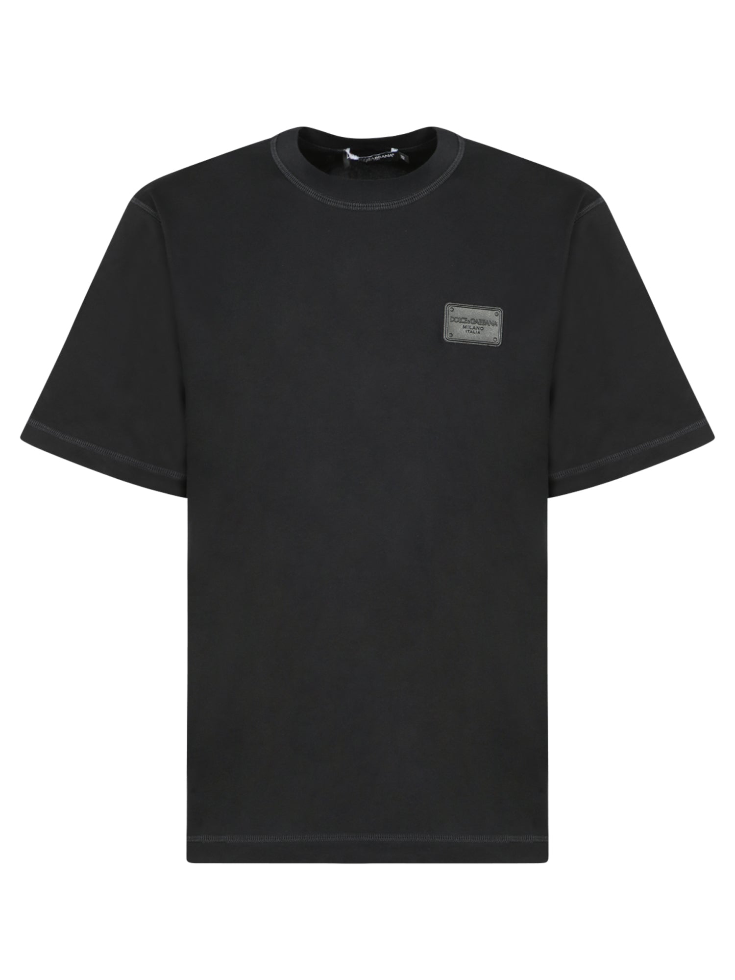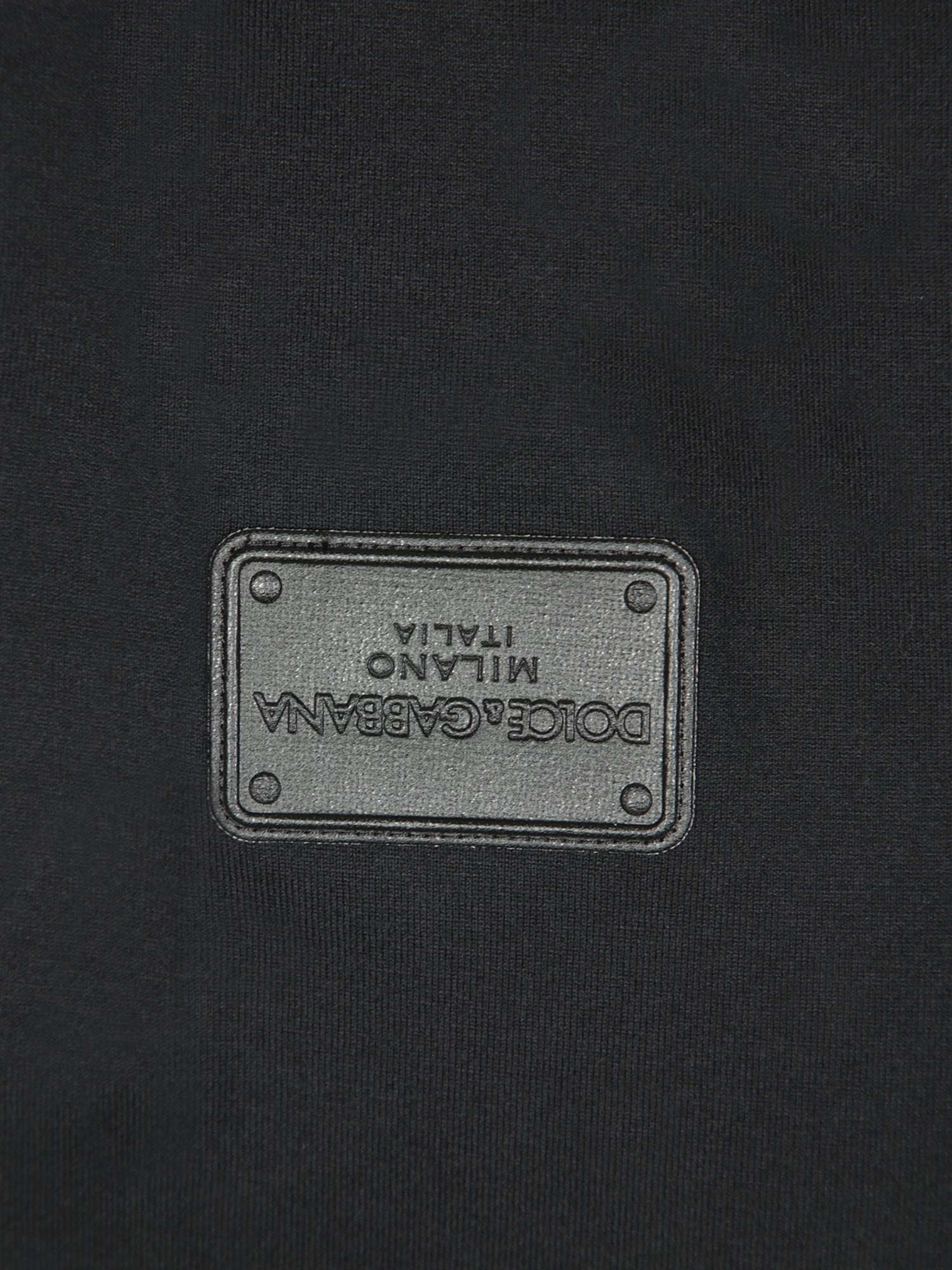This elegant creation from Dolce & Gabbana, crafted in soft black fabric, emphasizes sophistication with a tone-on-tone logo plaque on the chest, offering a distinct and minimalist look.
