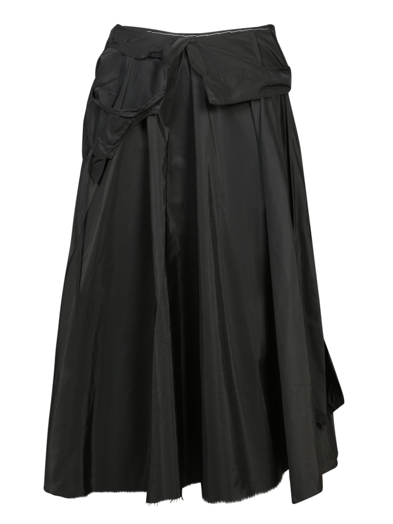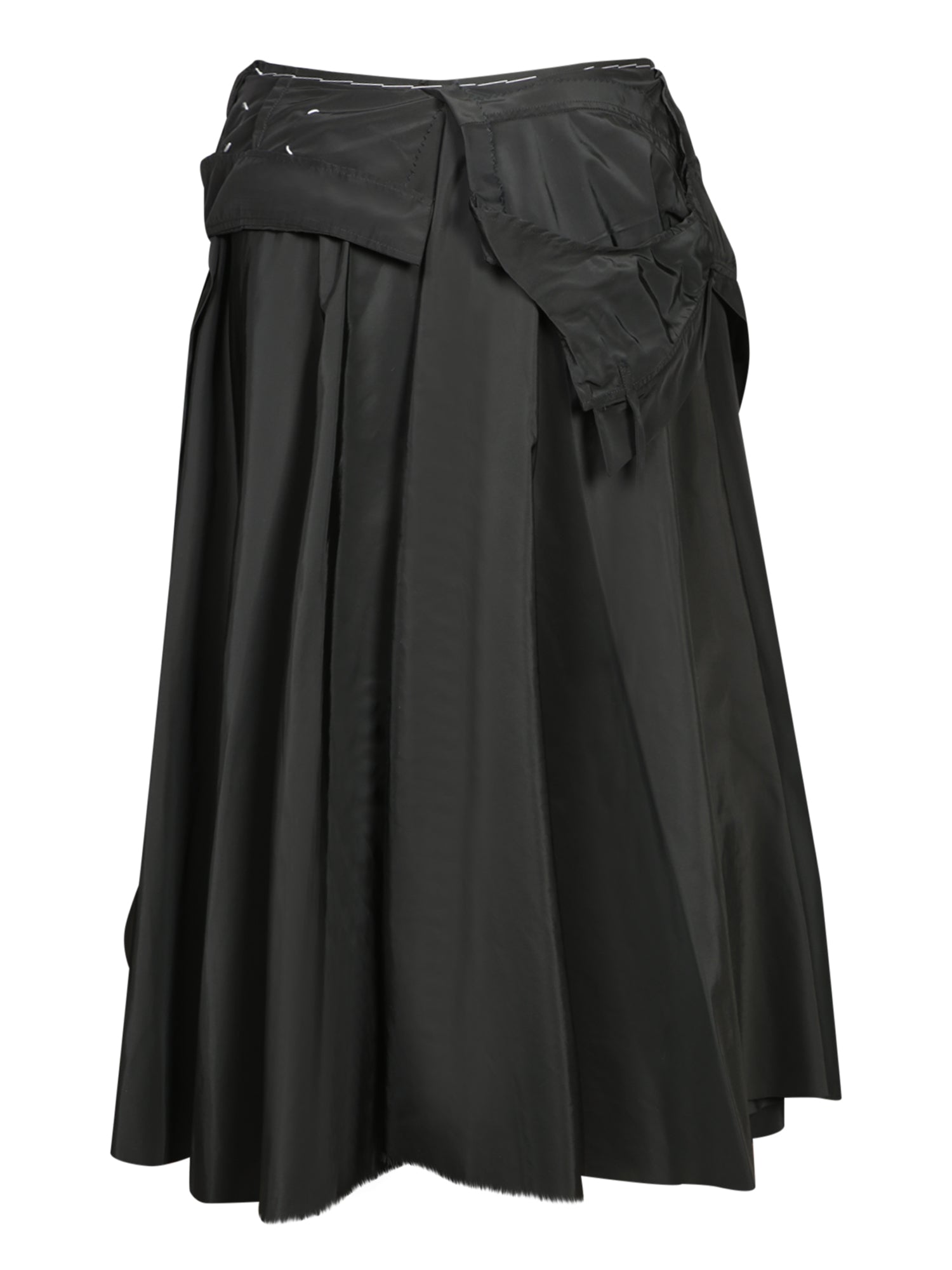 This Maison Margiela black midi skirt redefines modern elegance with a bold overlaid top and frayed details that add a touch of nonchalance.