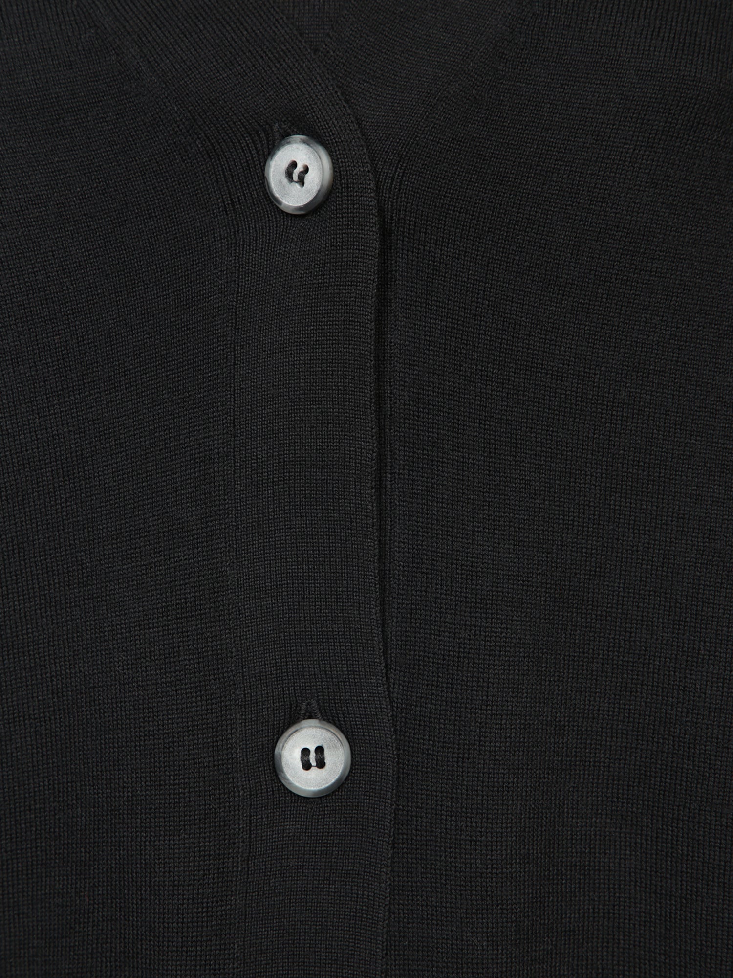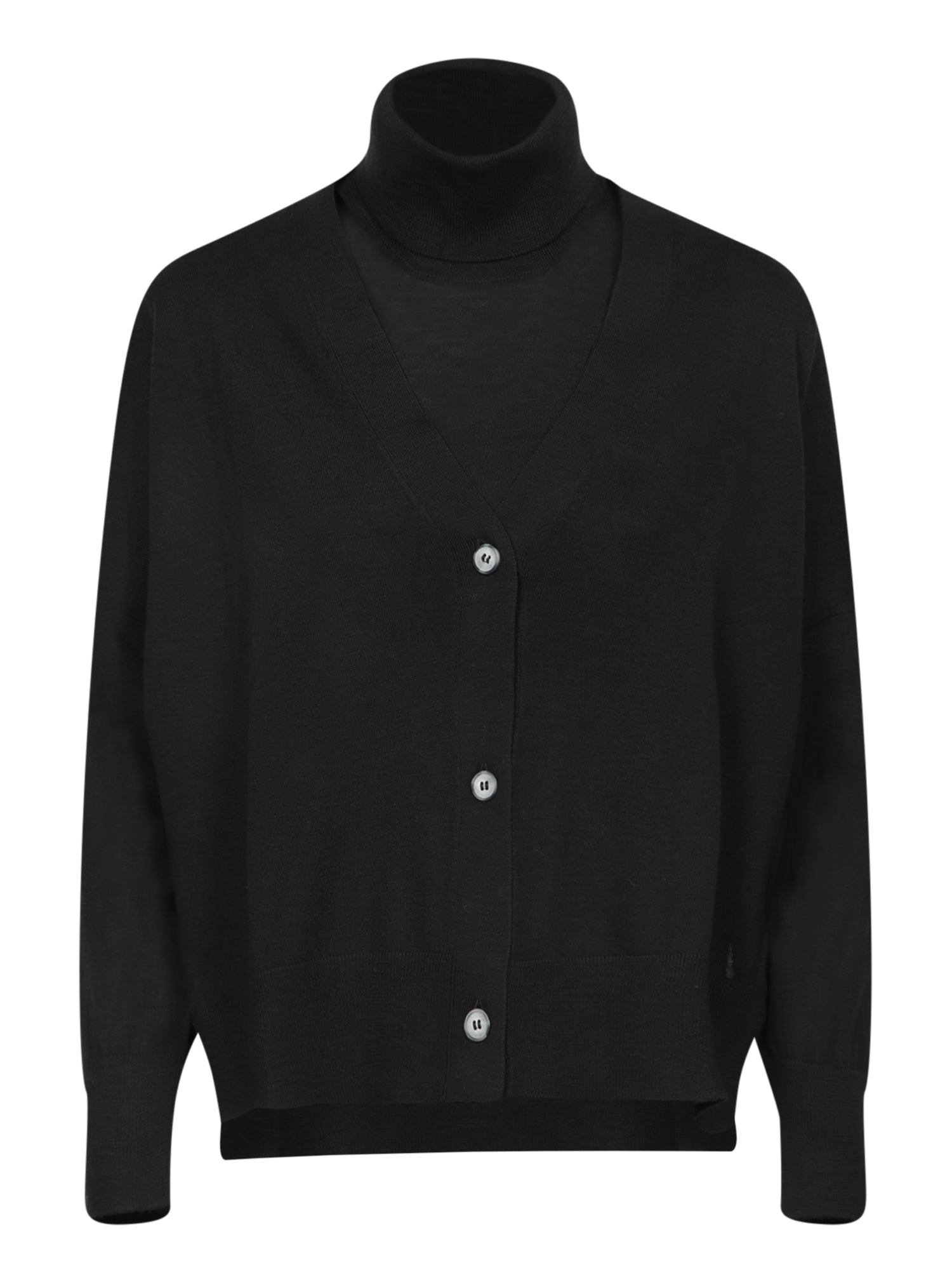 Knitted turtleneck. Button closure cardigan. Ribbed cuffs and hem.