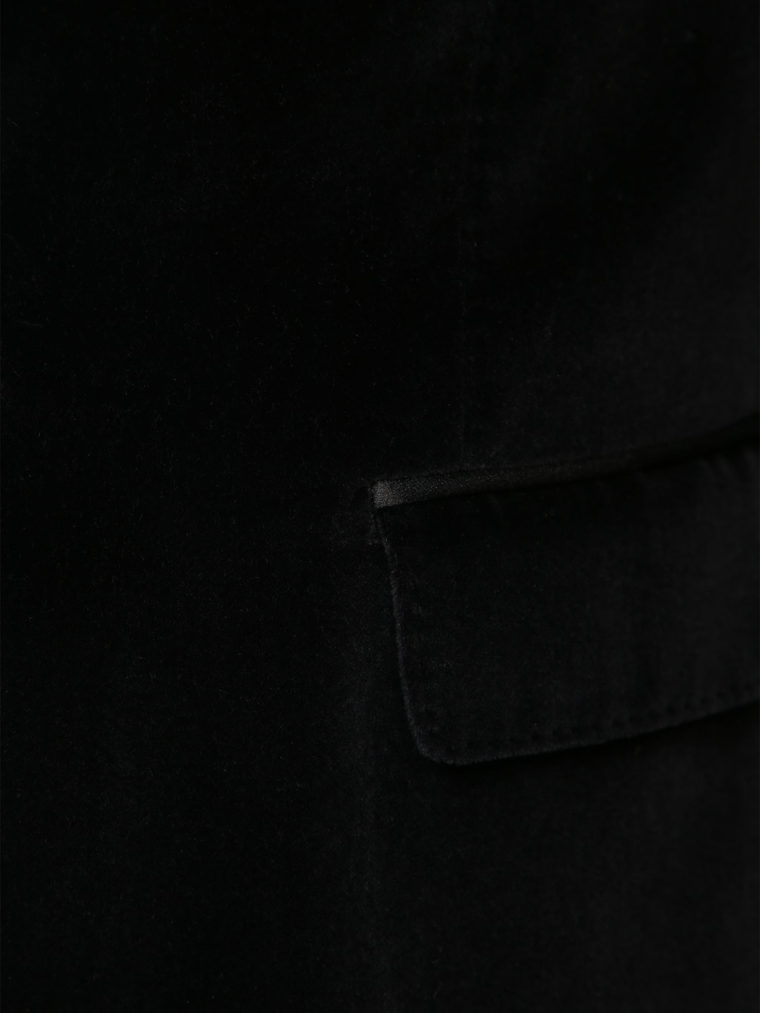 Smooth velvet jacket with satin lapels. Single button closure. Welt pockets.