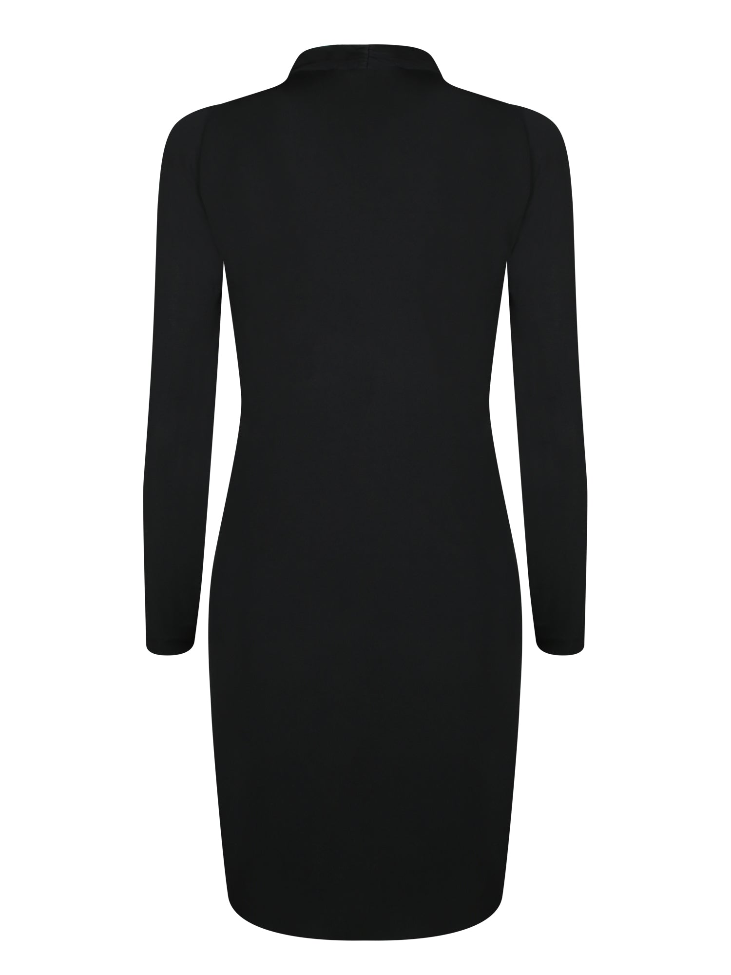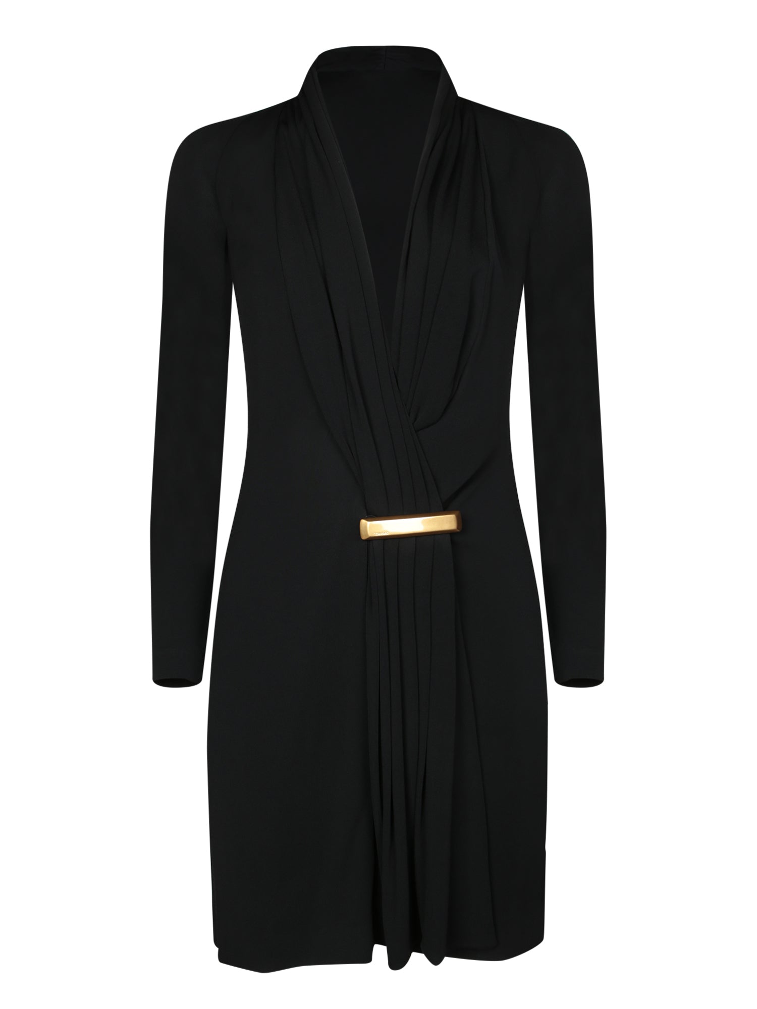 This elegant knee-length dress is crafted from refined viscose crepe, featuring a bold V-neck and sophisticated front draping enhanced by a golden bar that defines the silhouette.
