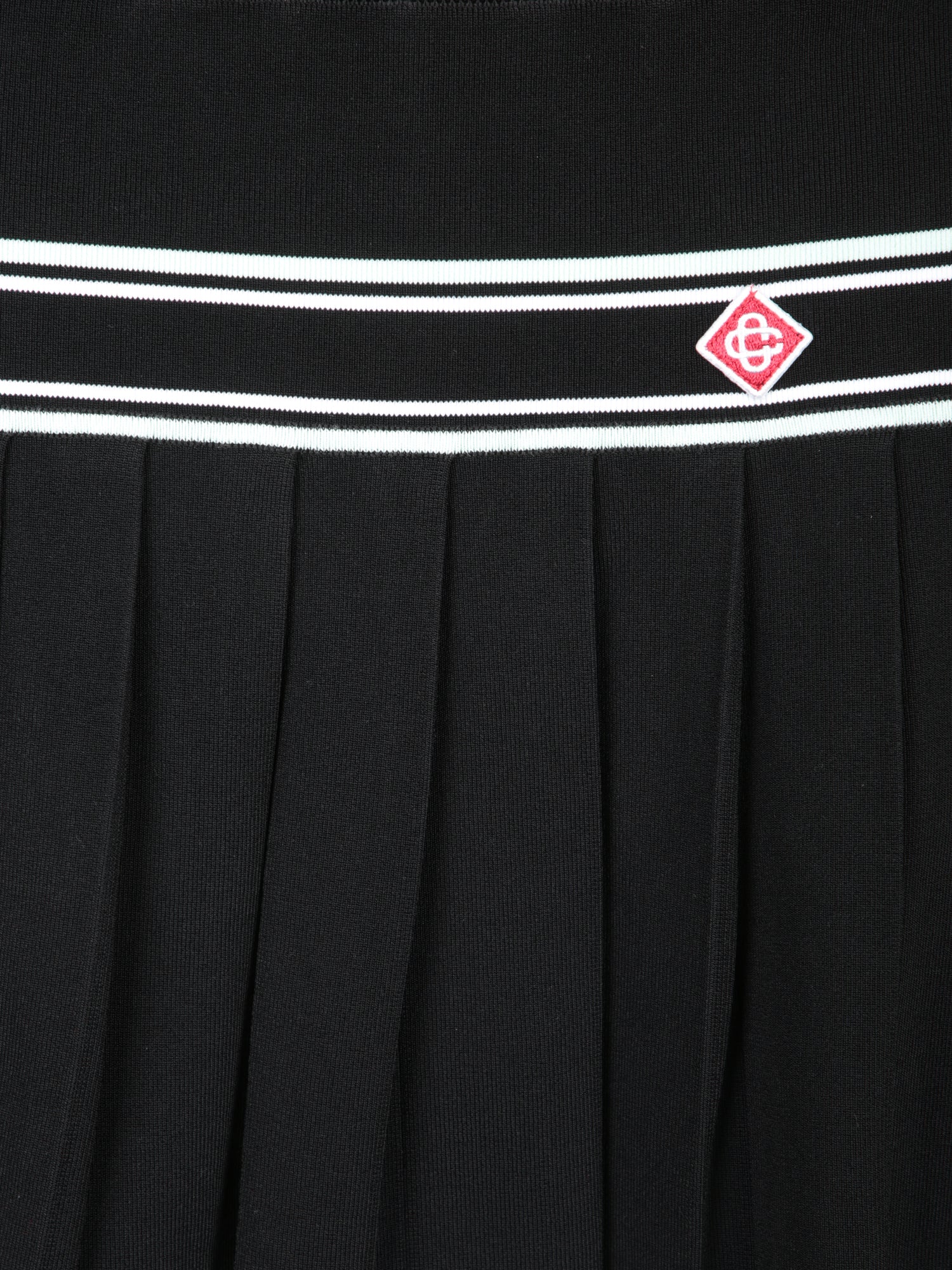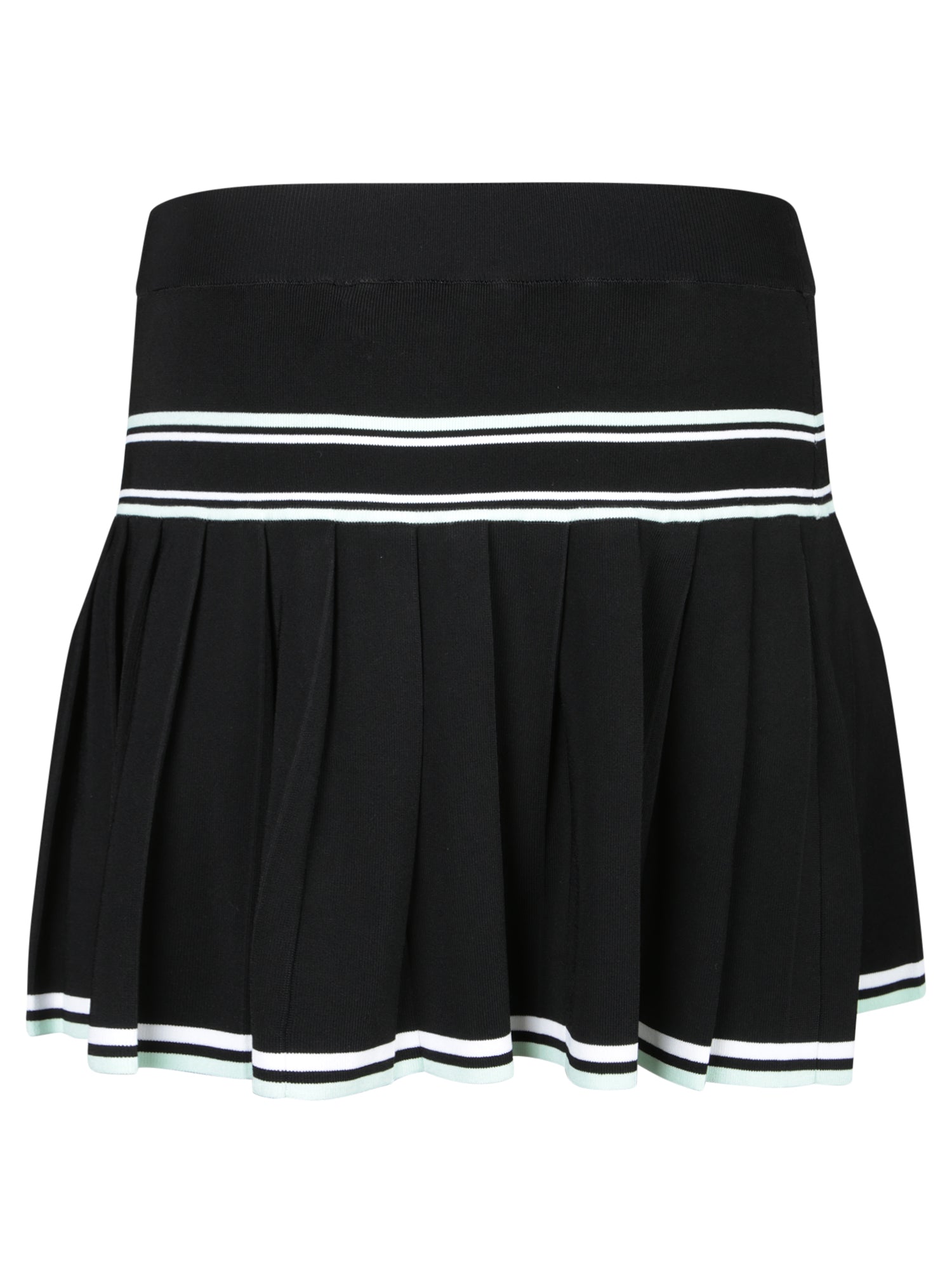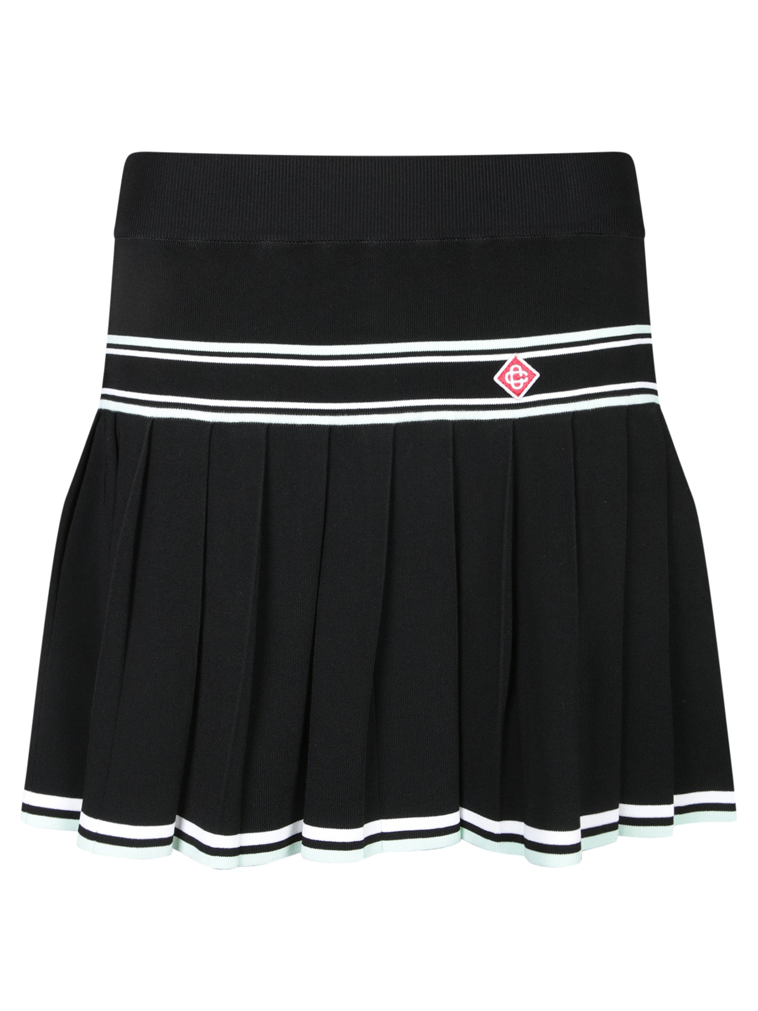 This chic black mini skirt from Casablanca is crafted from soft viscose, featuring a pleated design with white and teal stripes and a distinctive logo badge for a touch of elegance.