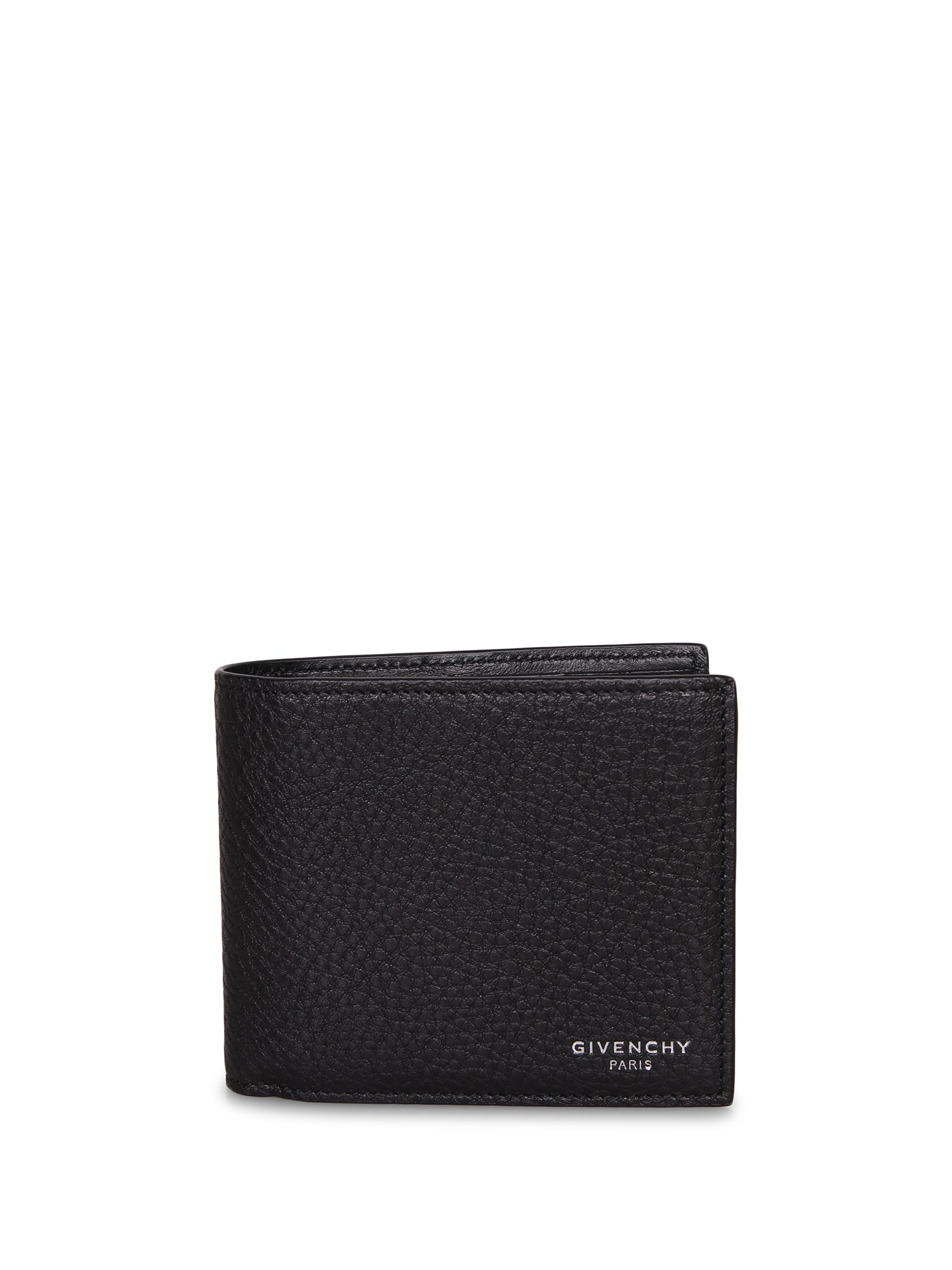 Black leather wallet with eight card slots and two bill compartments. GIVENCHY PARIS logo embossed.