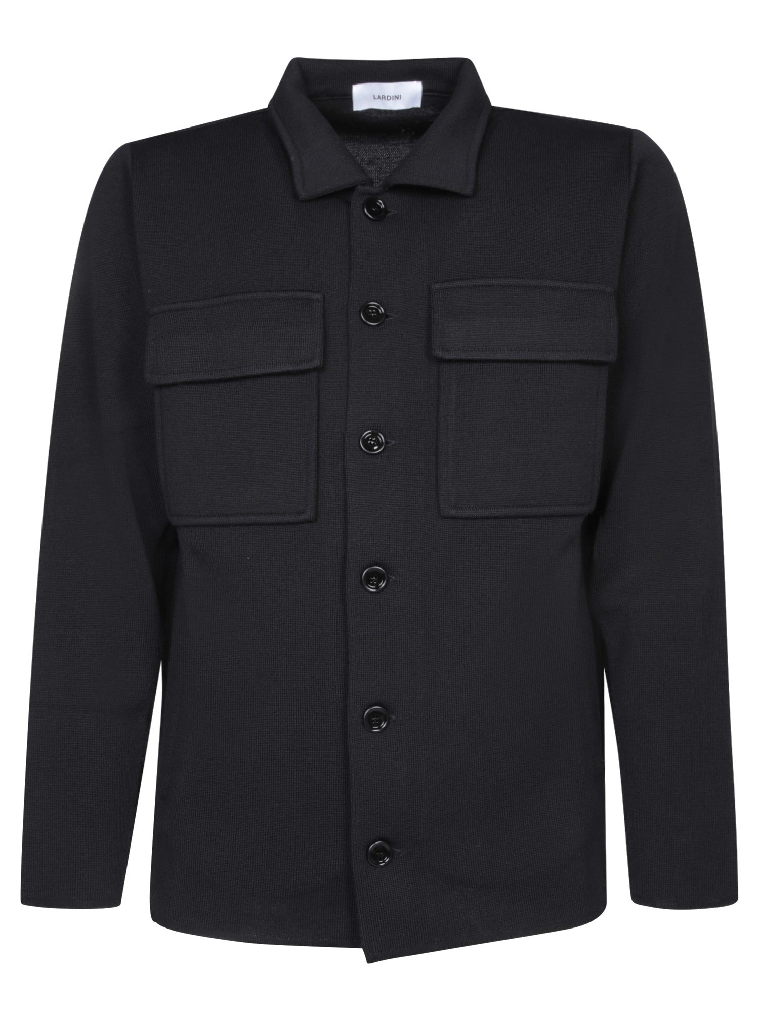 This Lardini overshirt blends elegance and practicality, crafted in fine black wool. The clean cut and minimal details like the classic collar and patch pockets make it an essential piece for winter outfits.