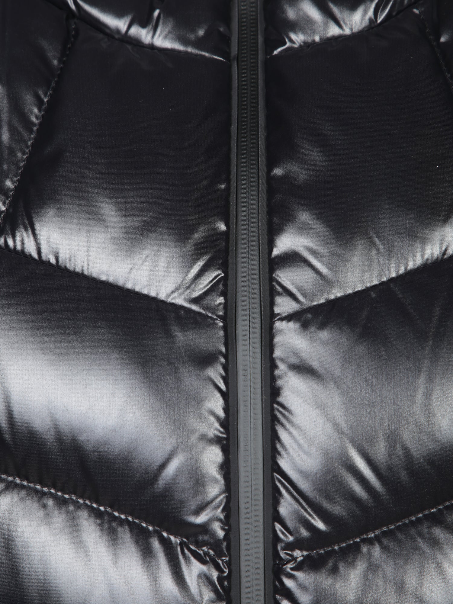 Cardigan with quilted front panel. Hooded design with full-length zipper. Knitted finishes on sleeves and back.