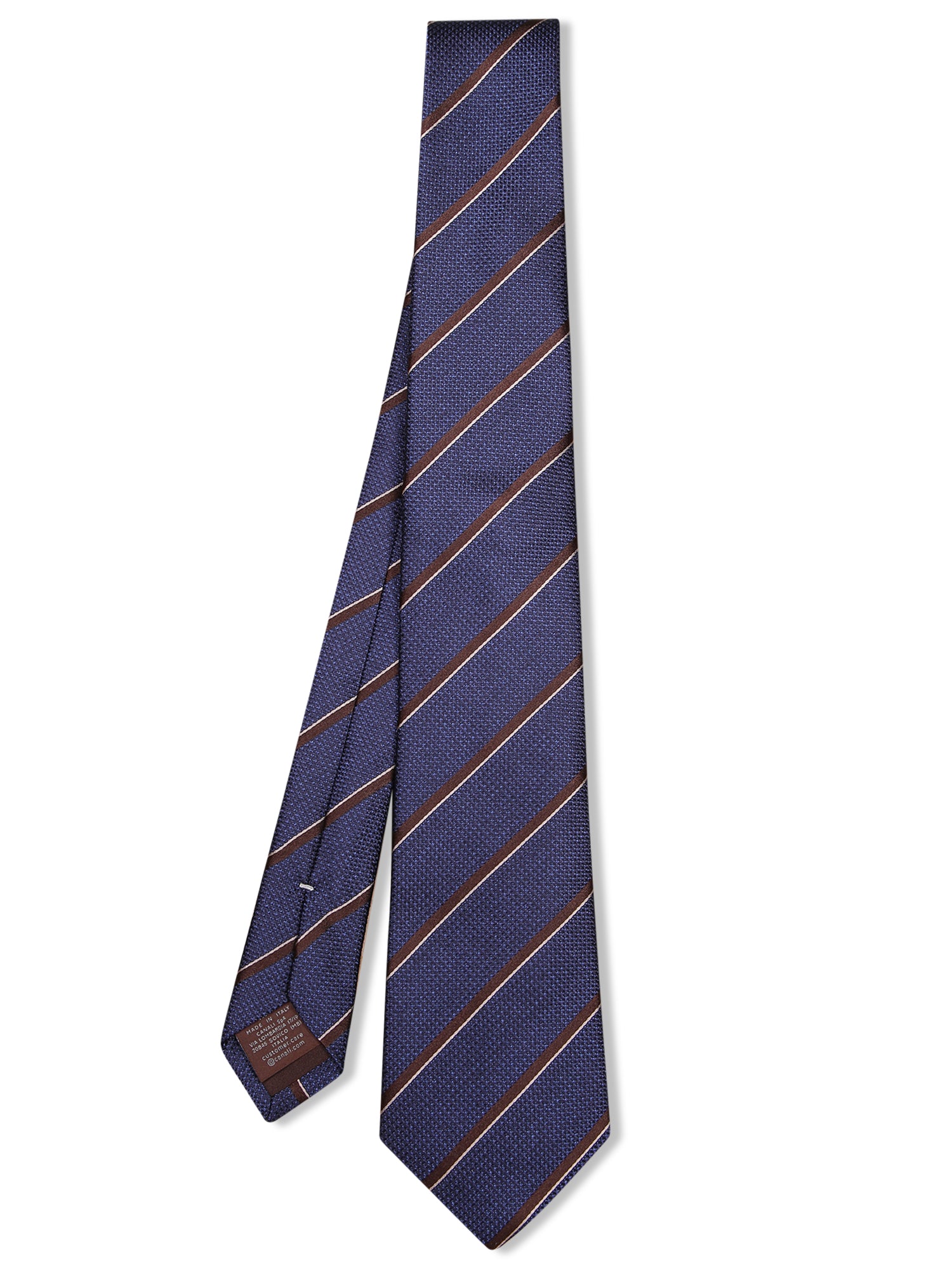 Silk tie with regimental design. Diagonal blue and brown stripes.