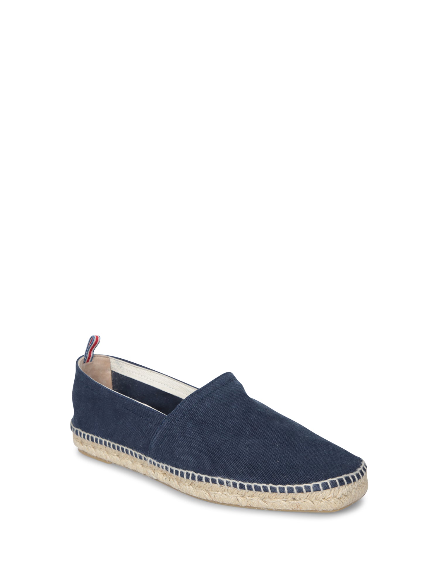 Blue cotton canvas upper, rope sole, elastic inserts on the sides.