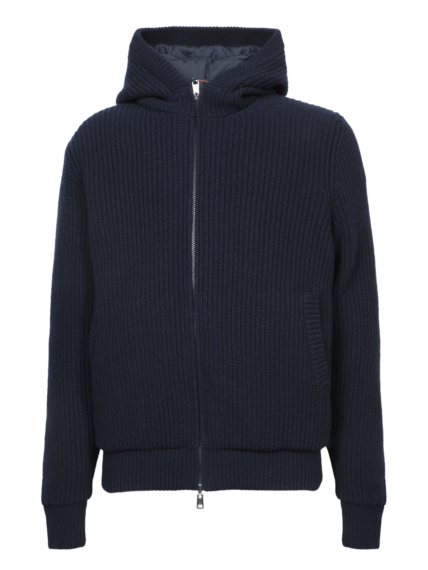 This dark blue Moncler jacket features a padded design providing warmth and comfort, perfect for chilly days. The high collar and knitted elements ensure a cozy and stylish fit.