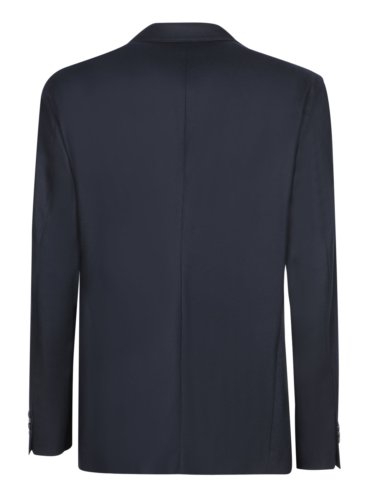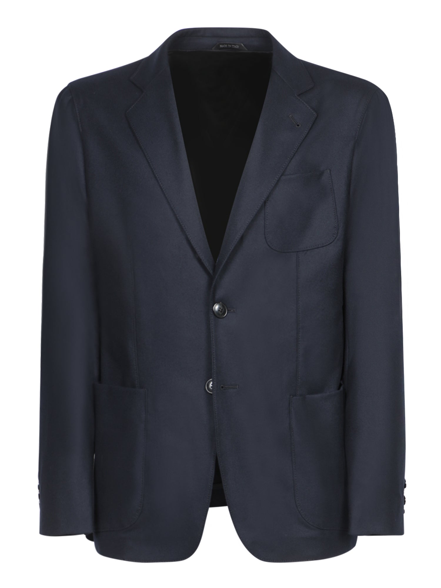 Blue cashmere jacket. Features notched lapels, button closure, and patch front pockets.