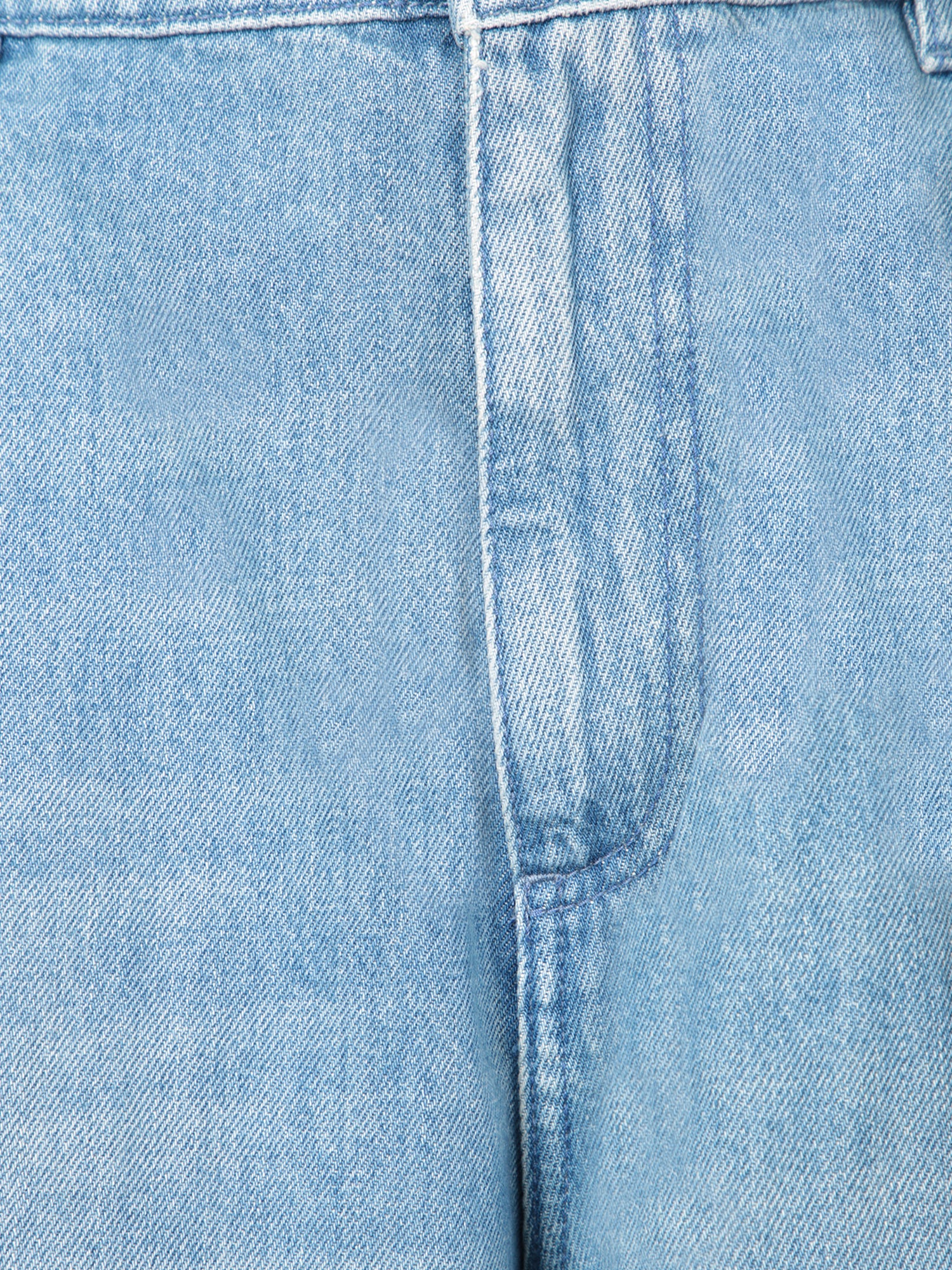 Faded blue denim bermuda shorts featuring large side cargo pockets and button front closure.