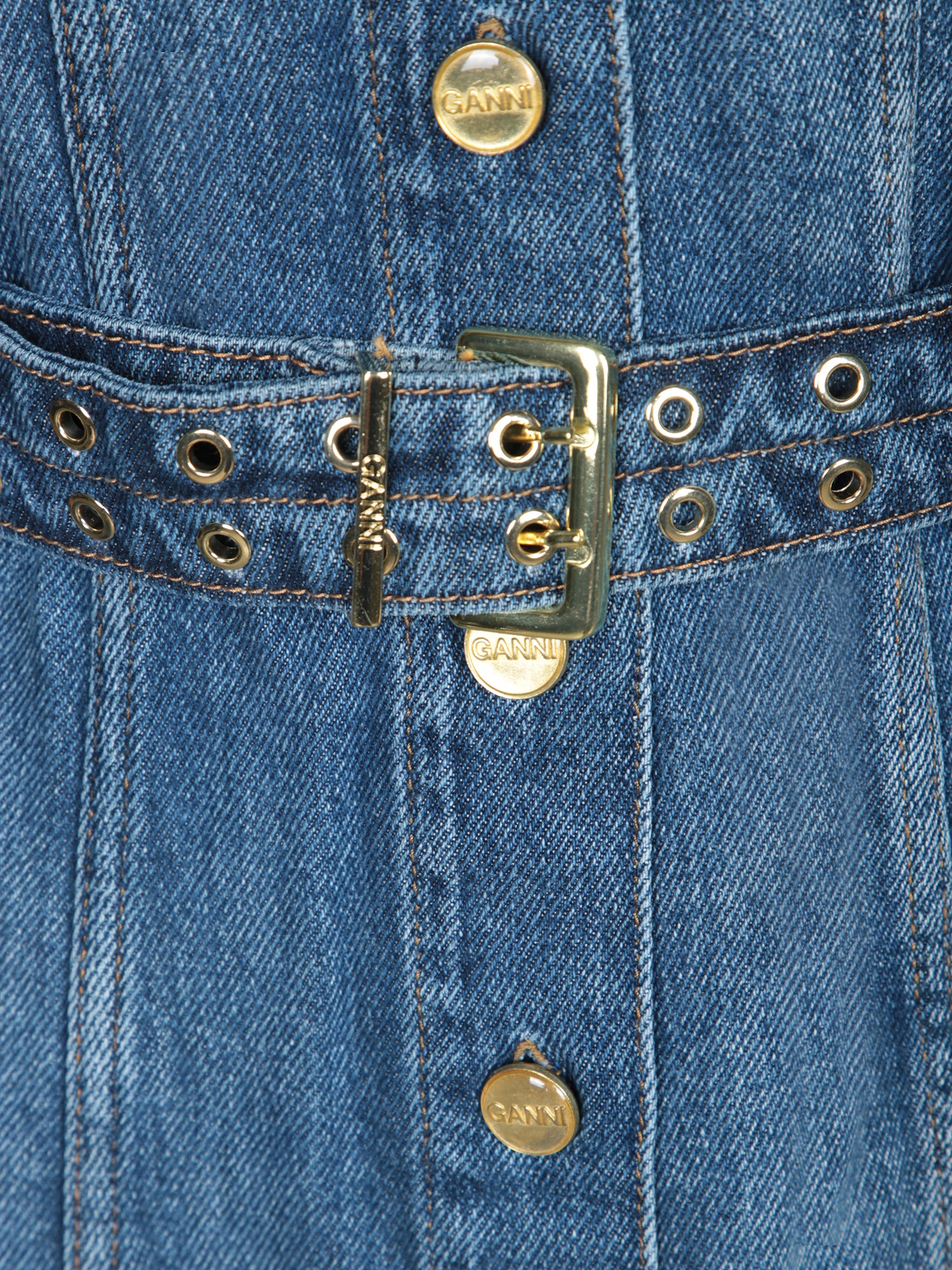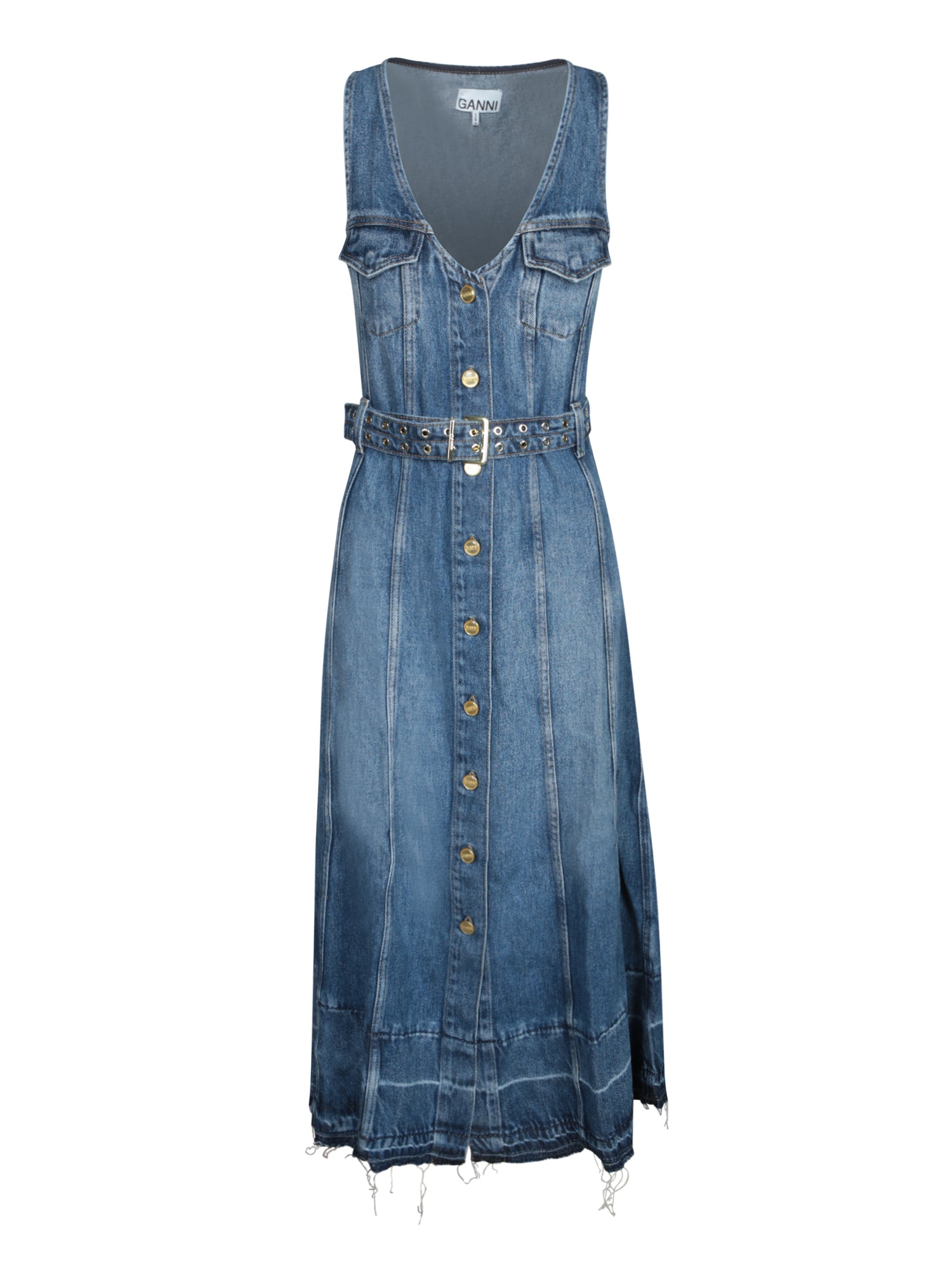 This GANNI blue denim midi dress features a sleek silhouette complemented by an ornate belt that accentuates its shape. Finished with a frayed hem for a contemporary touch.