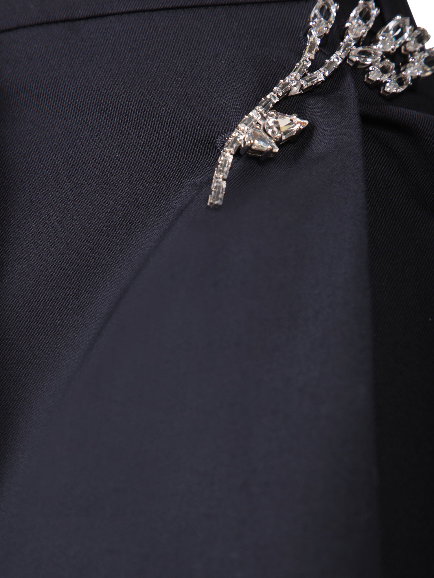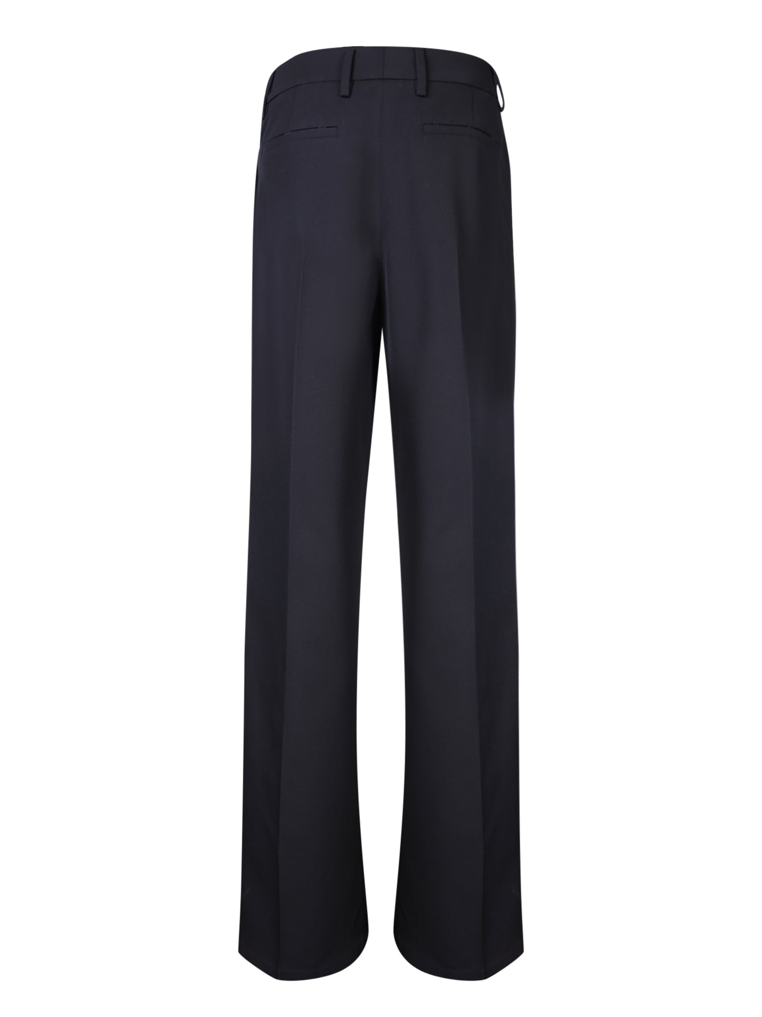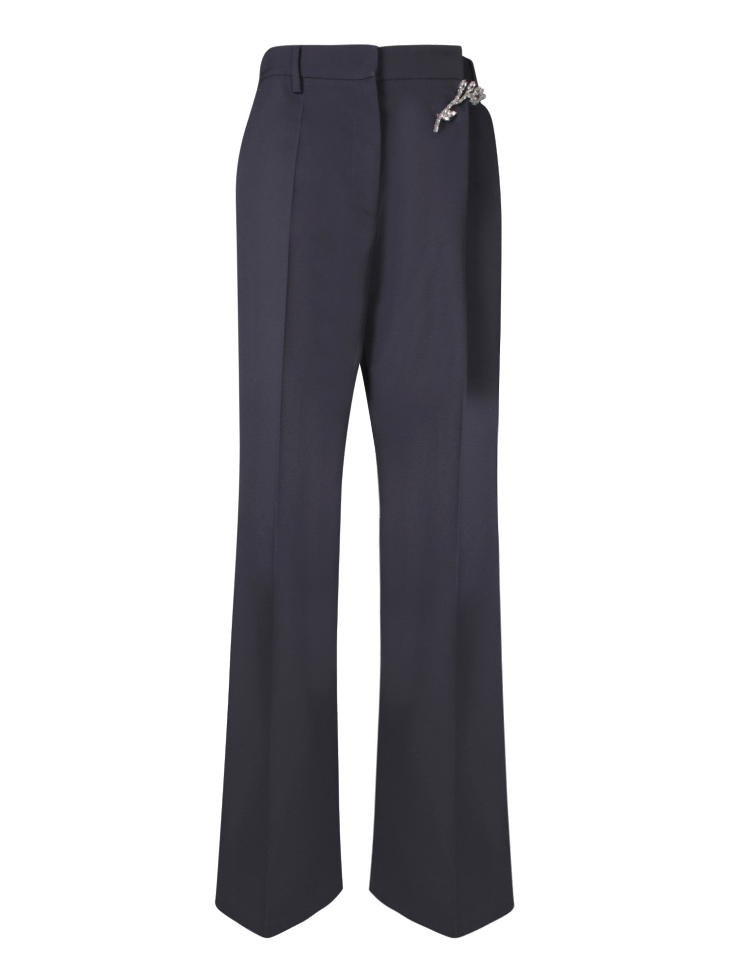 High-waisted gabardine trousers, tailored cut with pleats, front zip and hook closure, silver key-shaped charm detail.