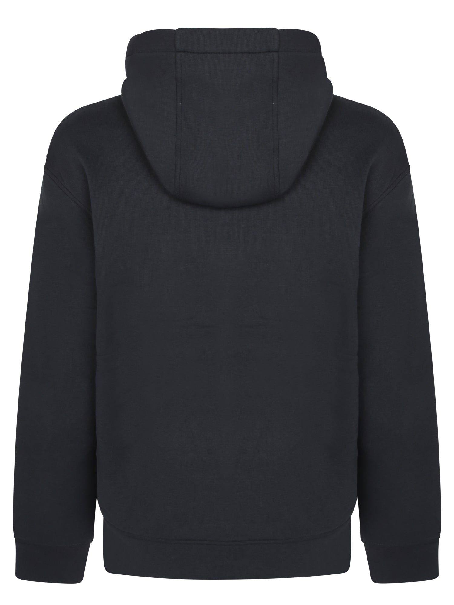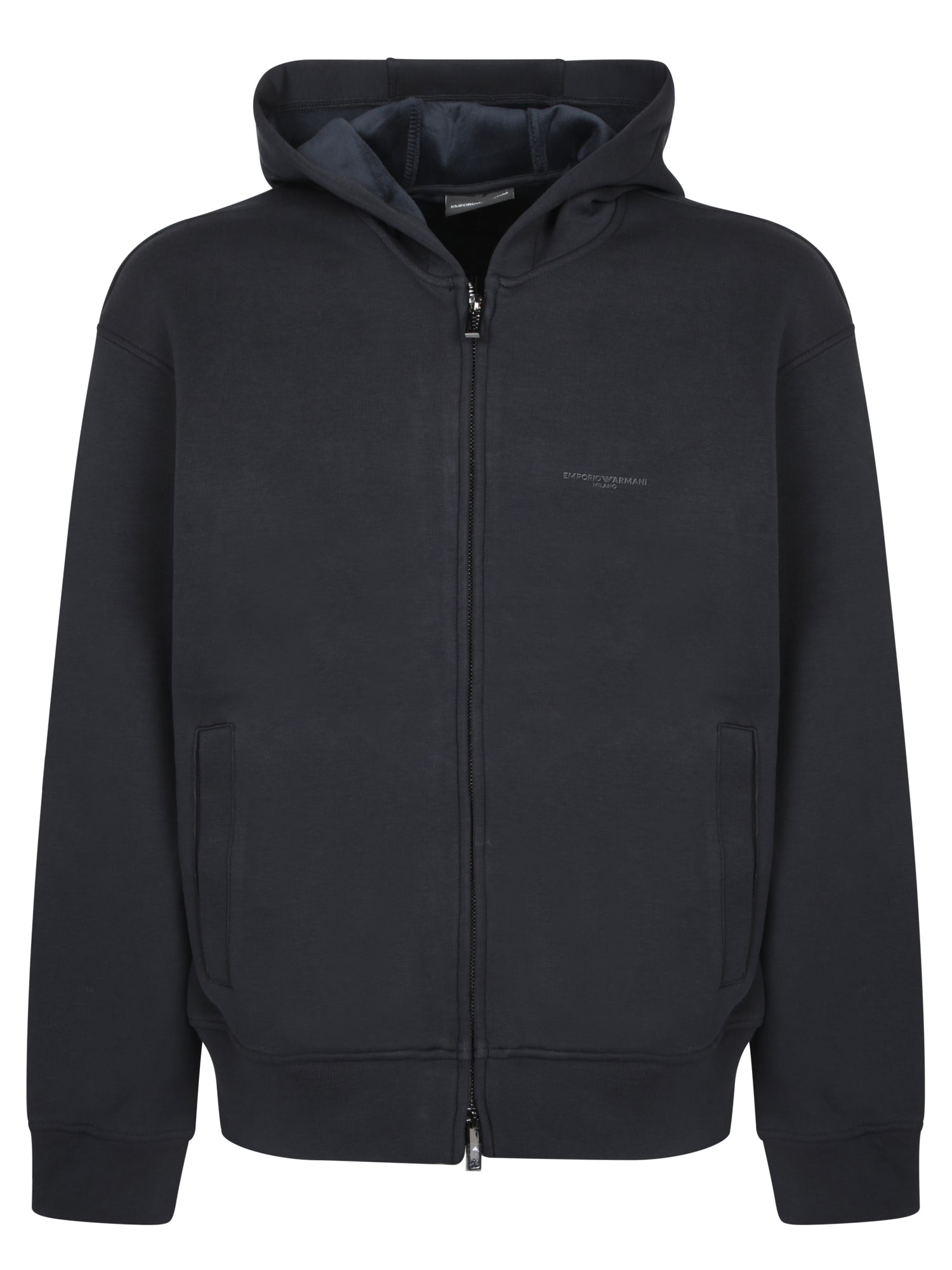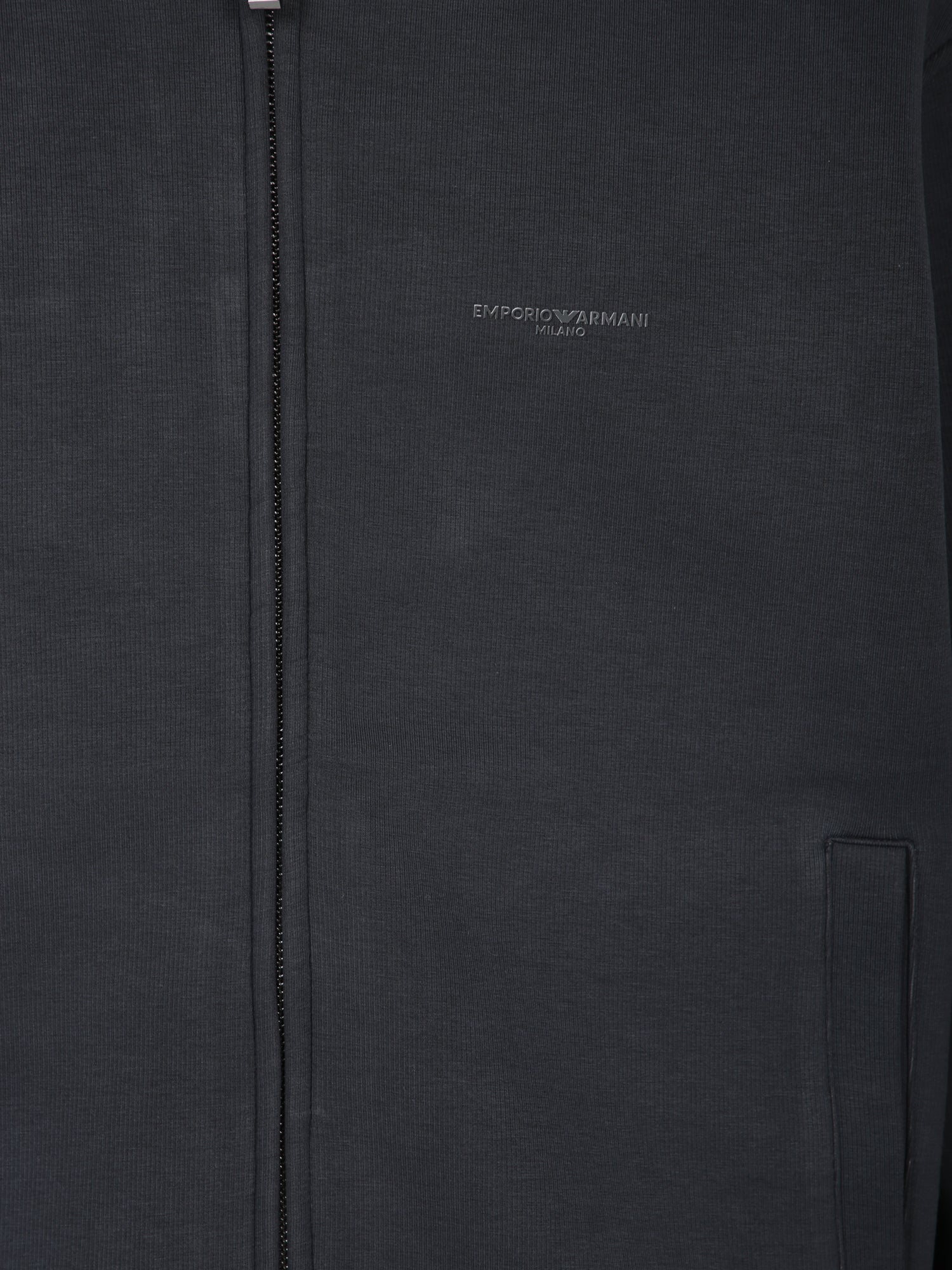 Hooded sweatshirt, front zip closure, side welt pockets.
