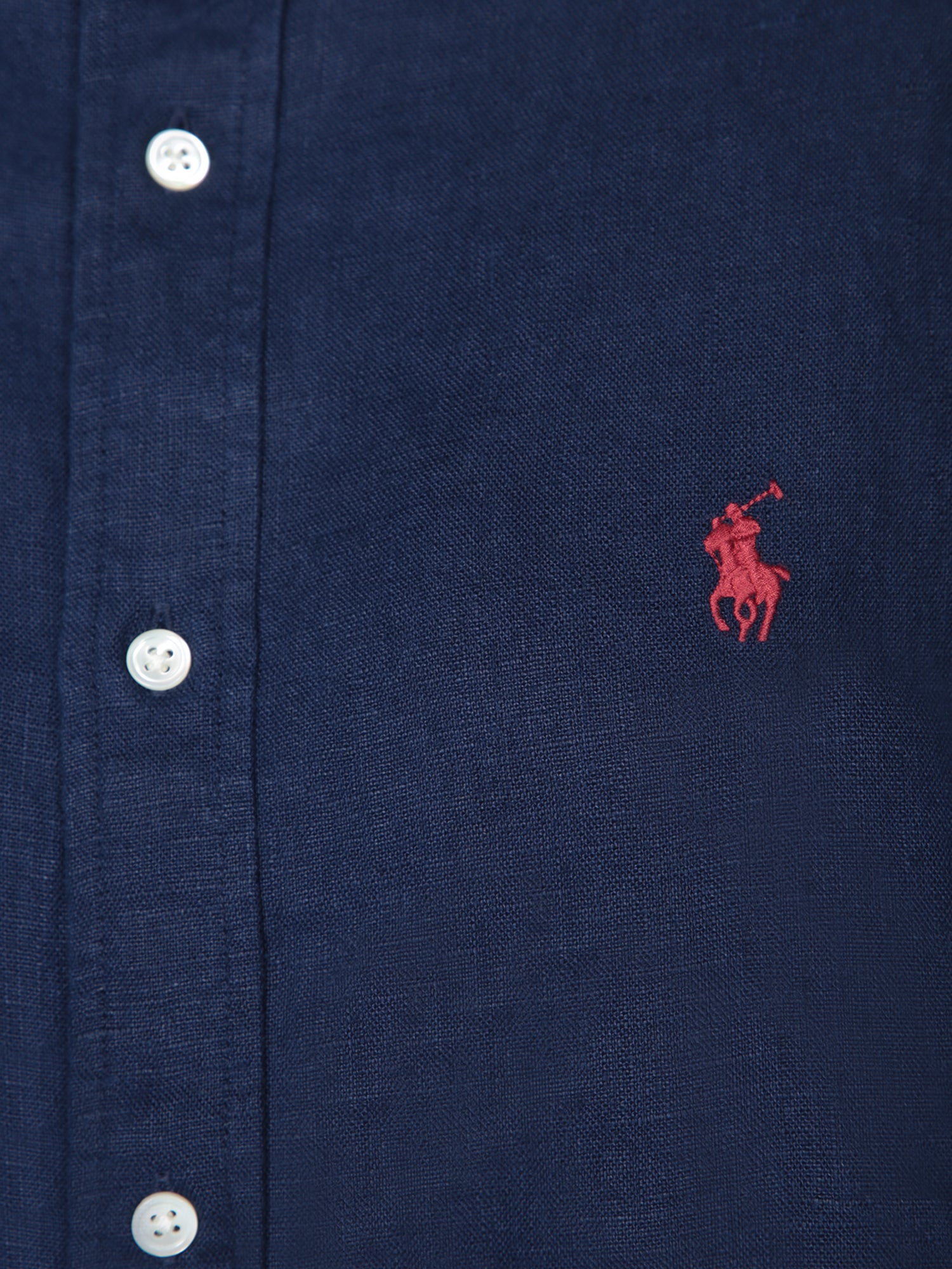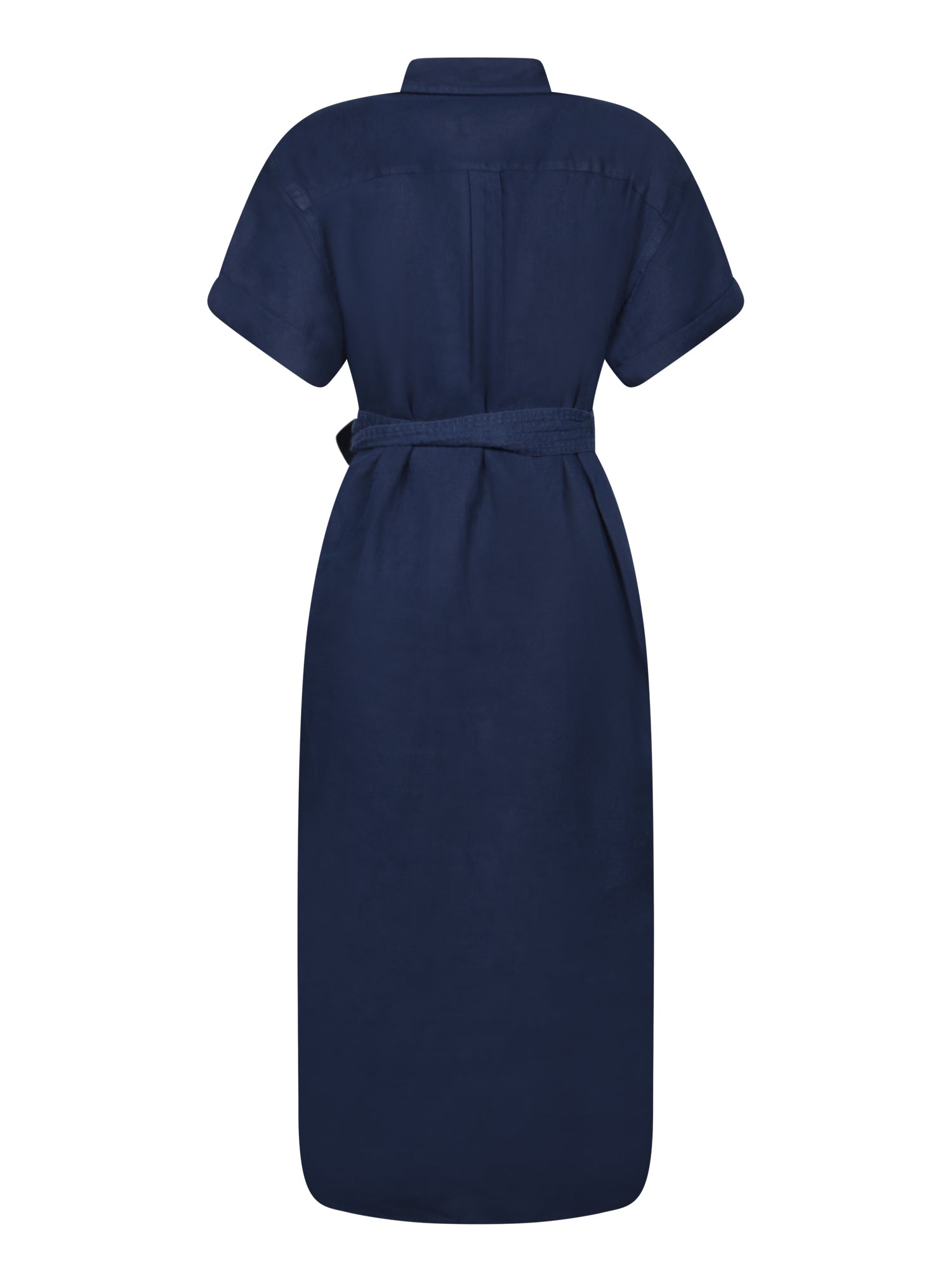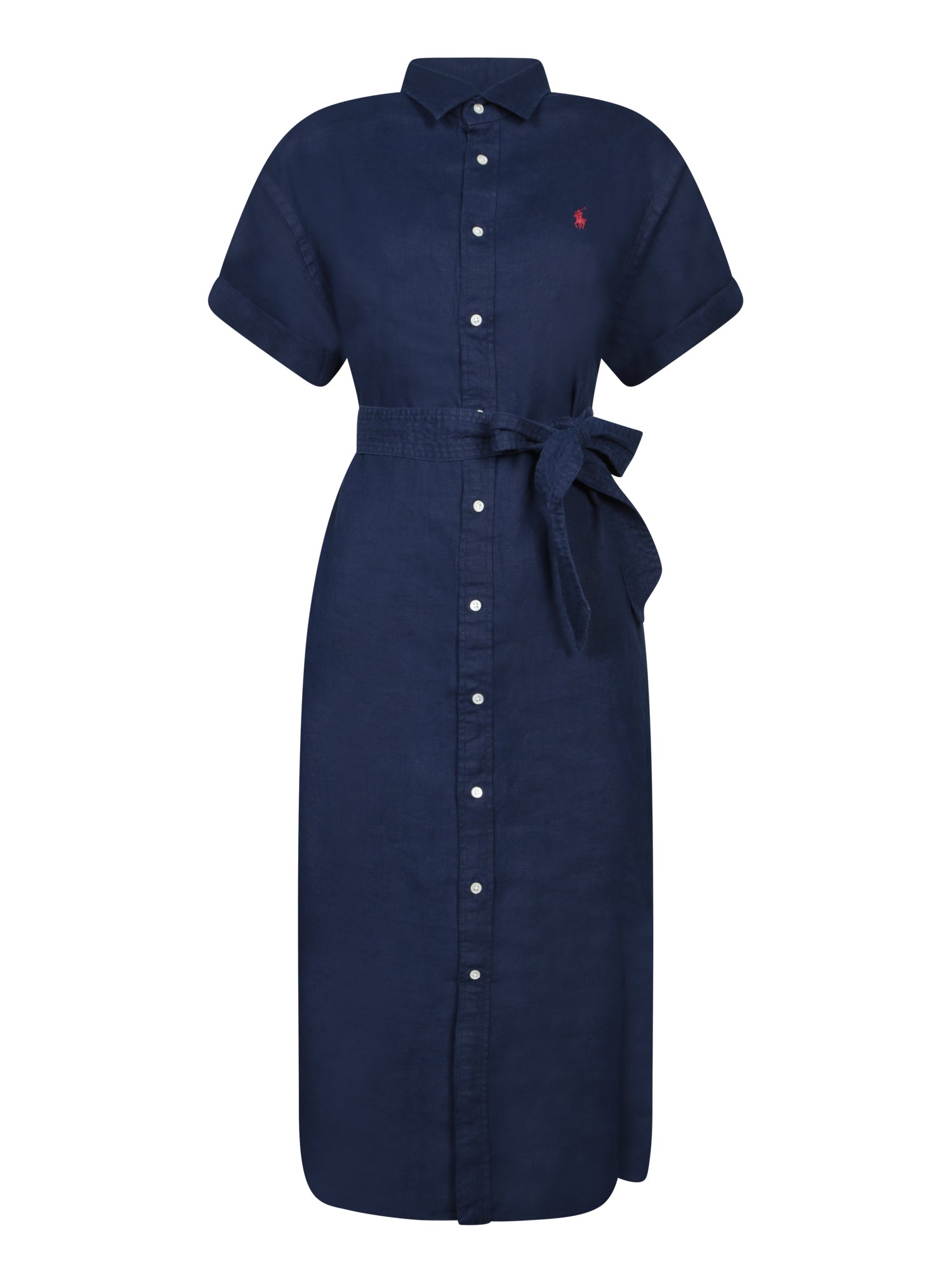 This stylish Polo Ralph Lauren blue linen midi dress is perfect for a sophisticated summer look. Its clean design with a knotted belt emphasizes the silhouette, while the small embroidered logo adds a distinctive touch of class.