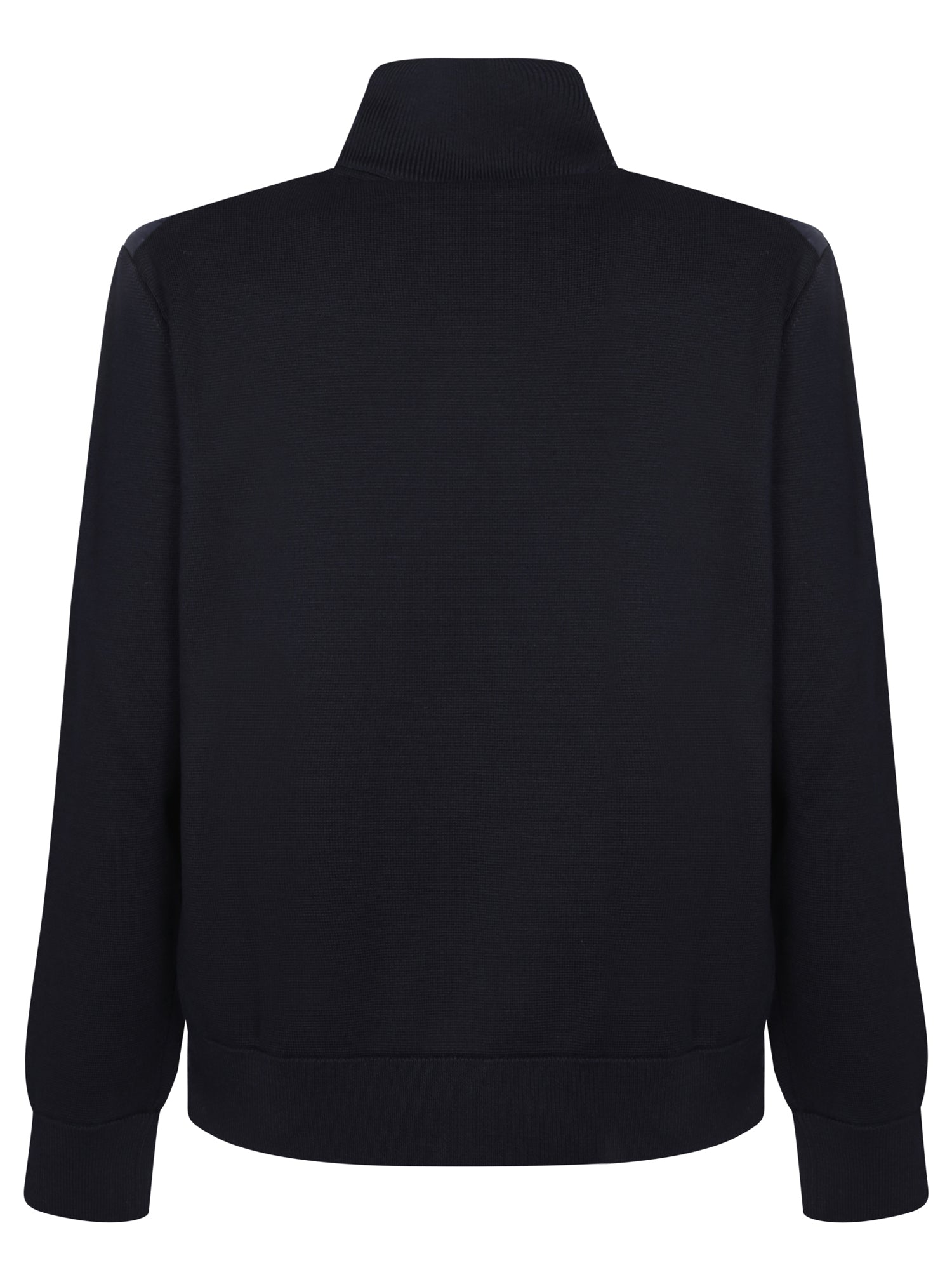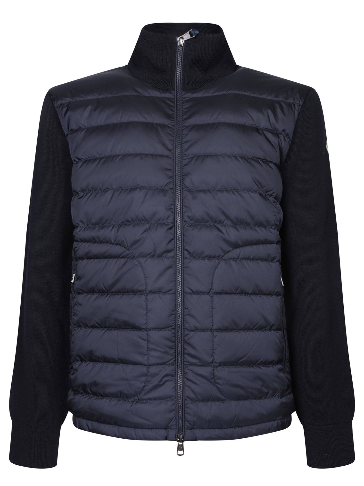 Jacket with knit sleeves, padded body. Zip front closure. High collar.