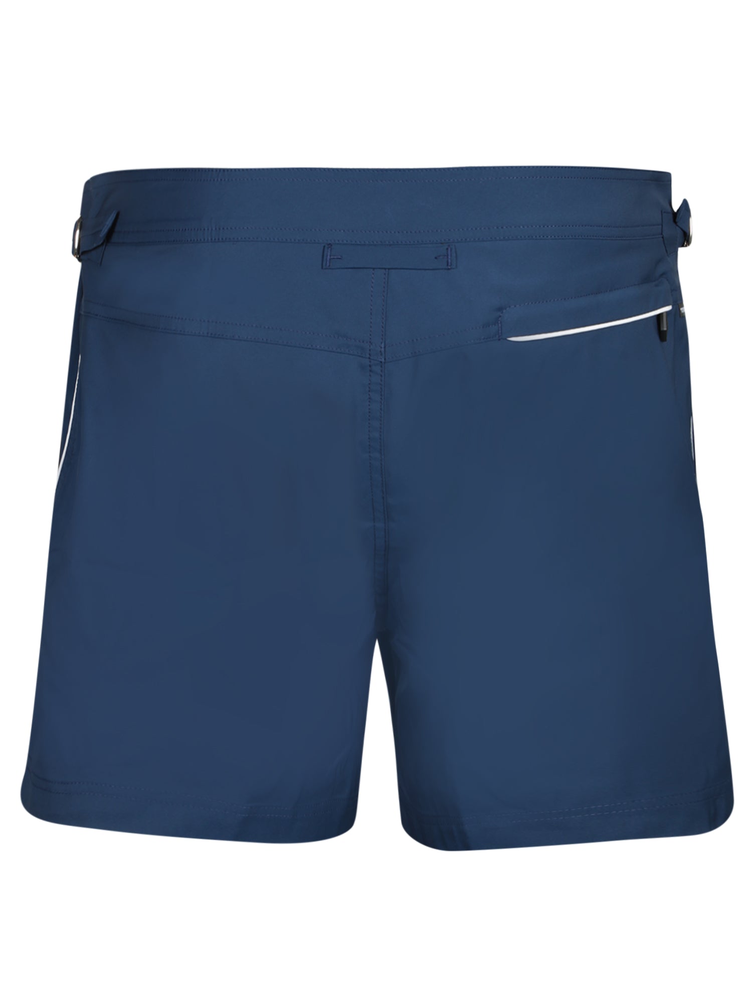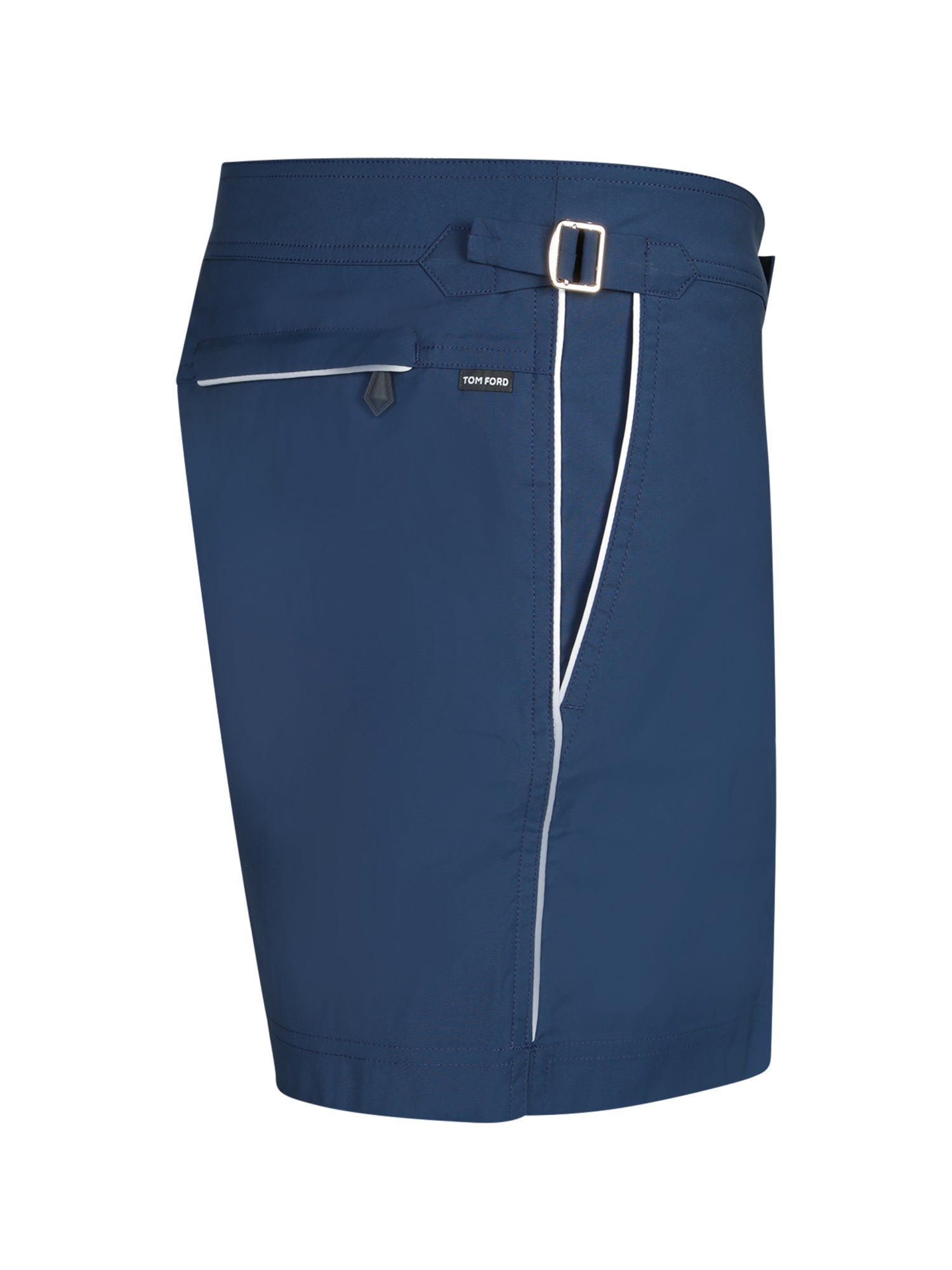 Designed for sophisticated beachwear, these Tom Ford swim shorts feature a refined blue hue with white piping details. Perfect for those who seek style and comfort.