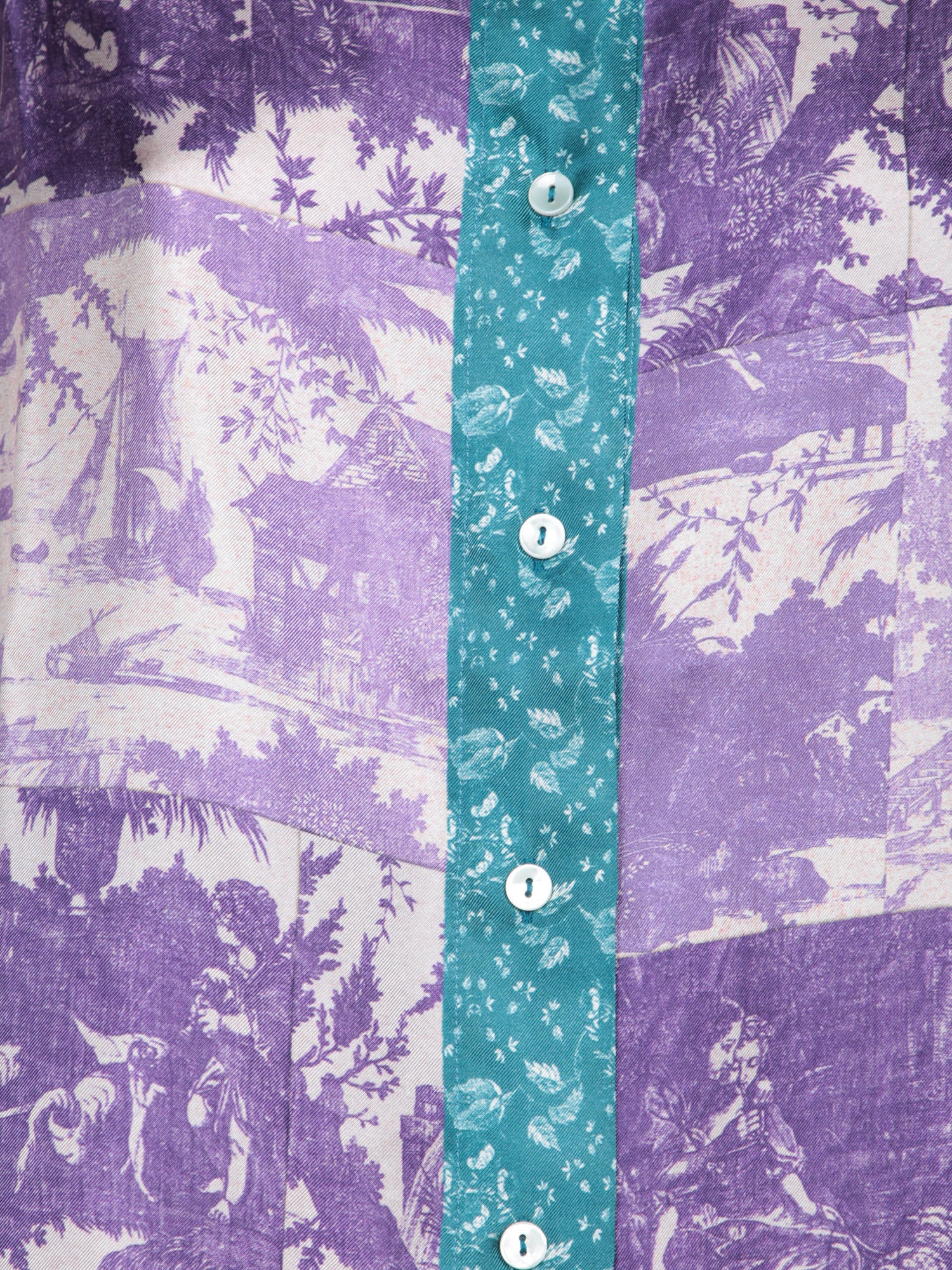 This elegant silk duster by Pierre-Louis Mascia features a bold mix of prints in shades of purple and blue. The modern design and fluid silhouette make it perfect for a sophisticated yet contemporary look.
