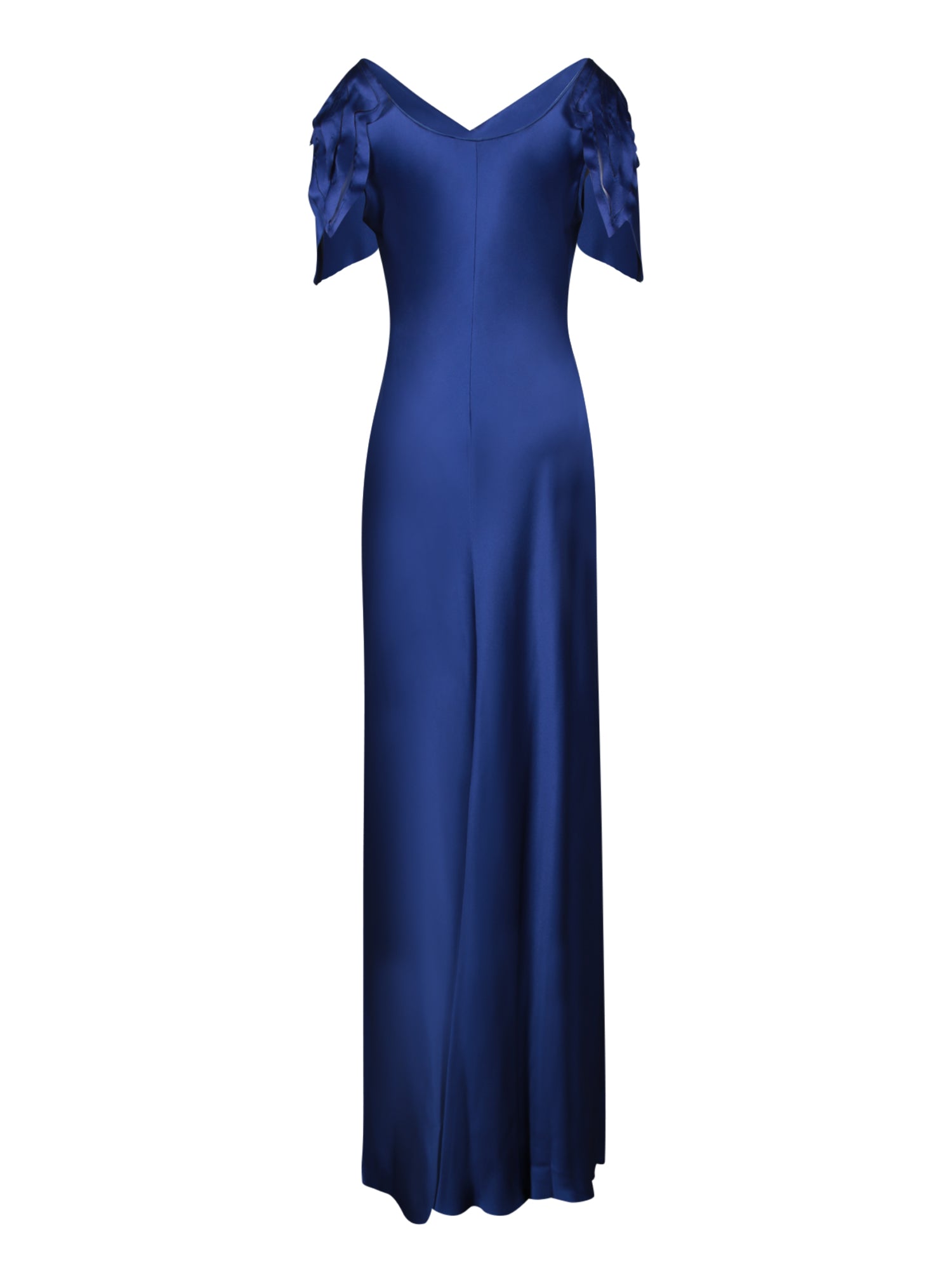 Long blue satin dress with gathered short sleeves and sweetheart neckline.