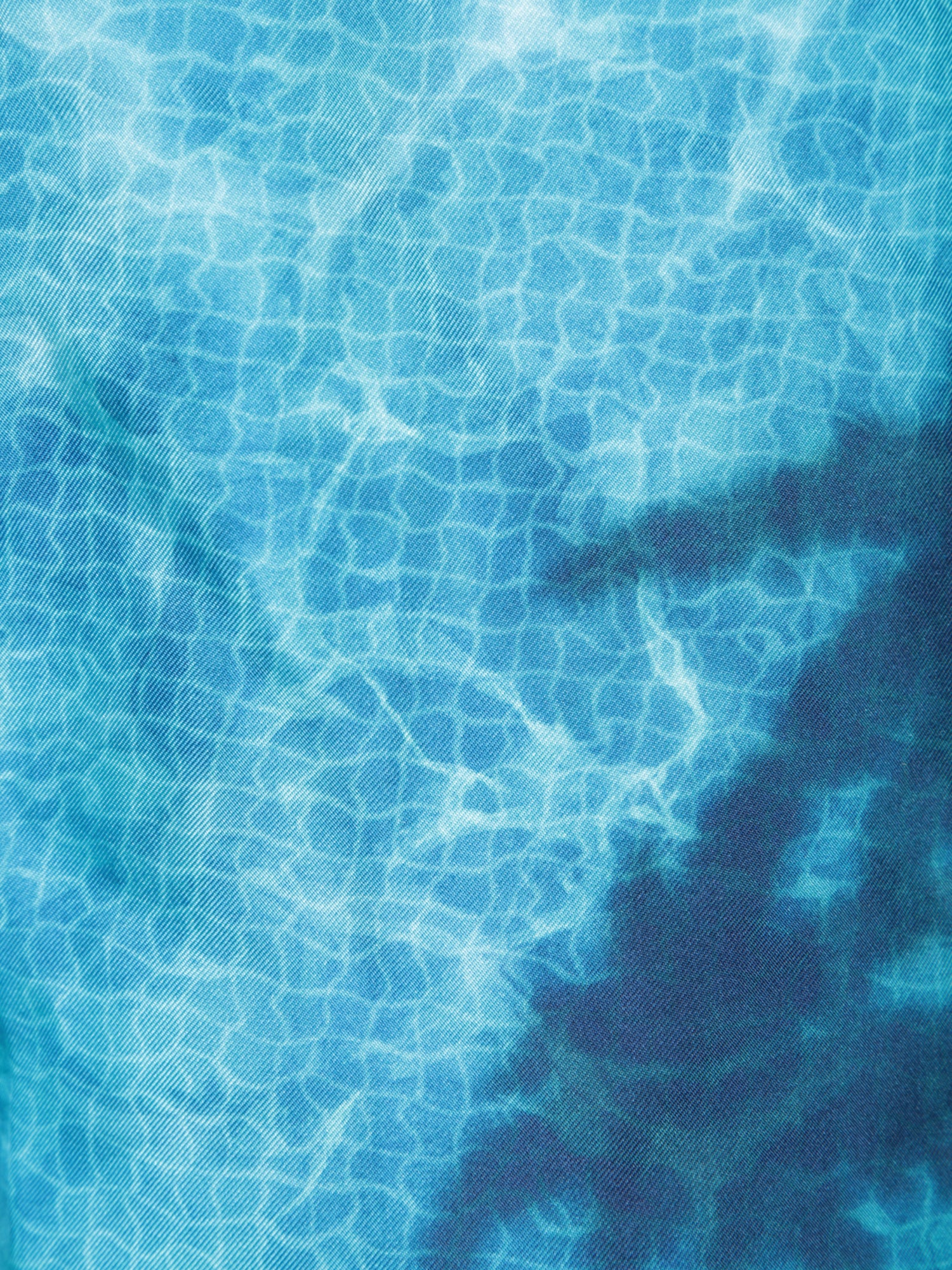 Lightweight silk Bermuda shorts. Elastic waistband with drawstring. Blue tropical pattern.