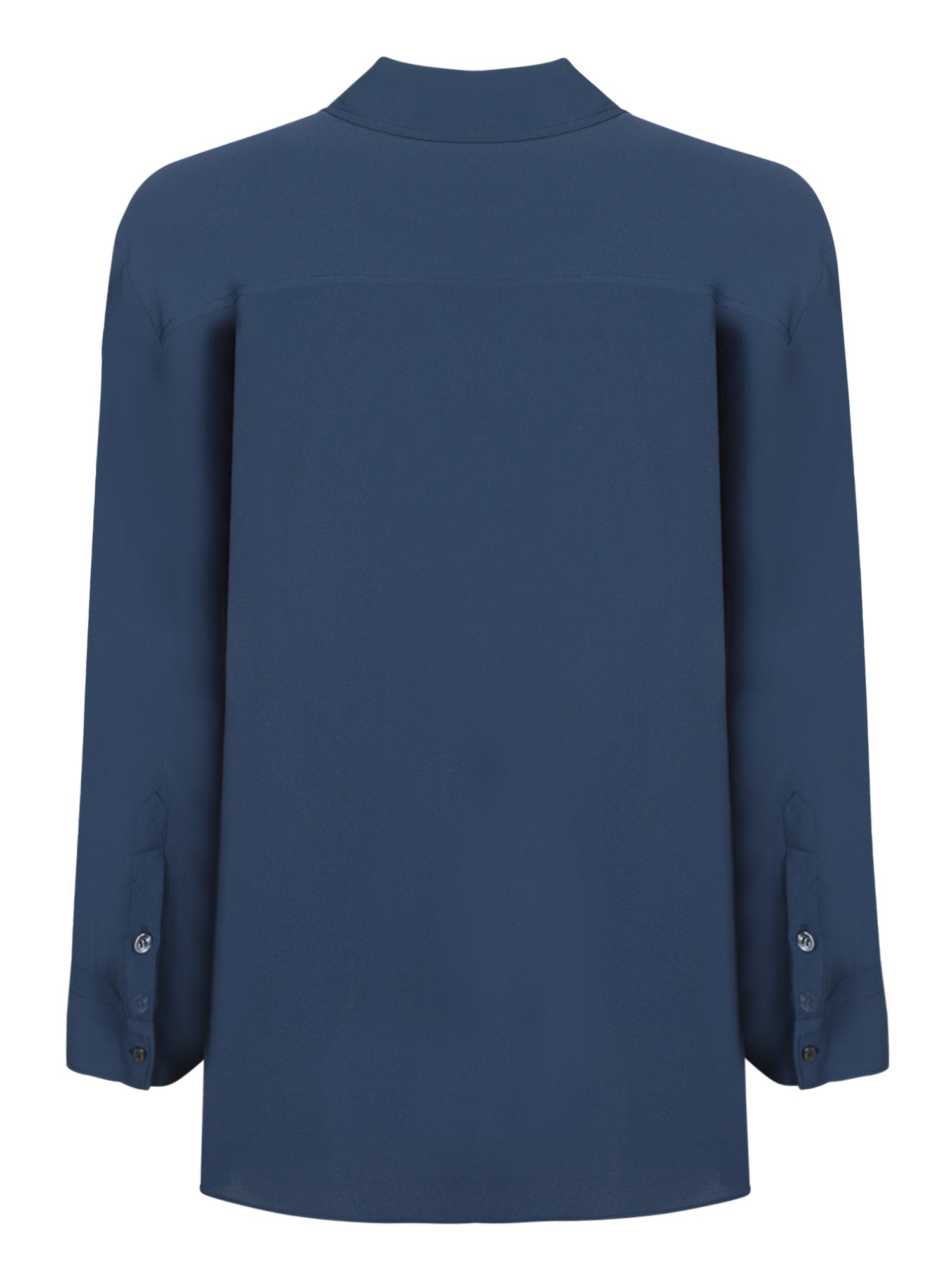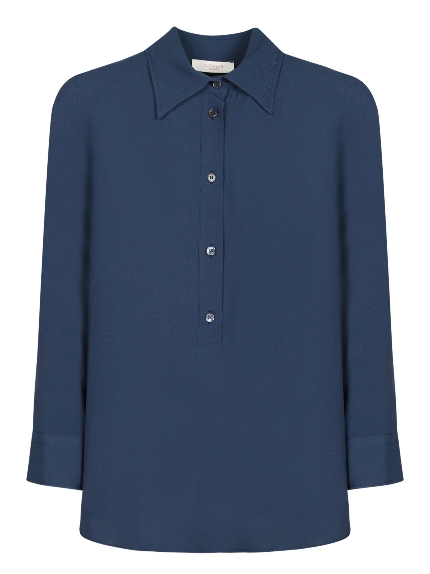 This elegant blue silk blend blouse by Incotex features a minimalist design with a pointed collar and hidden buttoning that enhances the fluid silhouette, making it ideal for a chic business look.