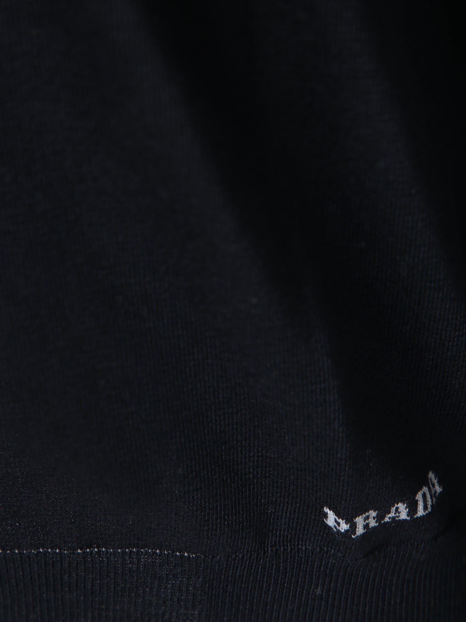 This PRADA pure blue silk sweater delivers an unmatched luxury experience with its minimalist design enhanced by ribbed details and a small logo on the cuff for a distinctive touch.